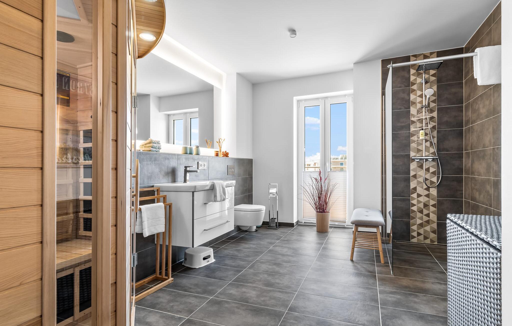 Angrenzend an die Schlafzimmer findet ihr das Duschbad. Neben allem Nützlichen sorgen die bodengleiche Regendusche und eure eigene Infrarot-Wärmekabine für maximalen Urlaubskomfort.