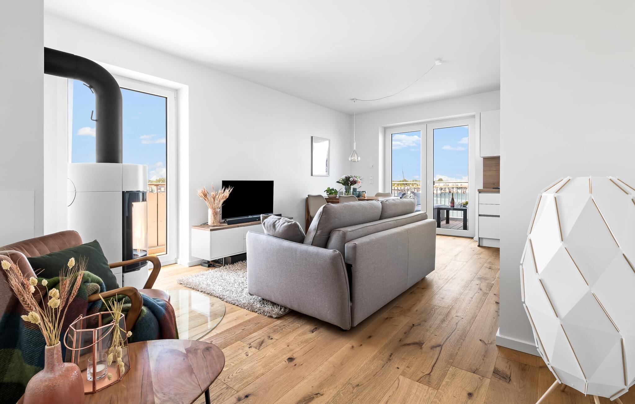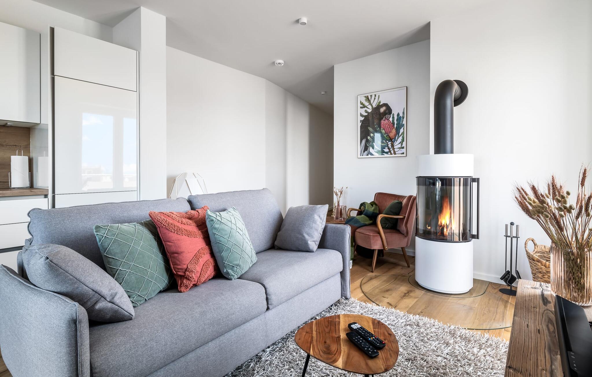 Ebenfalls im Wohnbereich findet man ein weiteres Highlight: Wenn die Sonne untergeht und die Temperaturen abkühlen, sorgt der Kaminofen dafür, dass es weiterhin warm und vor allem gemütlich bleibt. Entscheidet euch zwischen prasselndem Kaminfeuer oder Unterhaltung durch den Smart TV mit Möglichkeit zur Nutzung diverser Streaminganbieter. Für Indoor-Entertainment ist in jedem Fall gesorgt.