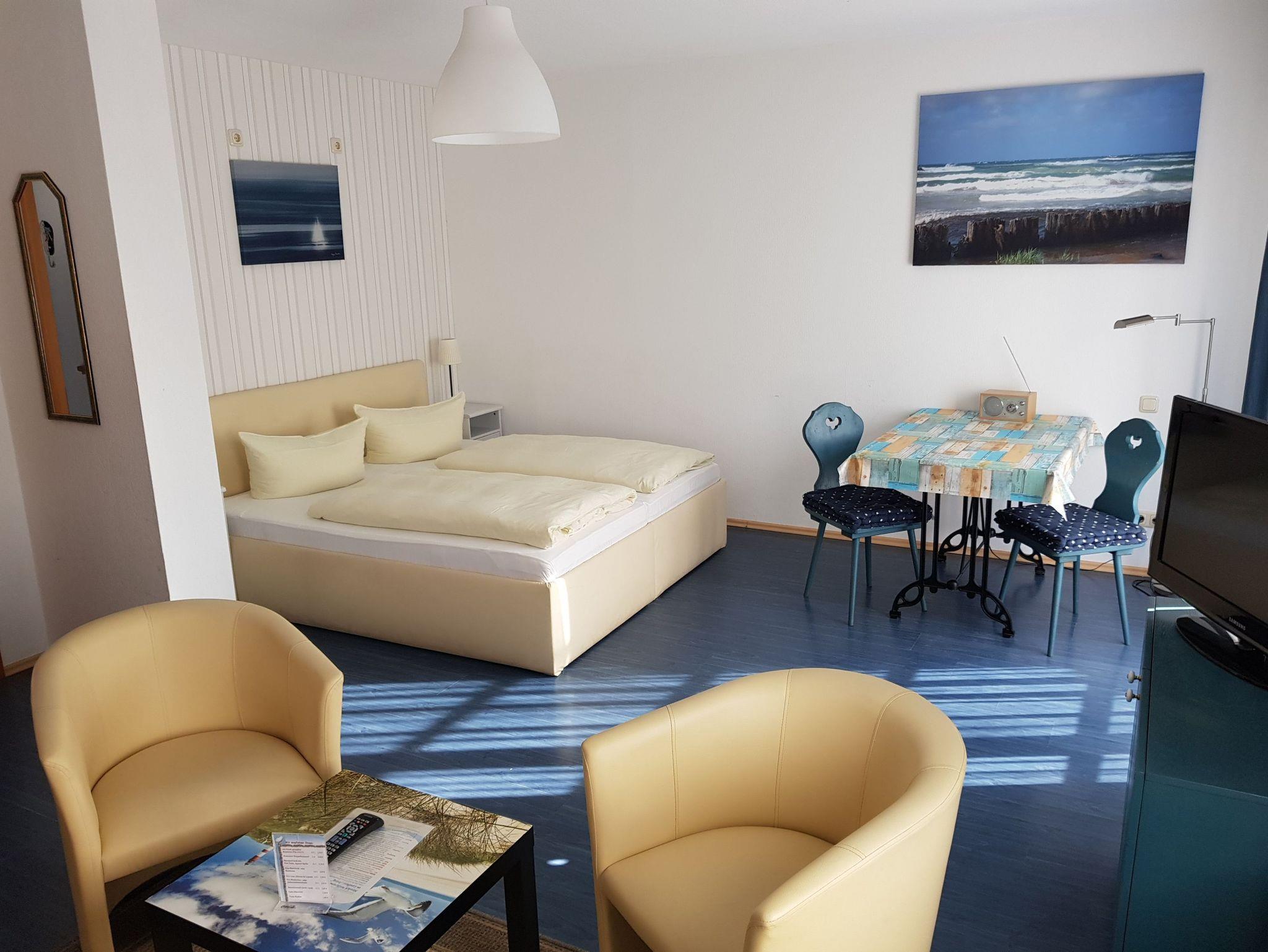 Die 2-Zimmer-Apartments haben neben dem Schlafzimmer ein kombiniertes Wohn-Schlafzimmer mit 2 Liegen oder einem 1,60m breitem Schlafsofa - hier können bis zu 4 Personen übernachten, zusätzlich wäre ein Kleinkind bis 3 Jahre im Babyreisebett auf Anfrage möglich.