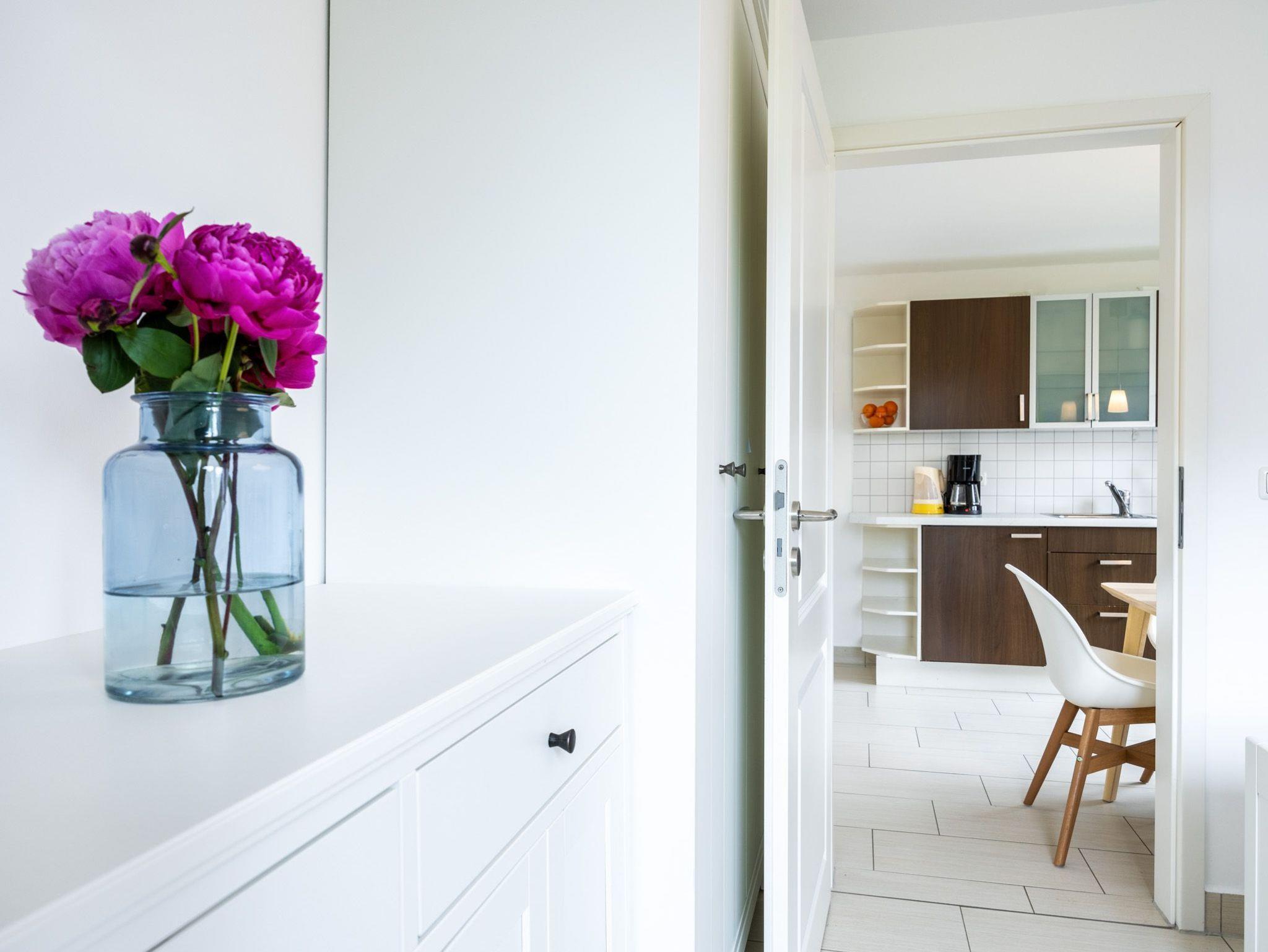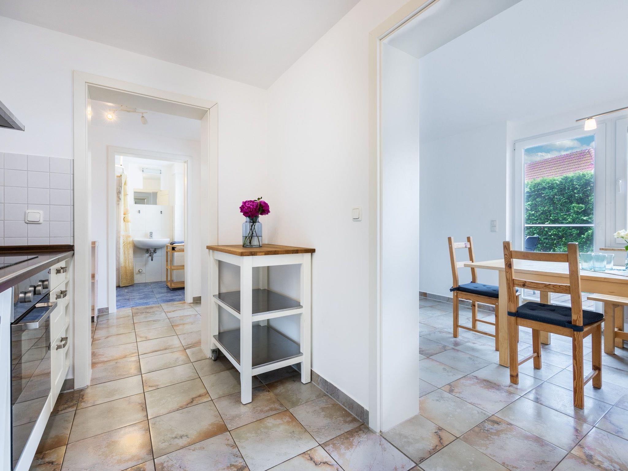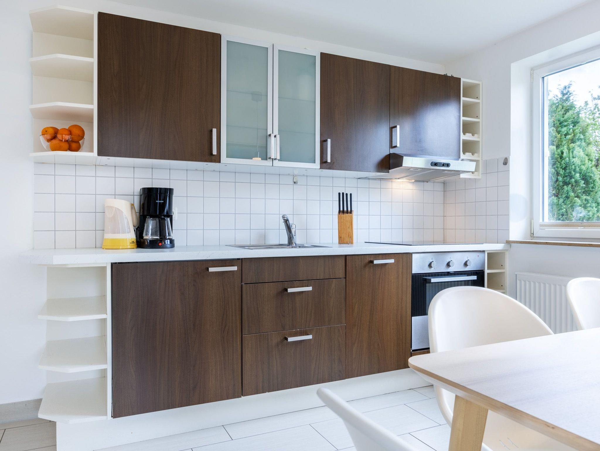 Wohnzimmer mit Sofaecke (Schlafsofa) und TV. Offene Küche mit 4- Platten Herd, Backofen, Geschirrspüler, Kaffeemaschine, Wasserkocher und Toaster, Esstisch. Schlafzimmer mit Doppelbett und Kommode, Bad mit Dusche und WC.