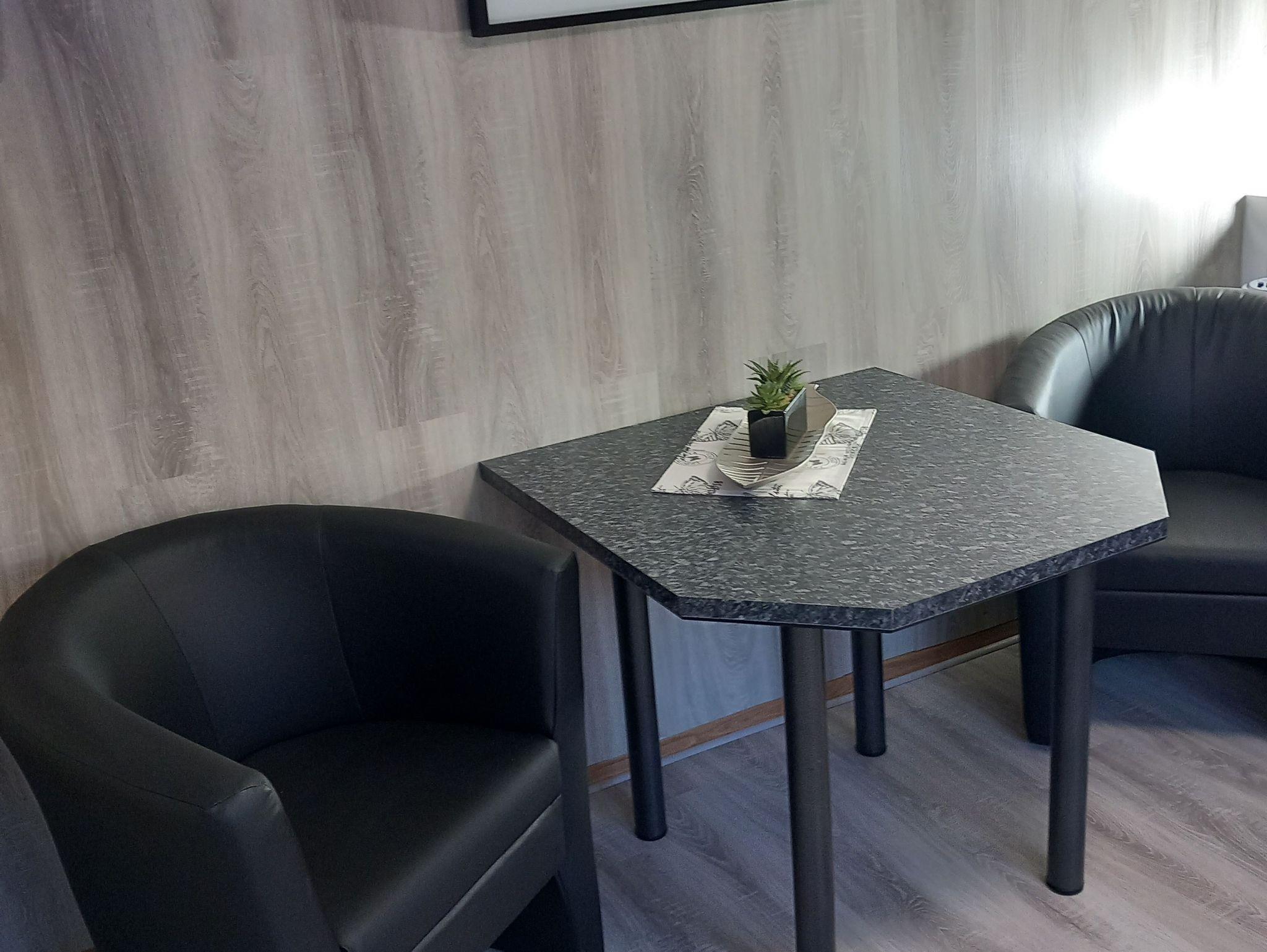 Komb. Wohnraum mit neuer Einbauküche (Kühlschrank mit Gefriermöglichkeit), 2 Clubsessel und Tisch, Fenster im Wohn- und Küchenbereich, moderner Waschtisch, neue Dusche-2023, WC mit Fenster
