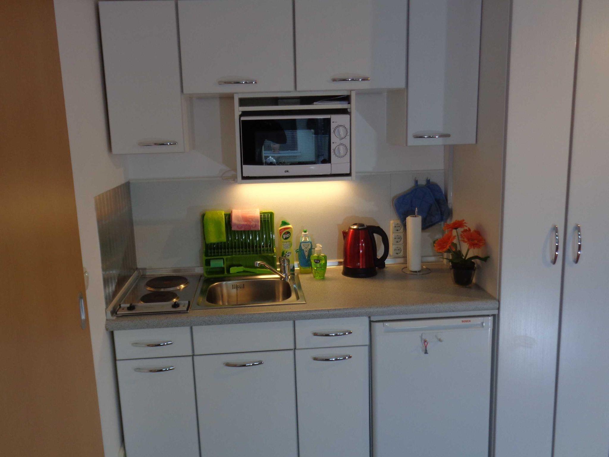 Kleine Ferienwohnung mit sep. Eingang auf eigenem Grundstück, in ruhiger, aber doch zentraler Lage im Grünen mit Terrasse und Gartenmöbel (Grillmöglichkeit), ebenerdig., WLAN-kostenfrei, Kombination aus Wohn- und Schlafraum mit zwei Einzelbetten 90x200 (können auch zusammen gestellt werden), moderne Einbauküche, Mikrowelle, Kühlschrank, doppelte Kochstelle, Eierkocher, Toaster, Kaffeemasch. und Wasserkocher, Tisch mit 2 Cocktailsessel, Dusche und WC mit modernem Waschtisch