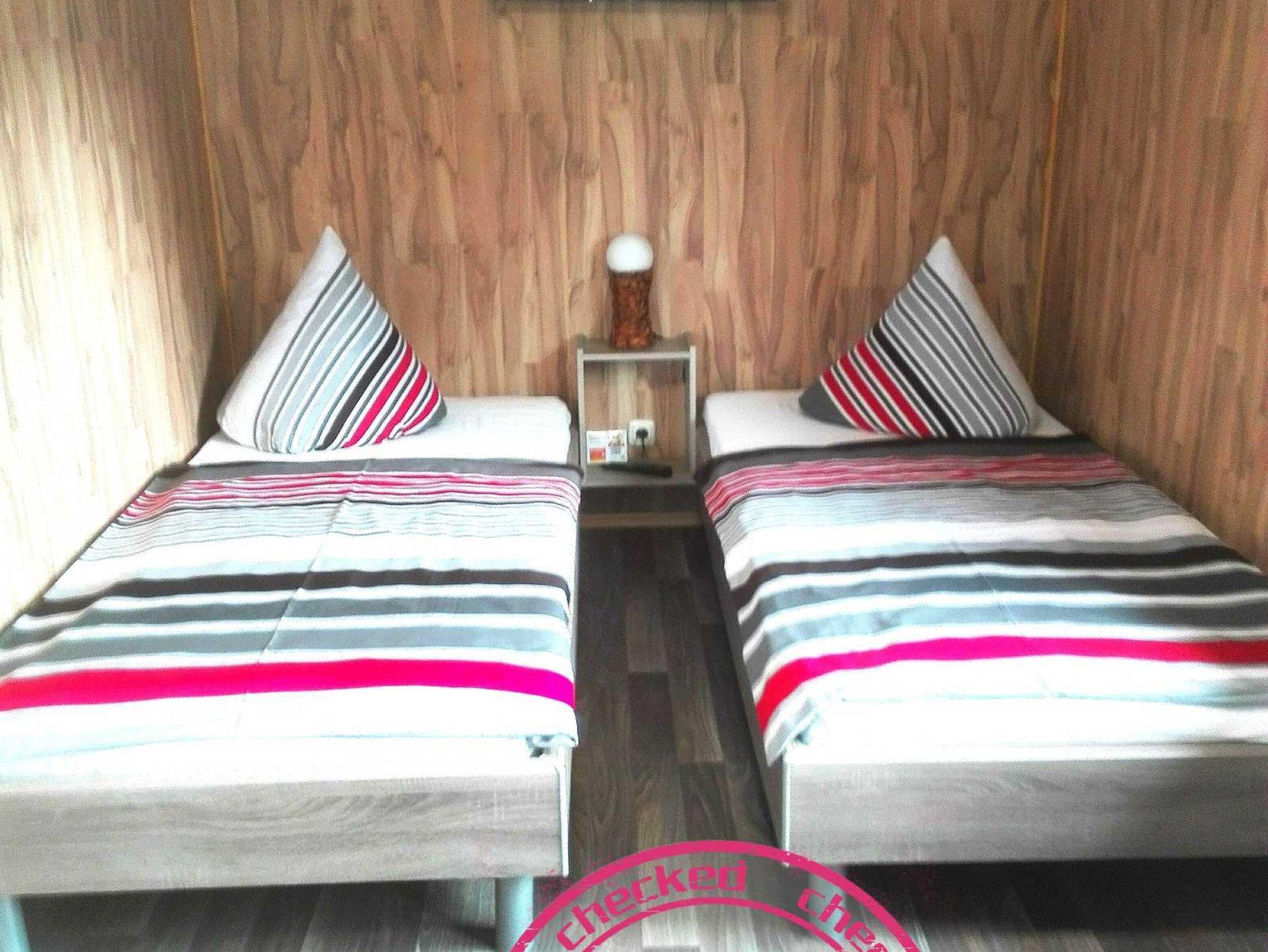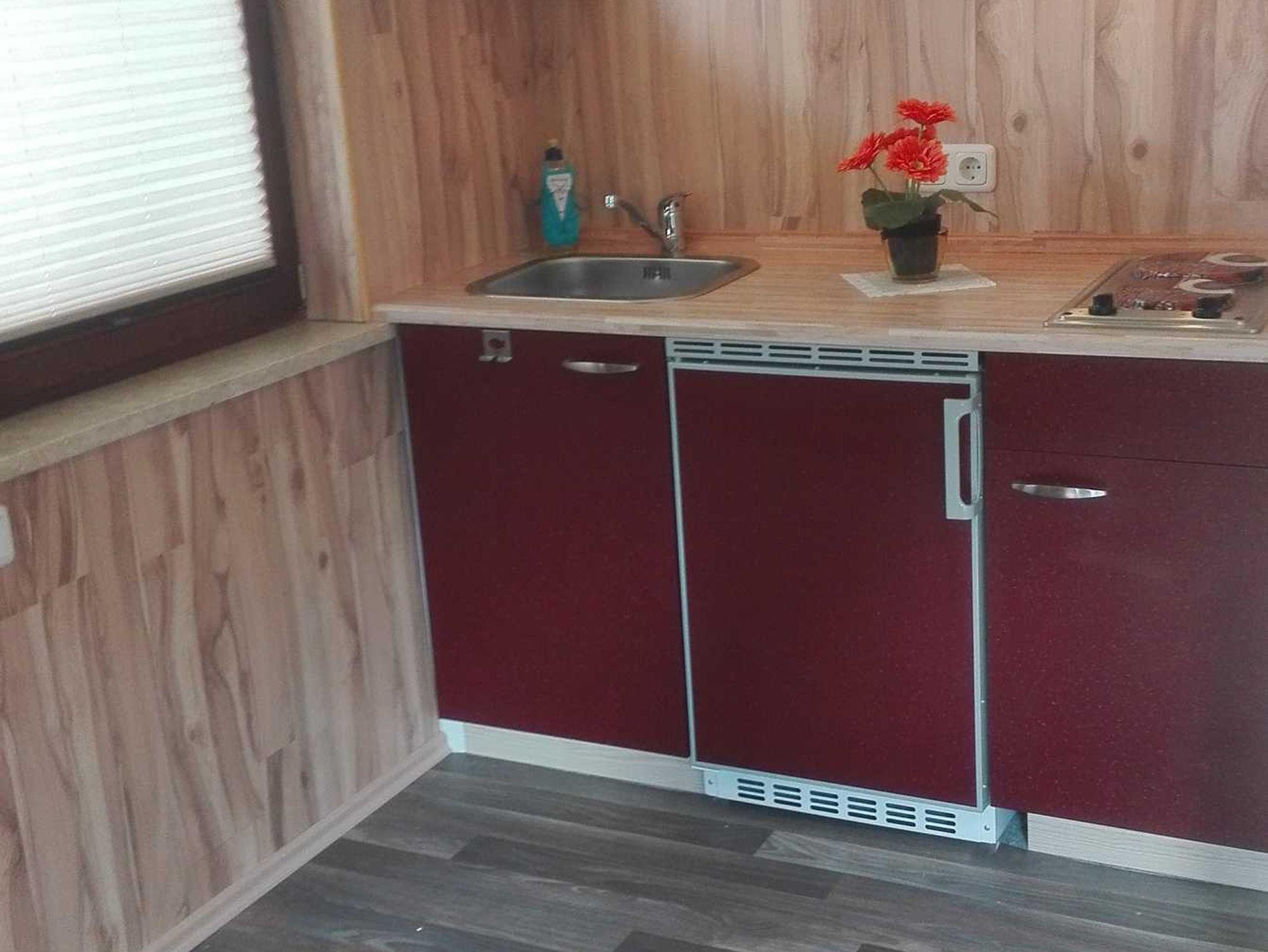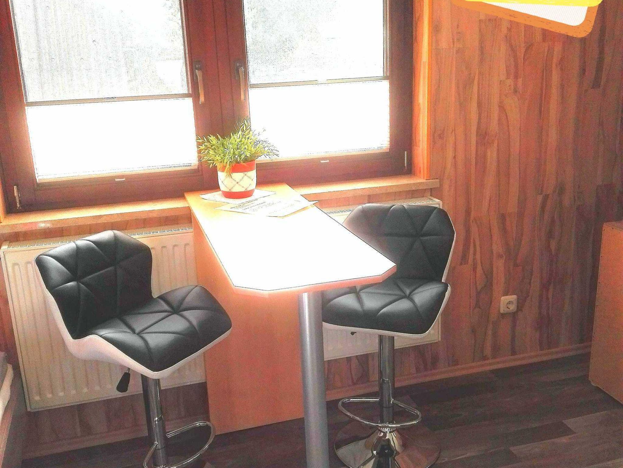 Kleine Ferienunterkunft mit sep. Eingang auf eigenem Grundstück, Sitzen im Grünen (Gartenmöbel vorhanden) in ruhiger, aber doch zentraler Lage, Terrasse, ebenerdig. Kombination aus Wohn- und Schlafraum mit zwei Einzelbetten 80x200, moderner Bartisch mit 2 Barhockern