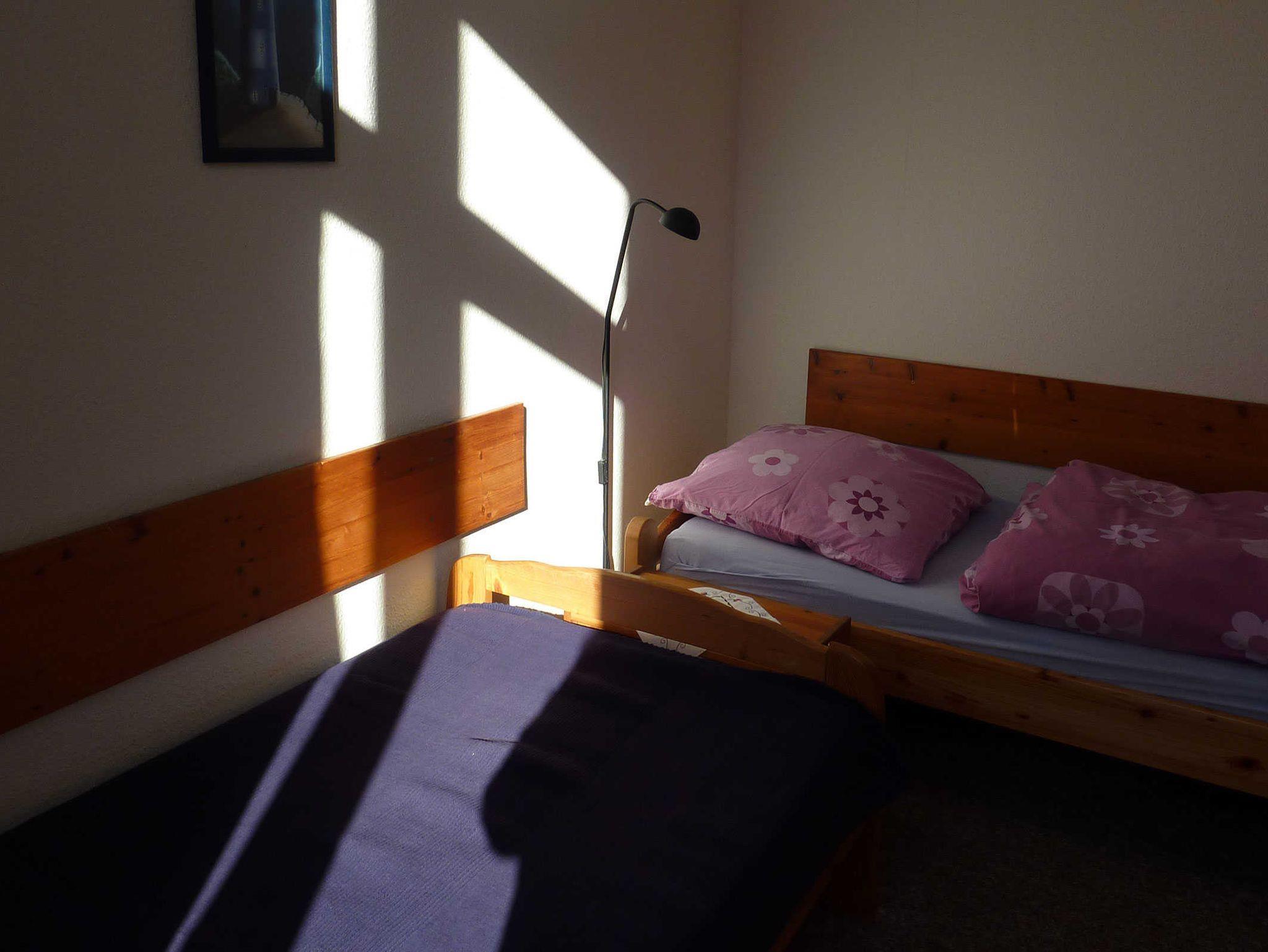 Eine Ferienwohnung bestehend aus 2 Zimmern, ein Schlafzimmer mit zwei getrennt stehenden Betten (je 90 x 200), ein Wohnzimmer mit einer Doppelbettcouch (145 x 195), Küche, DU/ WC, Waschmaschine.