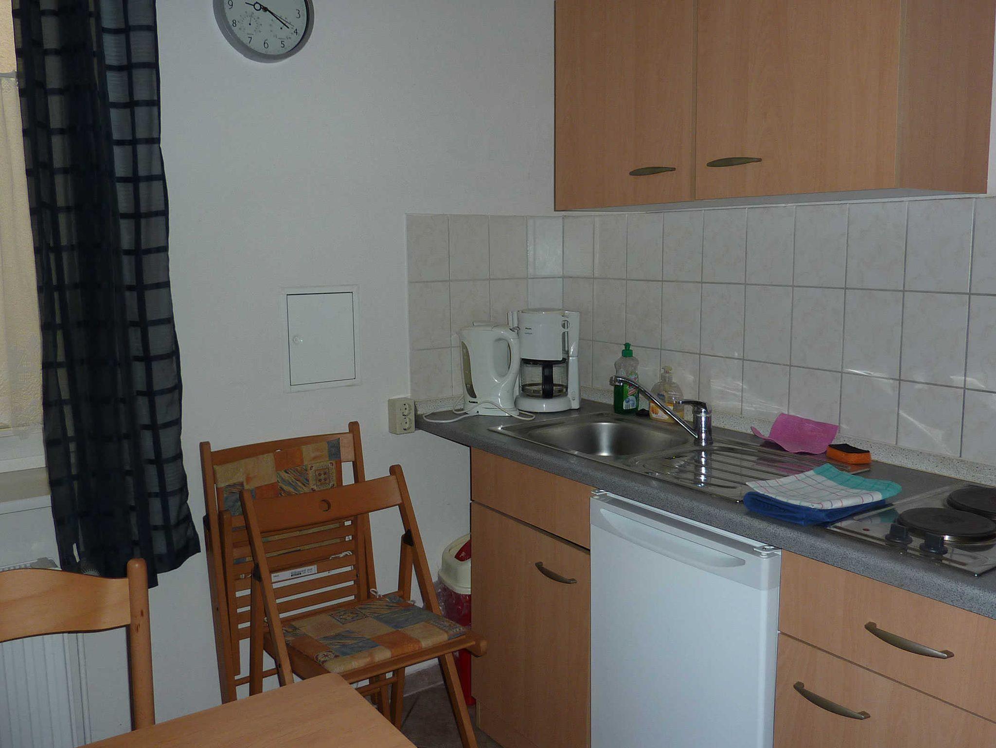Ferienwohnung bestehend aus zwei Zimmern, Hochparterre, ca. 40 qm, ein Schlafzimmer mit Doppelbett (140 x 200), Wohnzimmer mit Doppelbettcouch (145 x 195), Küche, Dusche/ WC mit Waschmaschine.