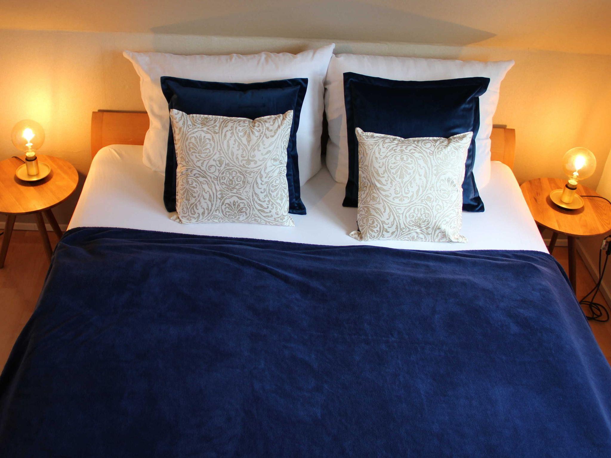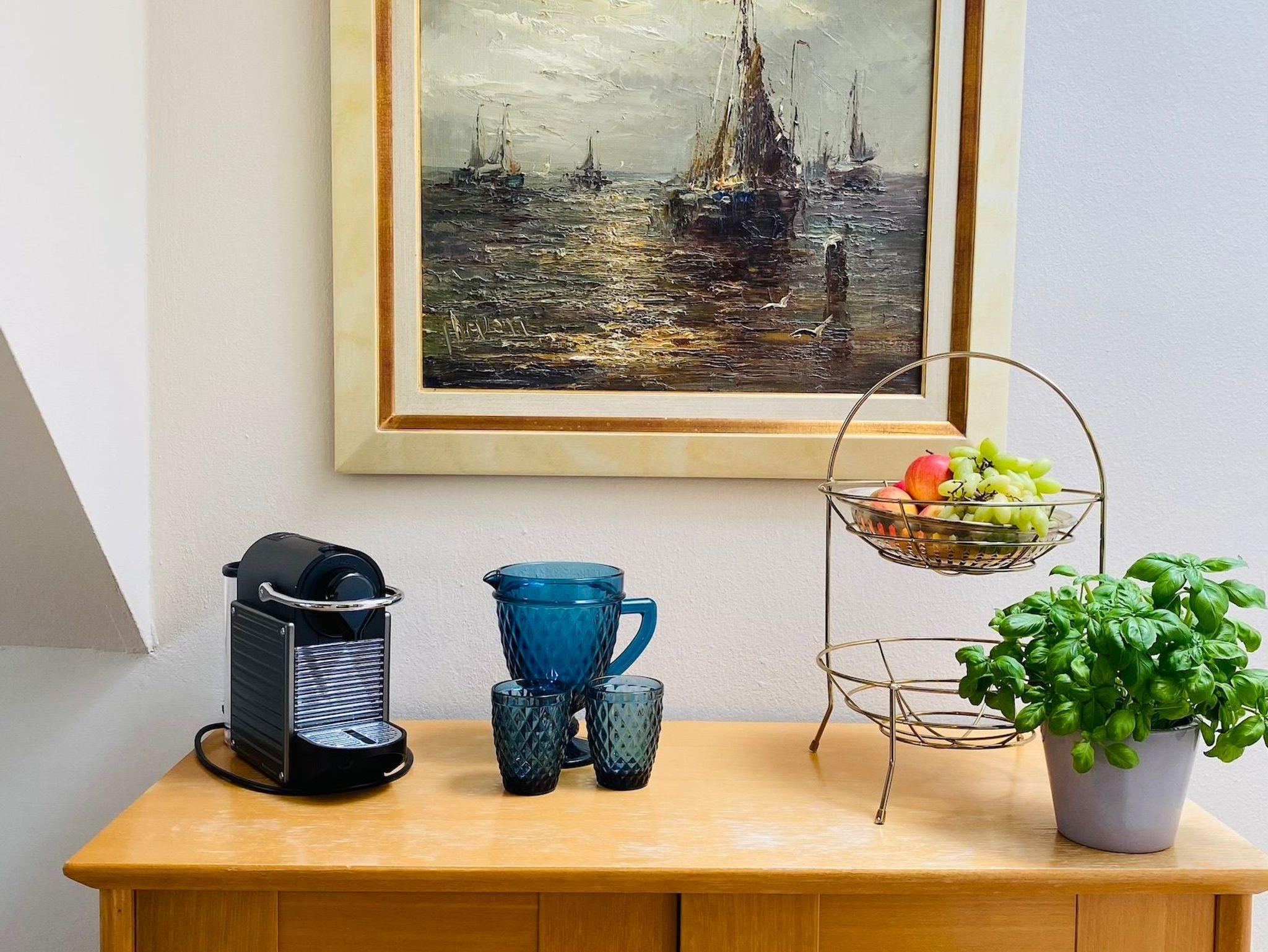 Doppelbett, Bettwäsche, Pantry Küche mit Kühlschrank & Herd, Duschbad mit Fön & Handtüchern, Smart - TV und Internet. Die Pantryküche ist mit Geschirr, Gläsern, Besteck, Töpfen und einer Pfanne, einer Kaffee- und einer Nespressomaschine, Toaster, Wasserkocher und anderen Gebrauchsgegenständen ausgestattet.
