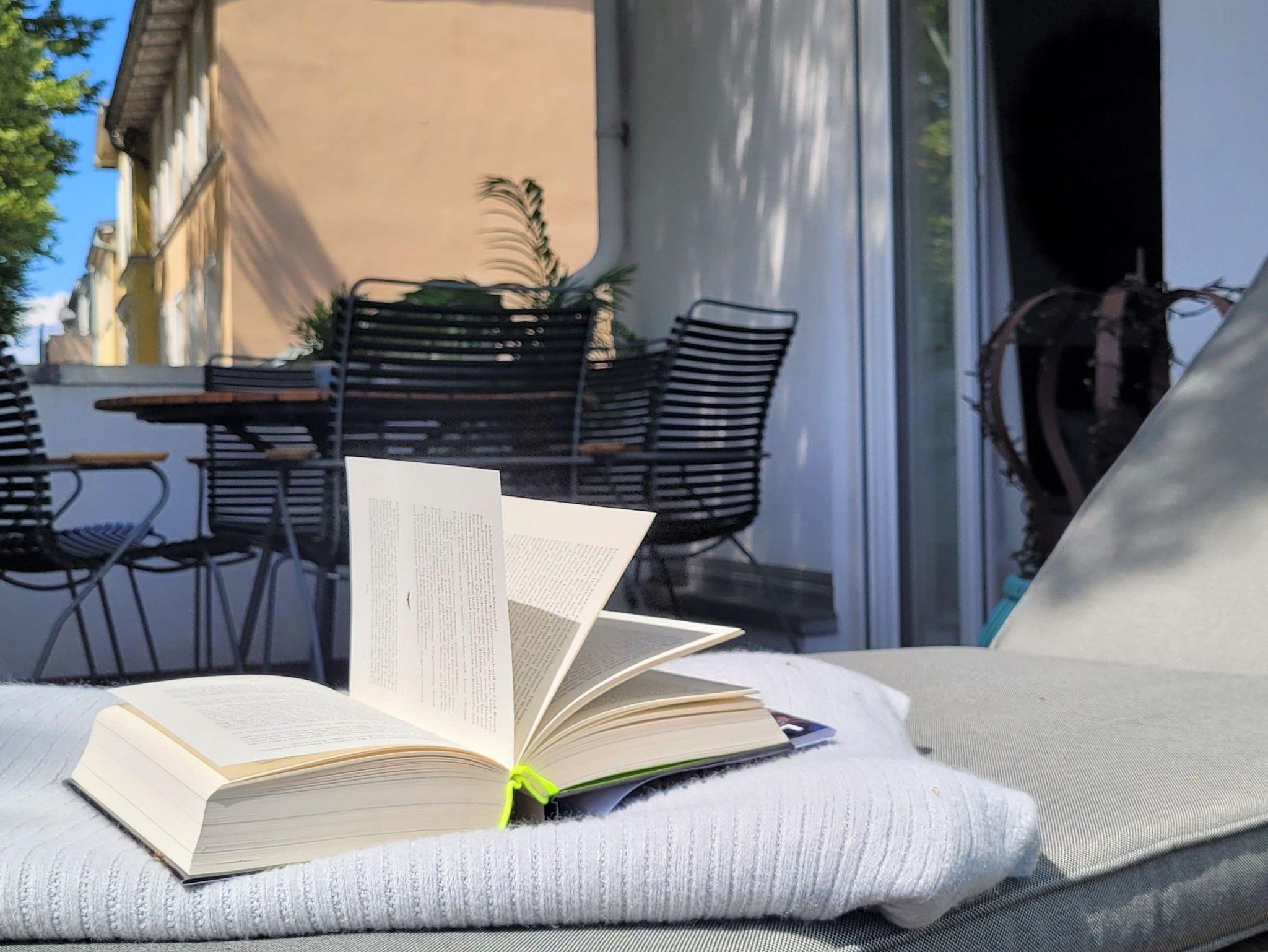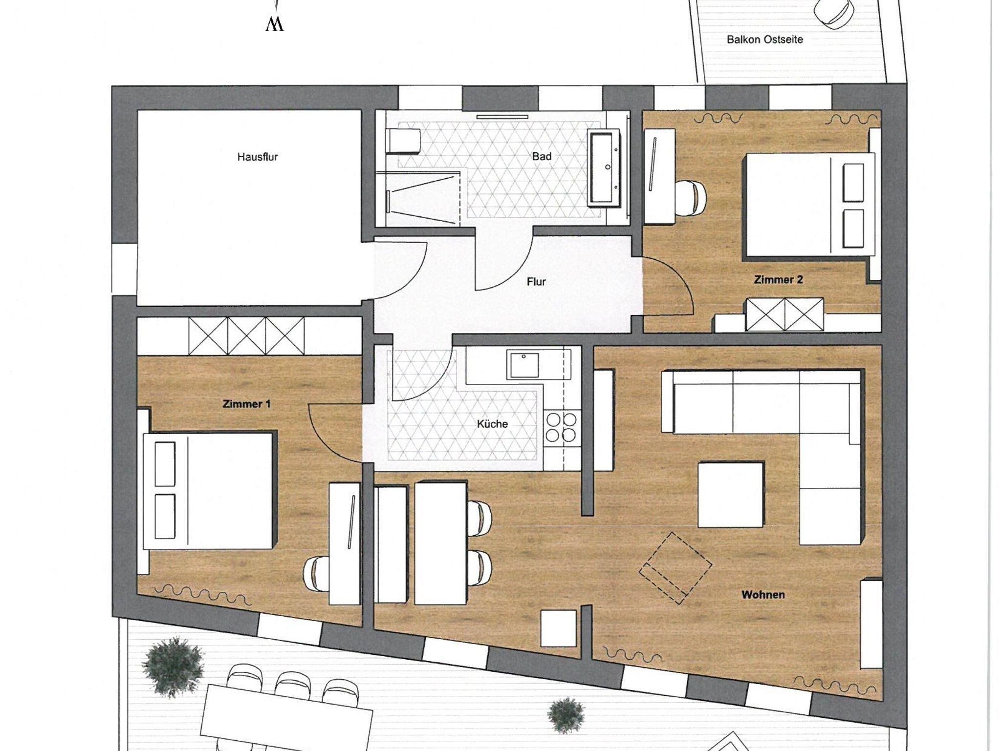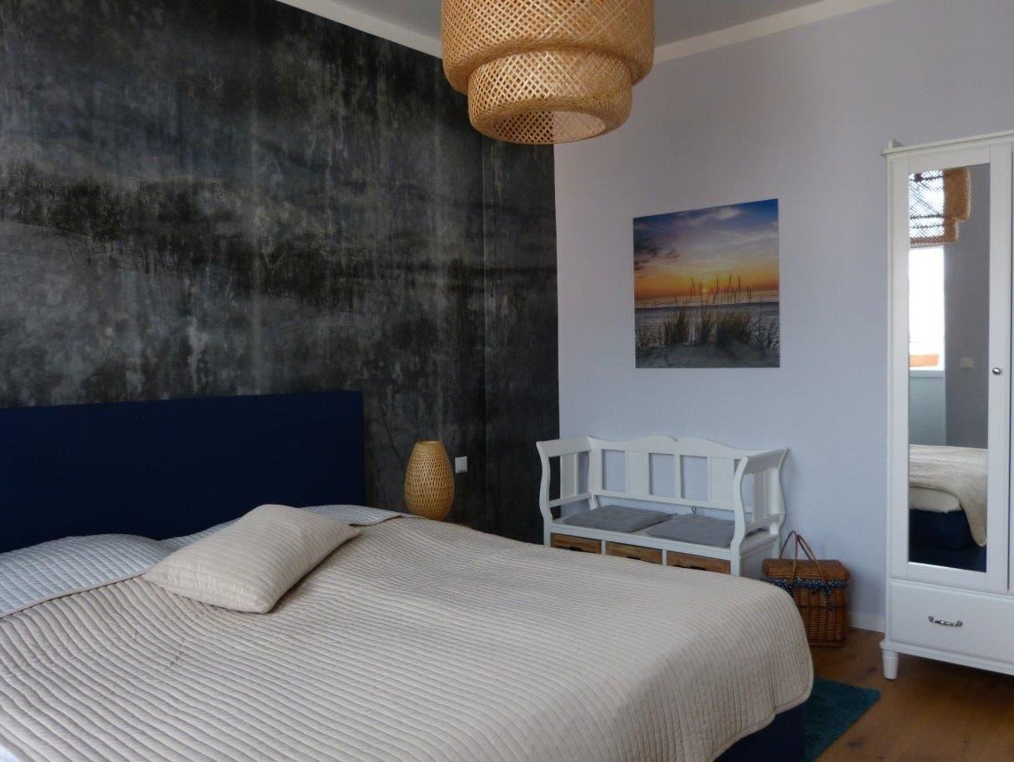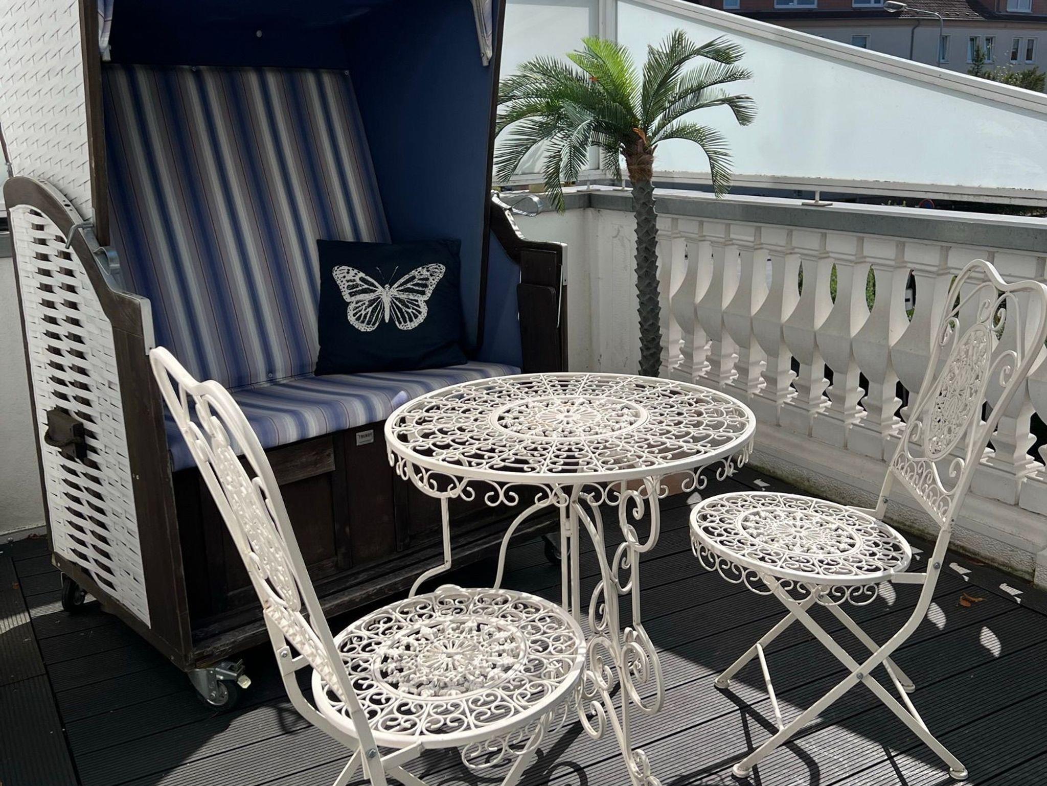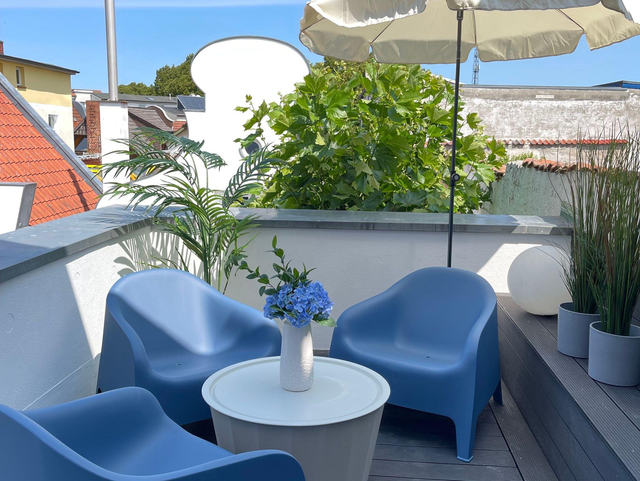 Modern renovierte Wohnung mit großer Terrasse in Warnemündes Altstadt, ideal für Strandnähe und entspannten Urlaub.