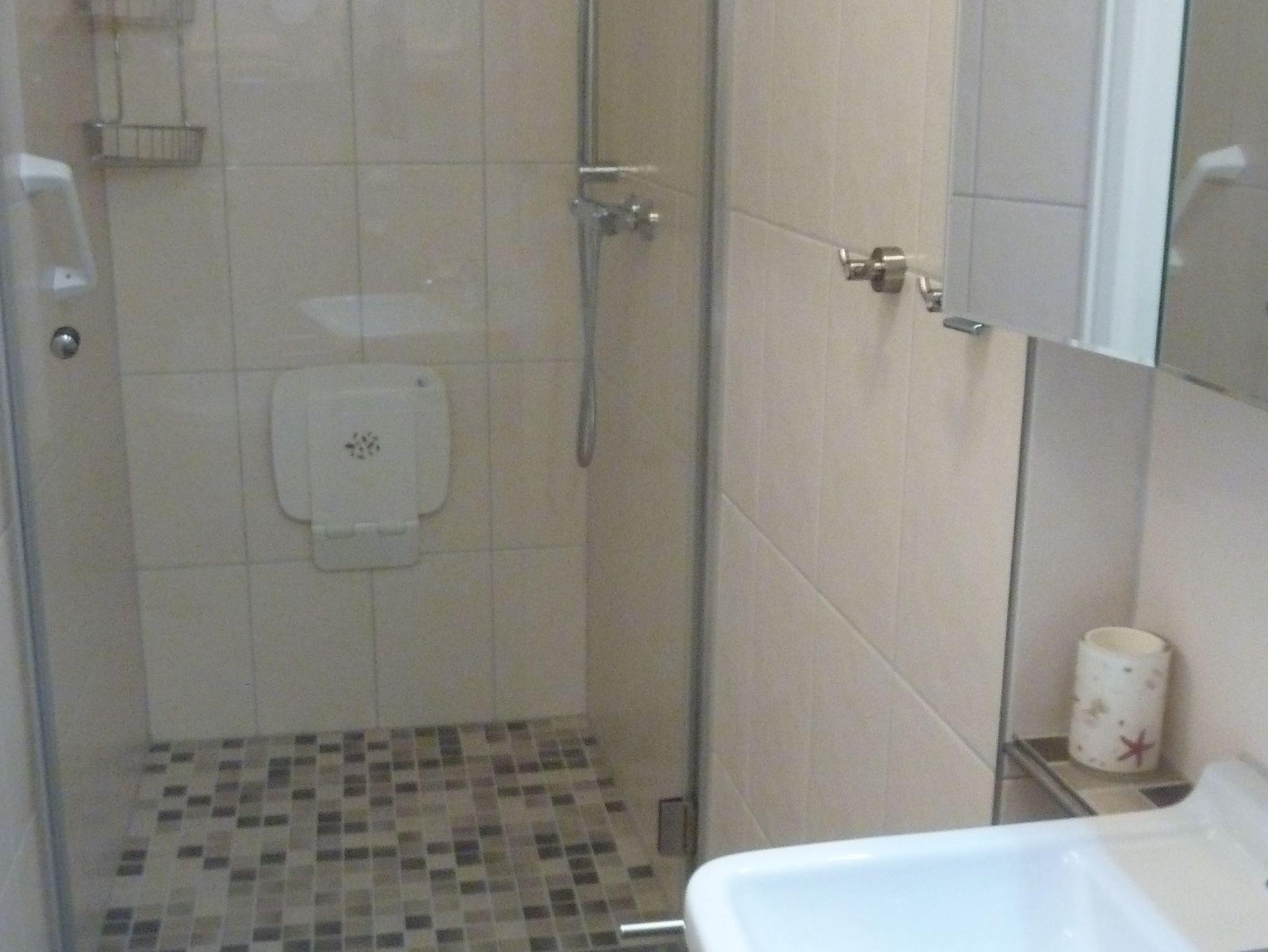 Das Badezimmer verfügt über eine begehbare Dusche mit Sitz und Waschbecken ohne Unterschrank.