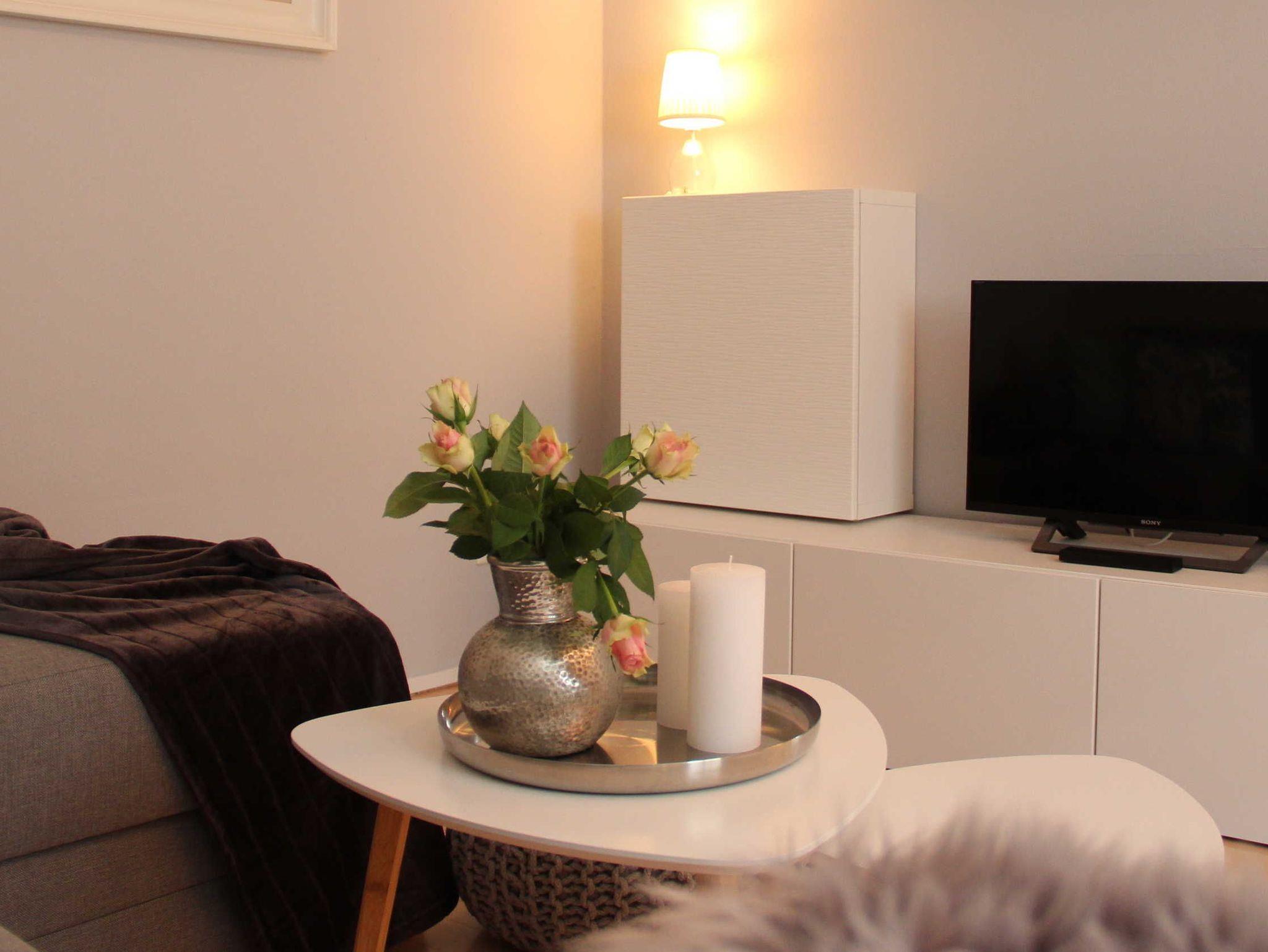 Doppelbett mit Bettwäsche, Pantry - Küche mit kleinem Kühlschrank & Herd, Bad mit Dusche/WC, Fön und Handtüchern. Es gibt einen Smart TV, WLan, einige Bücher und Spiele. Die Pantry-Küche ist mit Geschirr, Besteck, Gläsern, einer Filterkaffee- und Nespressomaschine, einem Toaster, Wasserkocher und anderen Gebrauchsgegenständen ausgestettet. Im Wohnzimmer befindet sich eine Schlafcouch.