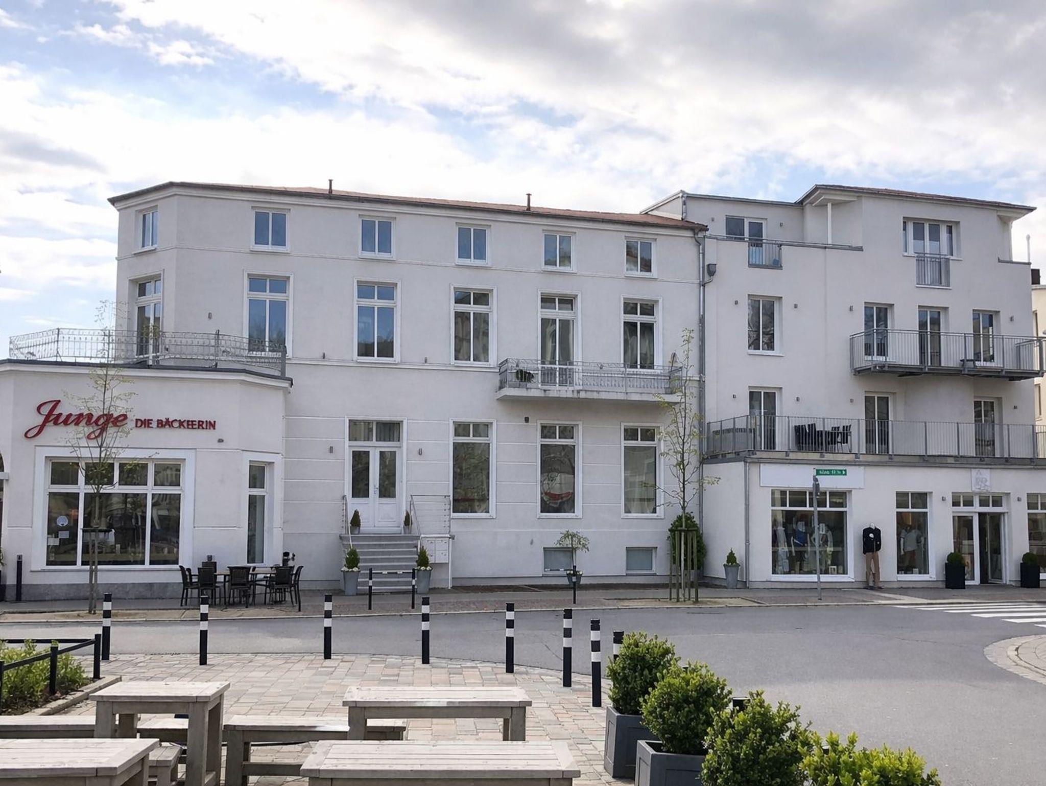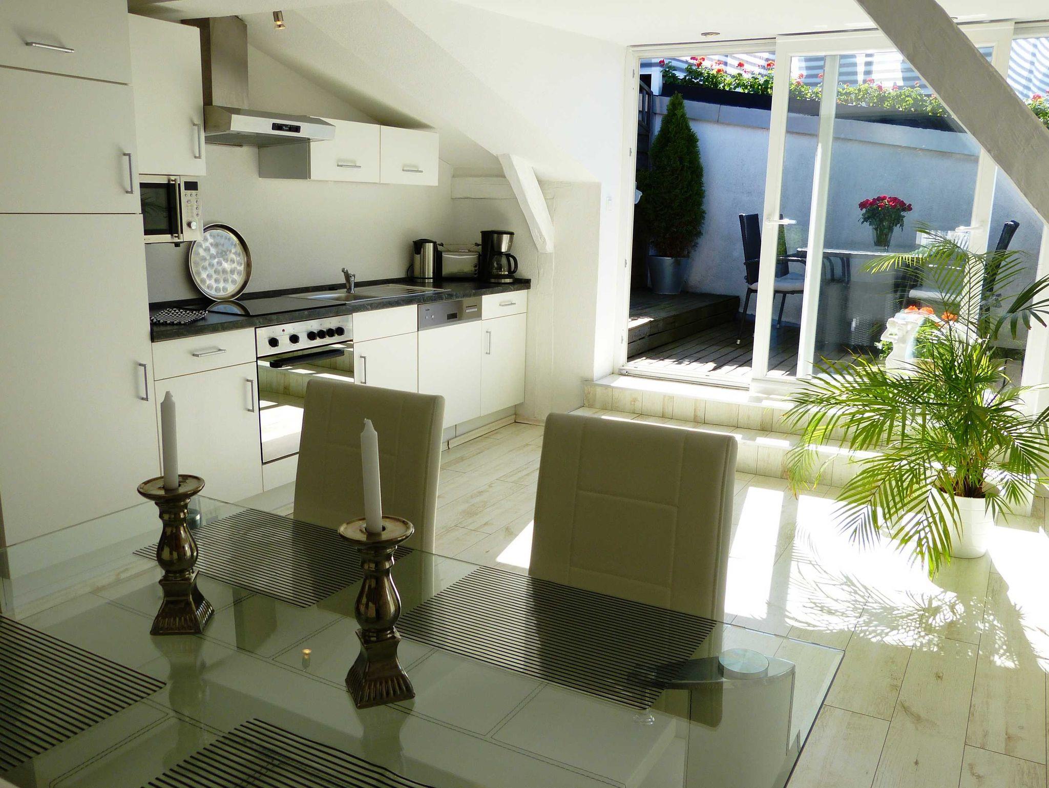 Exklusive Ferienwohnung am Kirchenplatz in Warnemünde, nahe Strand und Altstadt, mit stilvoller Einrichtung und Terrasse.