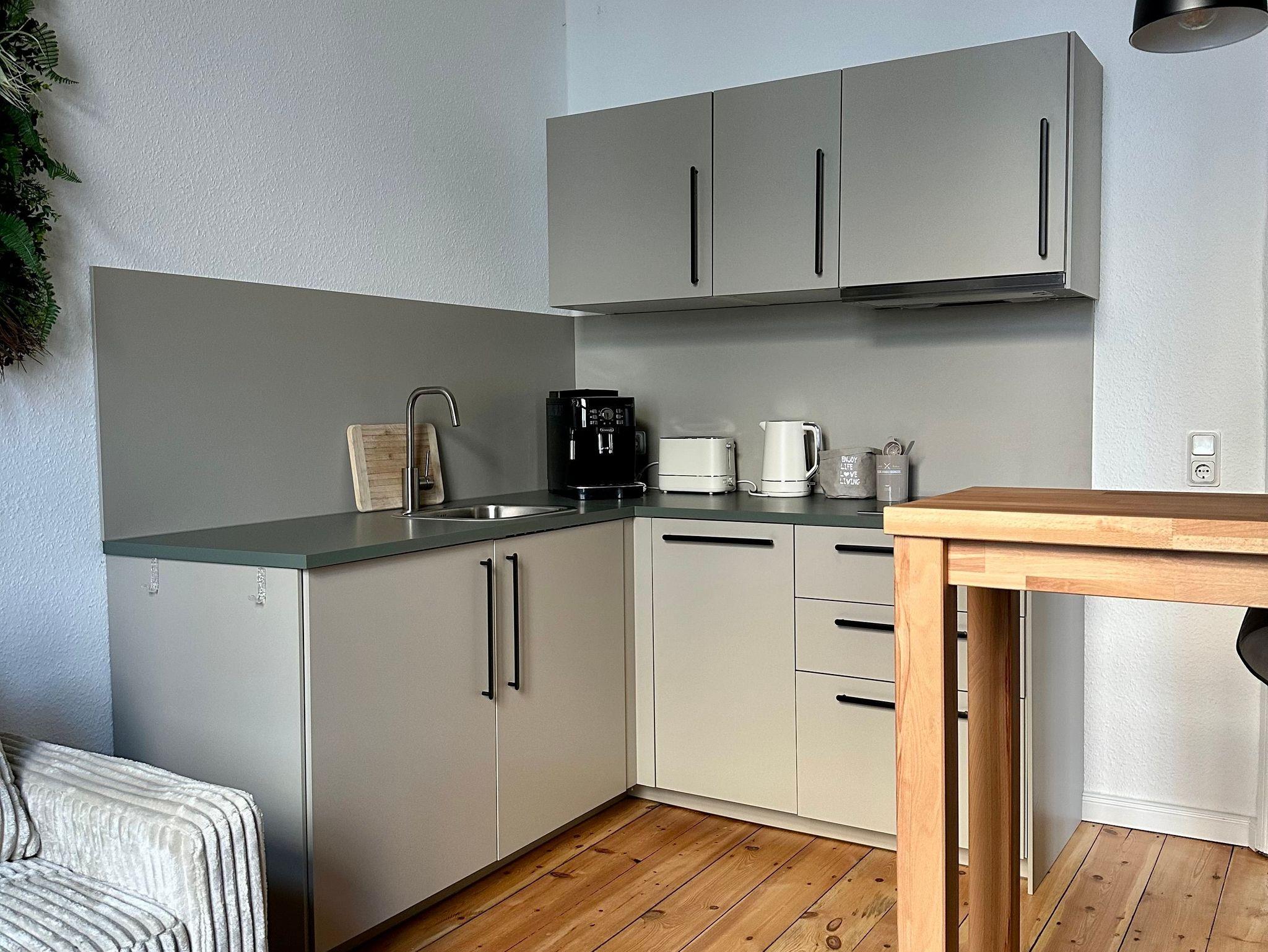 Kulinarik: Eine voll ausgestattete Küchenzeile (Kühlschrank, Mikrowelle, Kaffeemaschine, Wasserkocher u.v.m.).