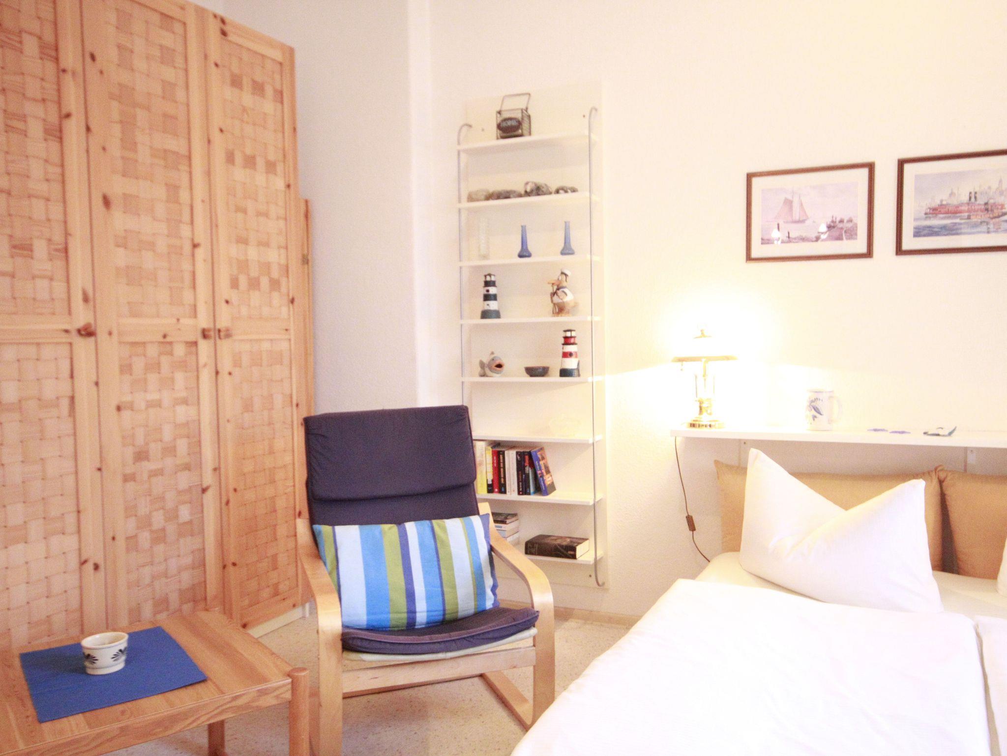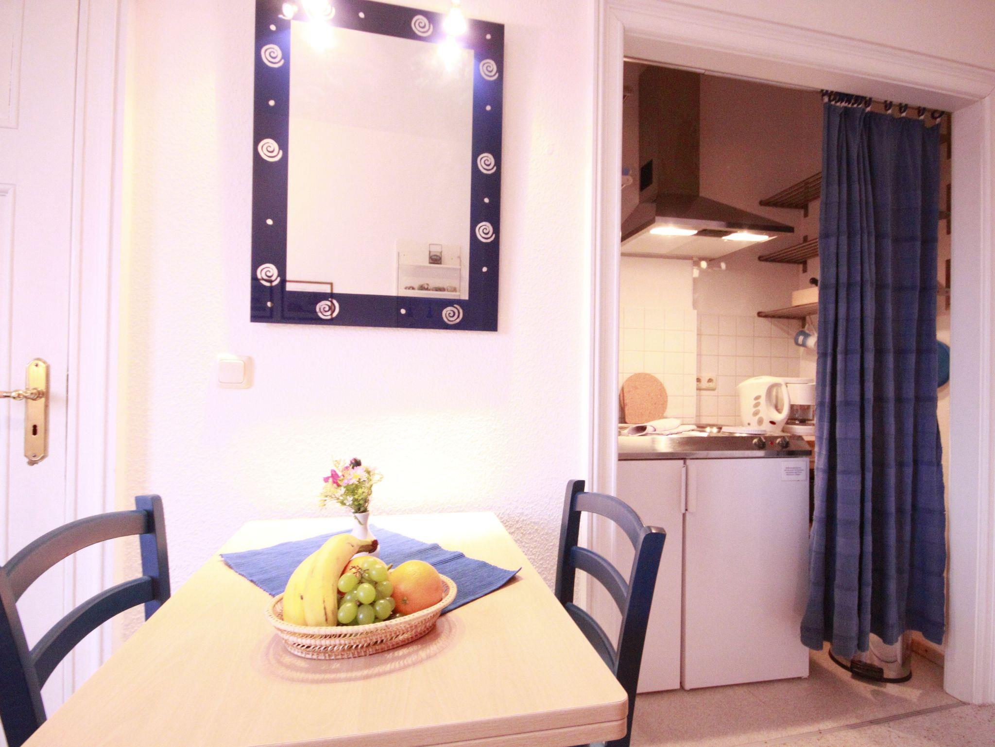 Helles gemütliches Ferienstudio für 2 Personen mit Schlafsofa, Dusche und WC und abgeteilter Pantryküche in maritimen Flair.