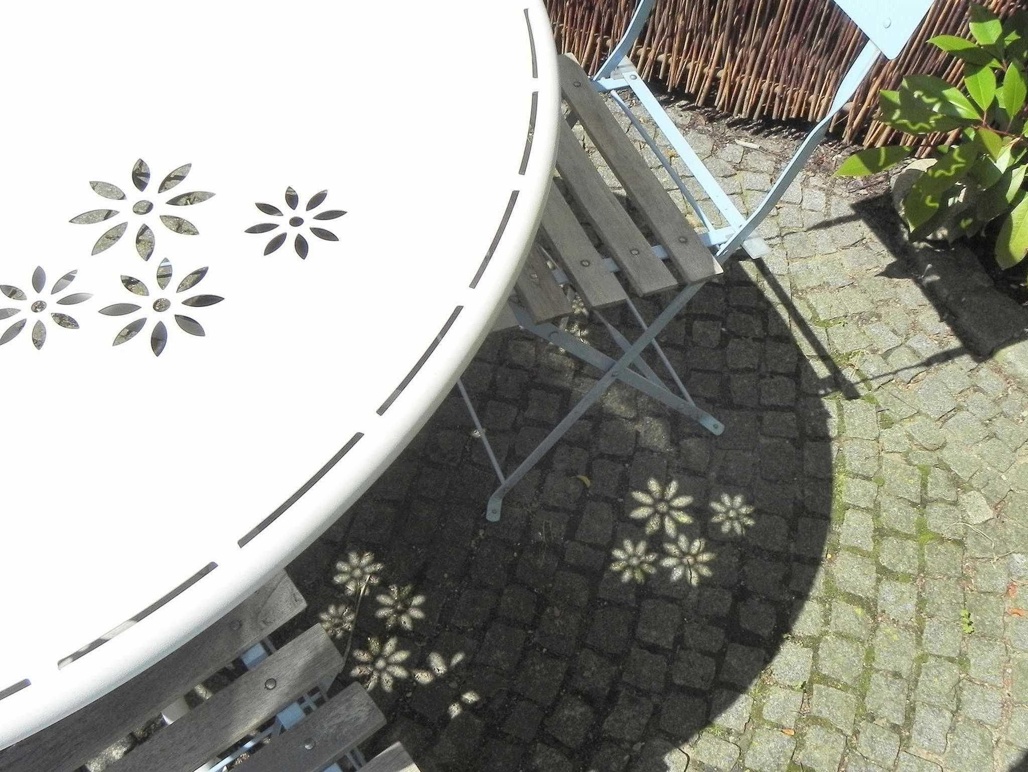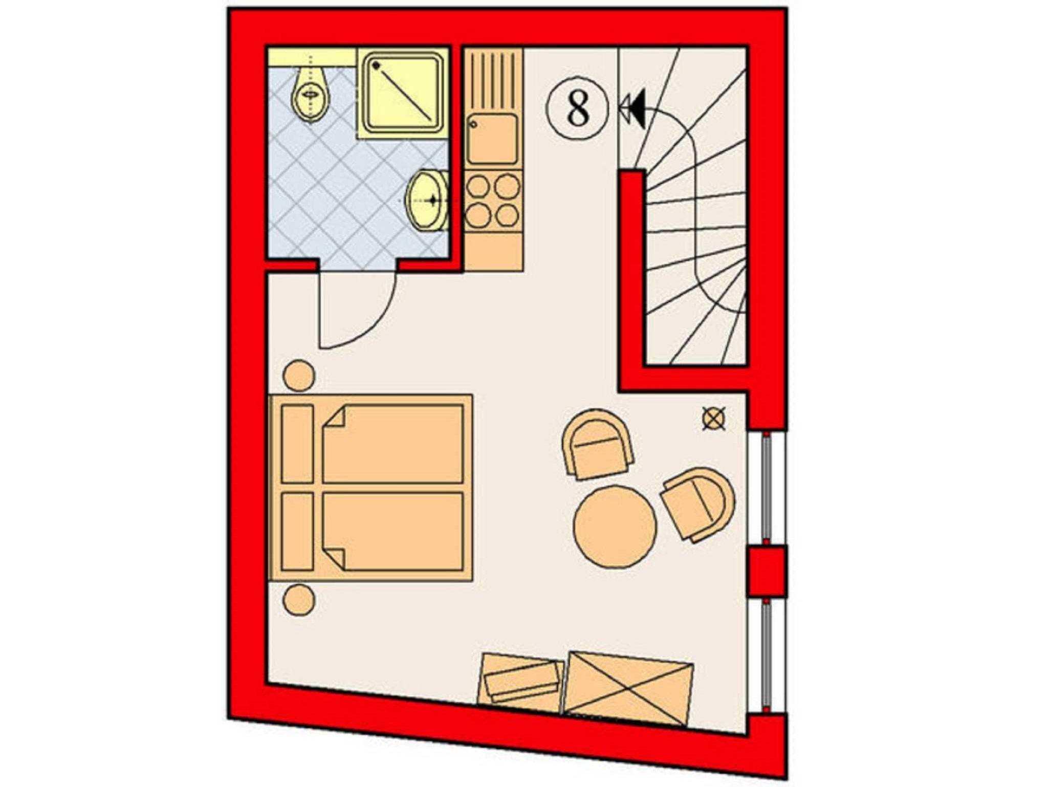 Die 20 m²-Ferienwohnung (1. OG) im begrünten Innenhof besteht aus einem kombinierten Wohn- / Schlafraum, TV, Küche und Dusche / WC. Sitzecke im Freien.