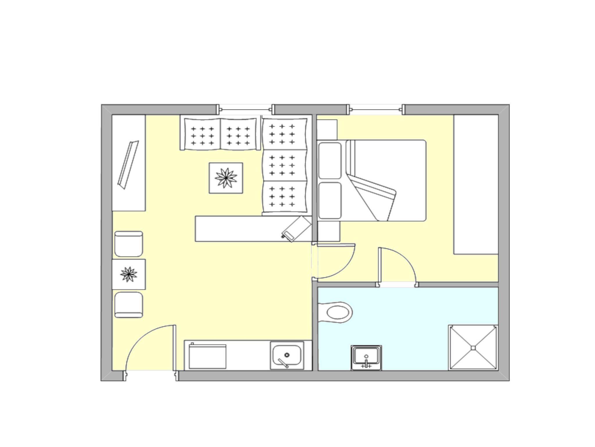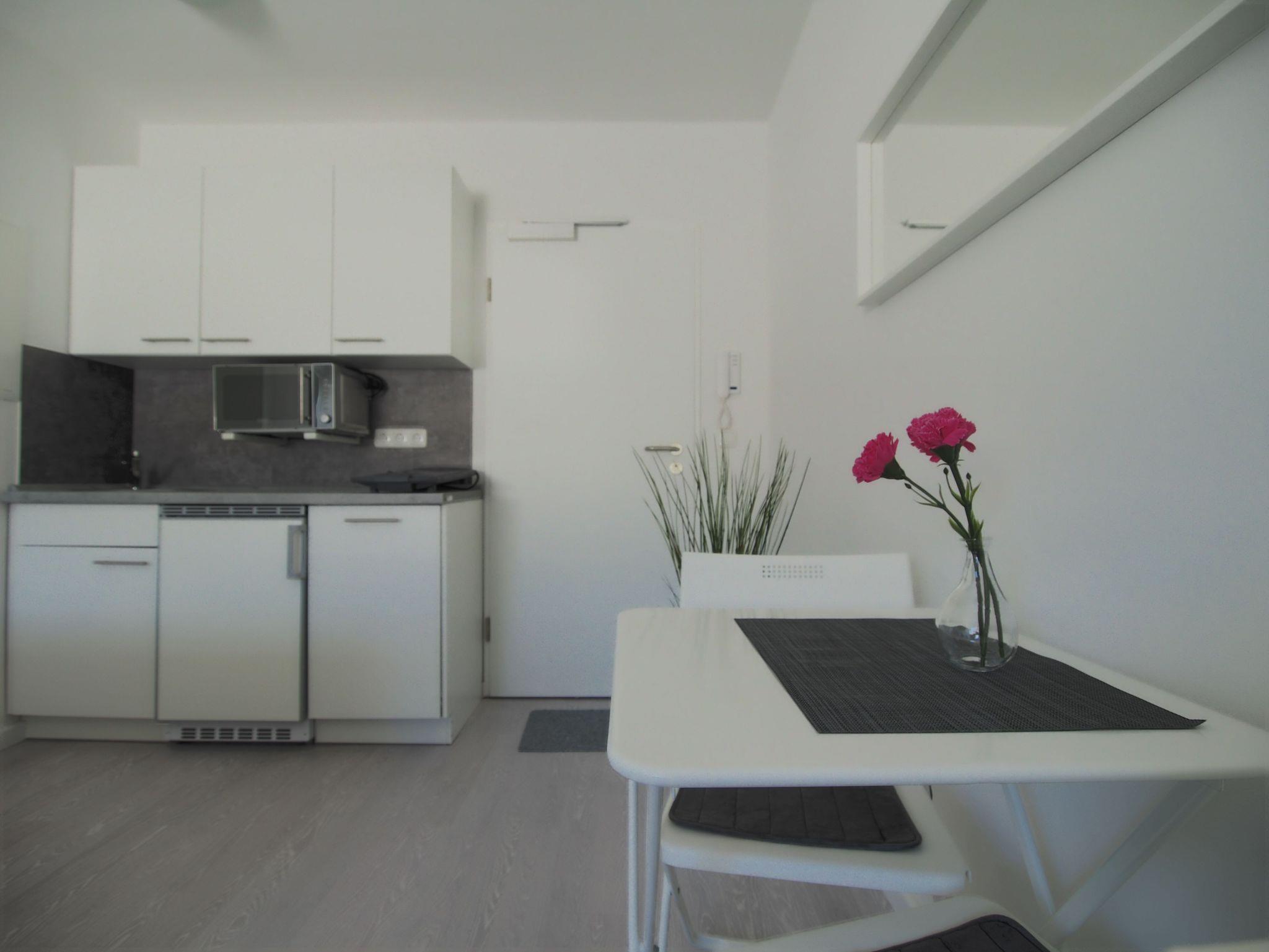 Die 2-Zimmer-Ferienwohnung ist stilvoll möbliert und verfügt über eine Wohnfläche von ca. 28 m². Sie befindet sich im 3. Stock eines 2017 komplett sanierten Hauses und ist bequem mit dem Aufzug zu erreichen. Das Wohnzimmer ist hell und freundlich eingerichtet und verfügt über eine große Wohnlandschaft und eine Schlafcouch. Hier befindet sich auch die Küchenzeile, die mit einem Kühlschrank inklusive TK-Fach, einer Mikrowelle, einem Geschirrspüler, einem 2-Platten-Ceranfeldkocher, einer Kaffeemaschine und einem Toaster ausgestattet ist. Ein Esstisch ist ebenfalls vorhanden.