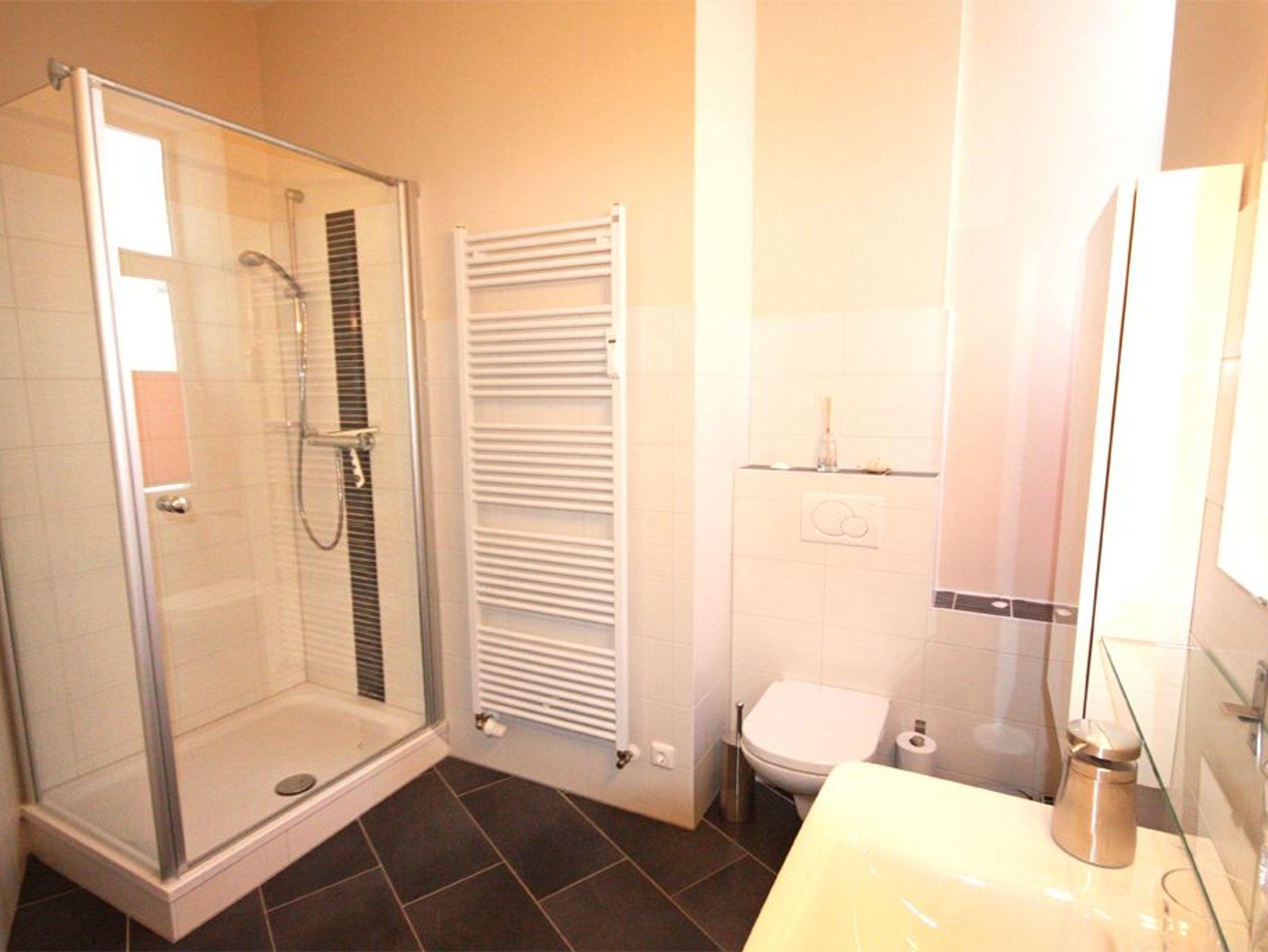 Helle 2 Zimmer Ferienwohnung für bis zu 4 Personen mit großem Balkon und Internet. Sie hat einen Wohn / Essraum mit Küchenzeile. urch die bodentiefe Fenstertür gelangen Sie auf die große möblierte Terrasse. Eine restaurierte Schiebetür trennt das Wohnzimmer vom modernen Schlafzimmer. Die Bäder sind hell, modern und mit Fußbodenheizung ausgestattet.
