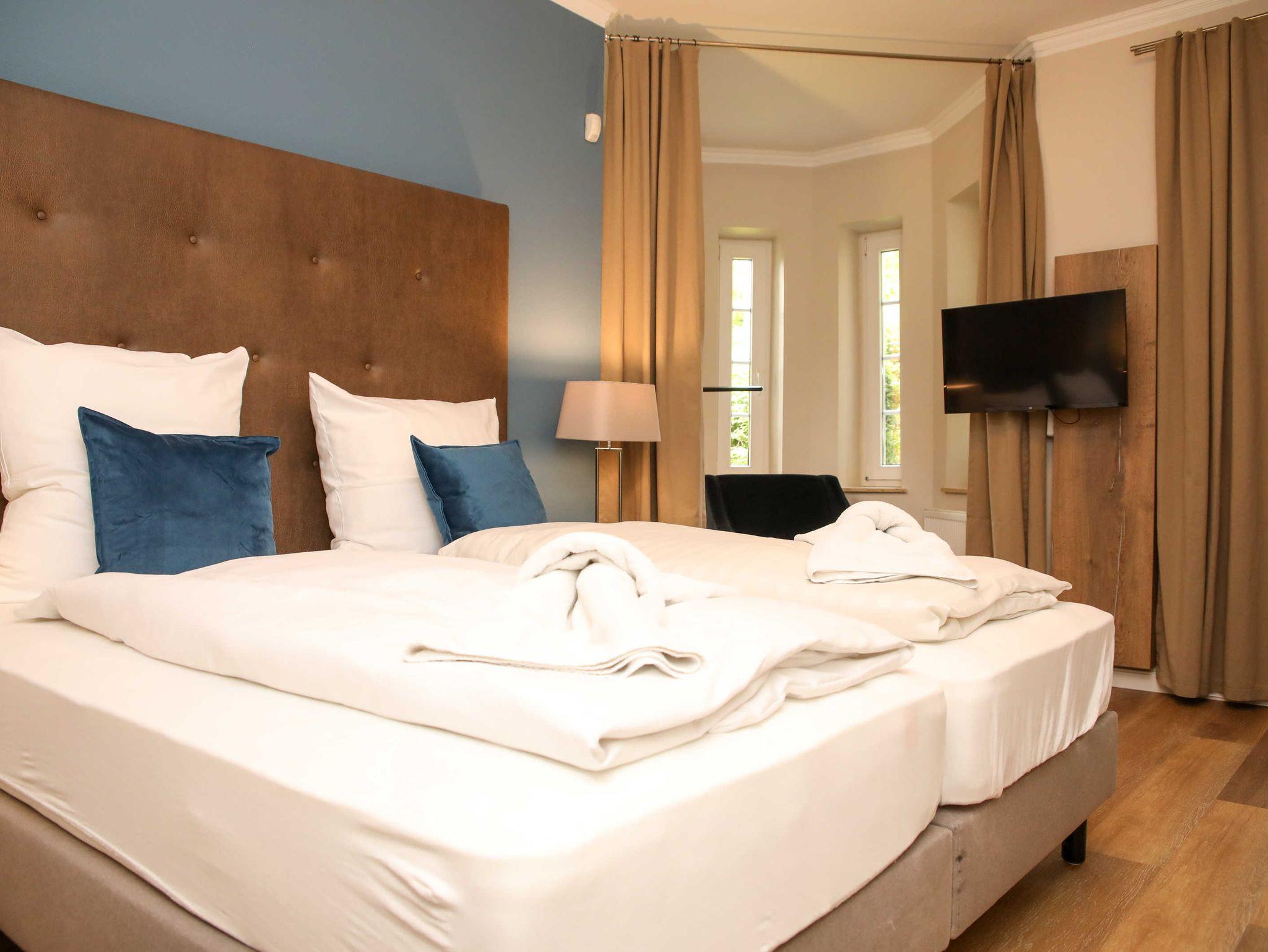 Die 2-Zimmer-Ferienwohnungen mit einer Größe von ca. 44 m² mit Balkon oder Terrasse bieten viel Platz für bis zu 4 Personen in separaten Wohn- und Schlafzimmern mit Doppelbett sowie ein neu gestaltetes Duschbad mit Whirlpool.