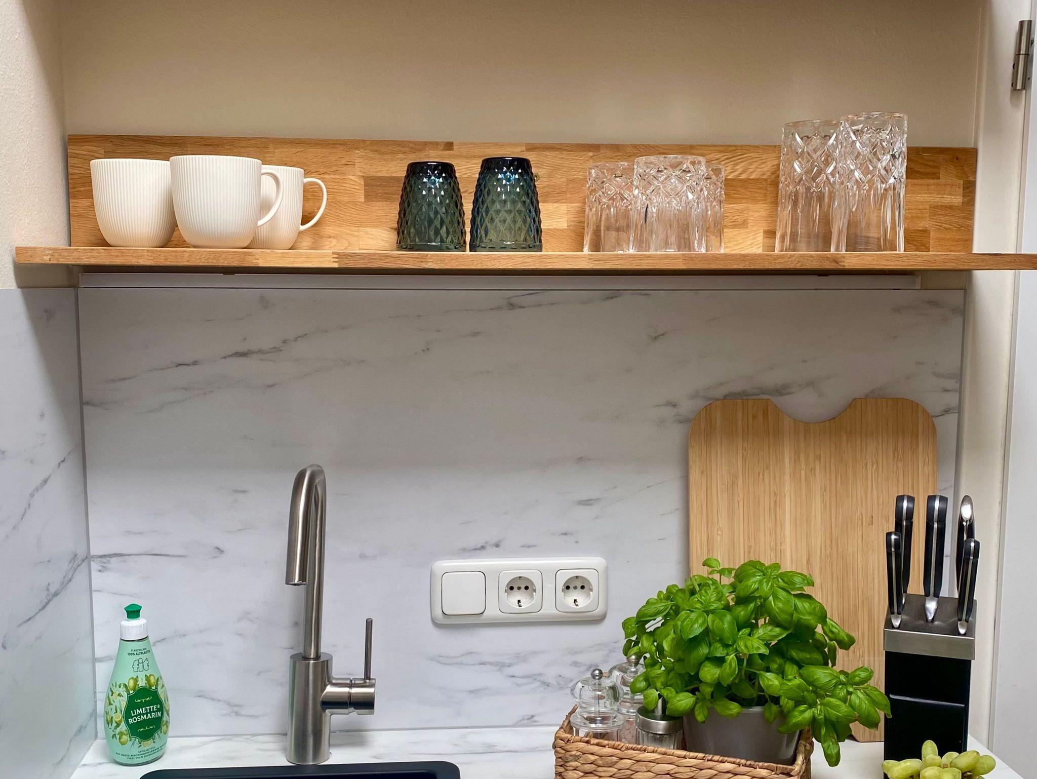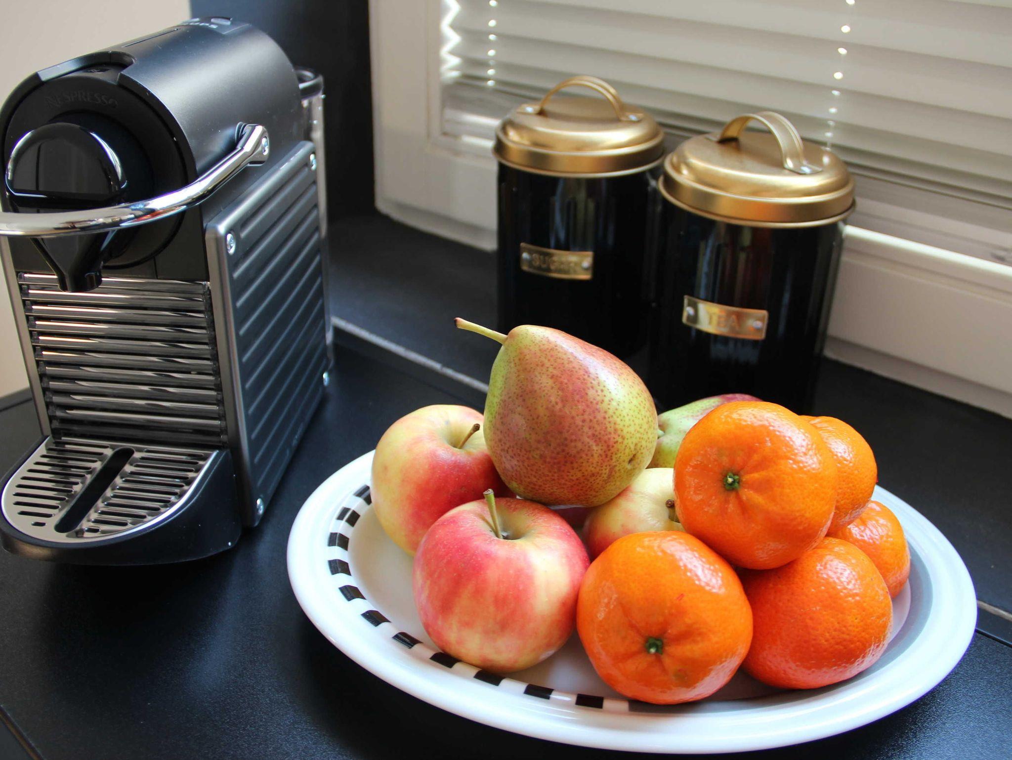 Doppelbett, Bettwäsche, Pantry Küche mit Kühlschrank & Herd, Duschbad mit Fön & Handtüchern, Smart - TV und Internet. Die Pantryküche ist mit Geschirr, Gläsern, Besteck, Töpfen und einer Pfanne, einer Kaffeefilter- und einer Nespressomaschine, Toaster, Wasserkocher und anderen Gebrauchsgegenständen ausgestattet.