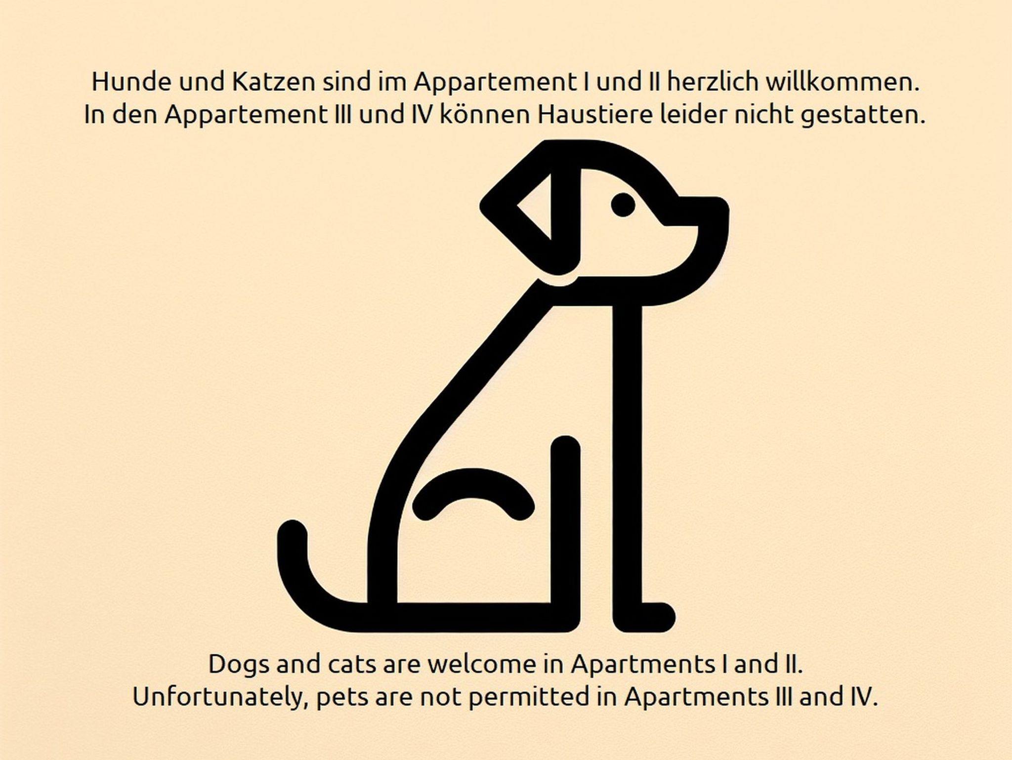 In diesem Appartement sind Hunde und Katzen gegen Gebühr von 30,00 € pro Haustier herzlich willkommen. Bitte beachten Sie, dass maximal zwei Tiere untergebracht werden können. Bei sehr großen Hunden ist die Anzahl auf ein Tier begrenzt.