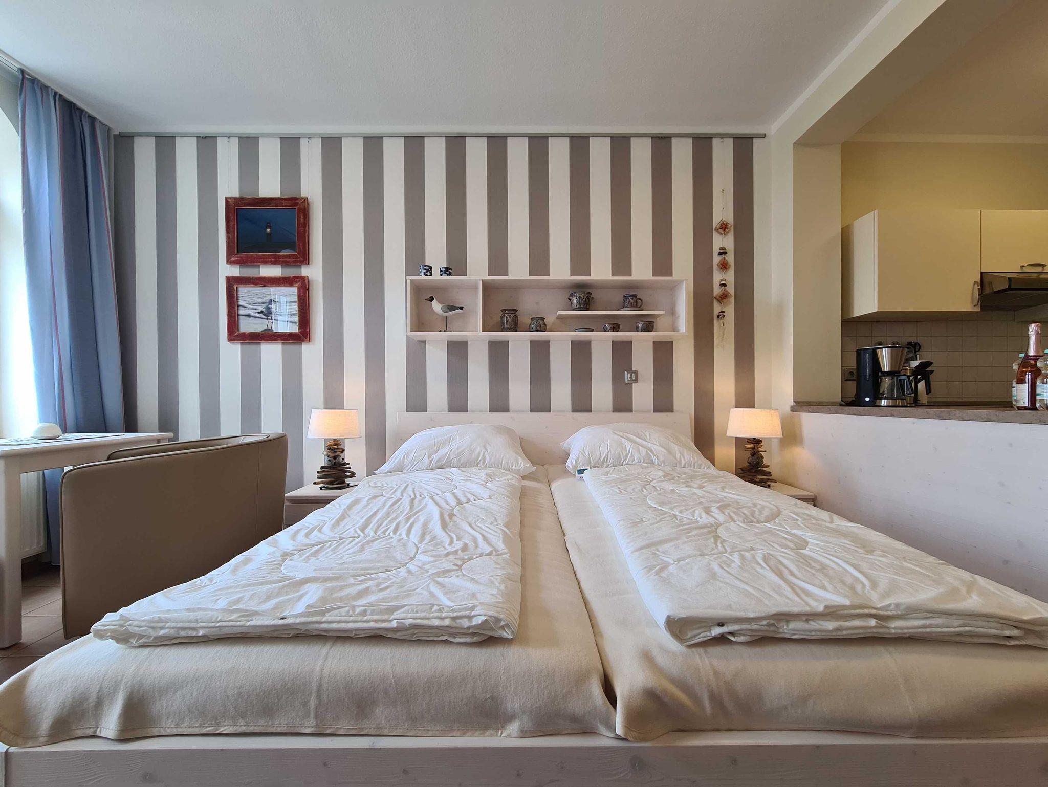 Die angebotene 1-Zimmerwohnung hat eine Wohnfläche von ca. 30 qm und ist für 2 Personen geeignet. Das Wohnzimmer ist mit einem breiten Doppelbett ausgestattet und verfügt außerdem über eine gemütliche Sitzecke mit Sesseln, einen Flachbild-TV und eine hochwertige Musikanlage. Die Küchenzeile ist modern und komplett ausgestattet mit einem Cerankochfeld, einer Mikrowelle und einem Kühlschrank. Das Badezimmer ist mit einer Dusche ausgestattet. Ein Highlight der Wohnung ist die wunderschöne Balkonterrasse mit Blick Richtung Leuchtturm und Düne. Mit dieser Ausstattung bietet die Wohnung ein gemütliches und komfortables Zuhause für zwei Personen.
