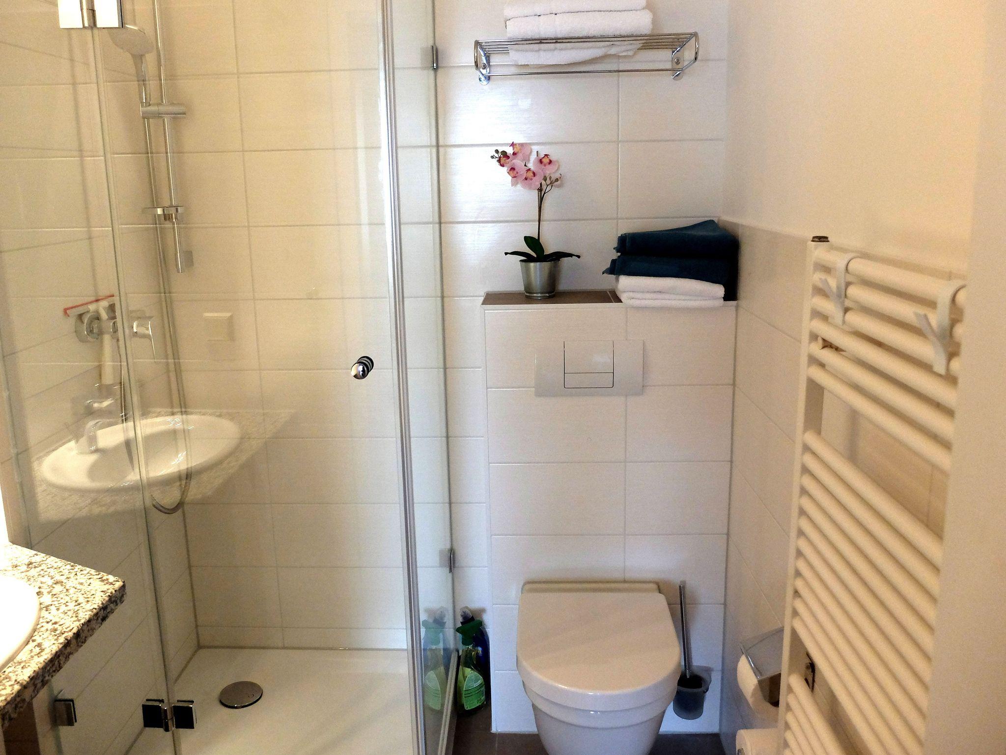Das wunderschöne Badezimmer besitzt eine moderne Dusche und WC.