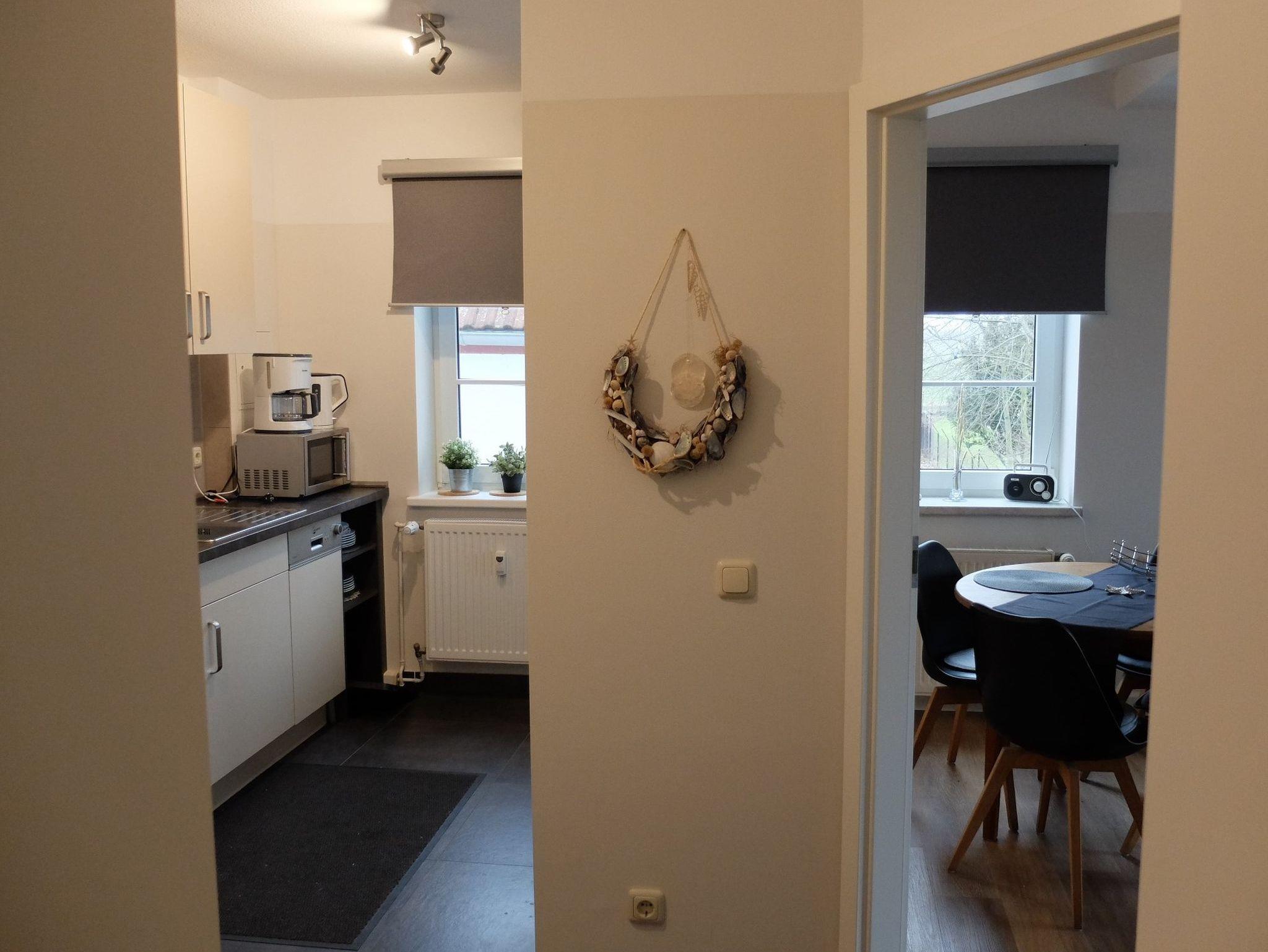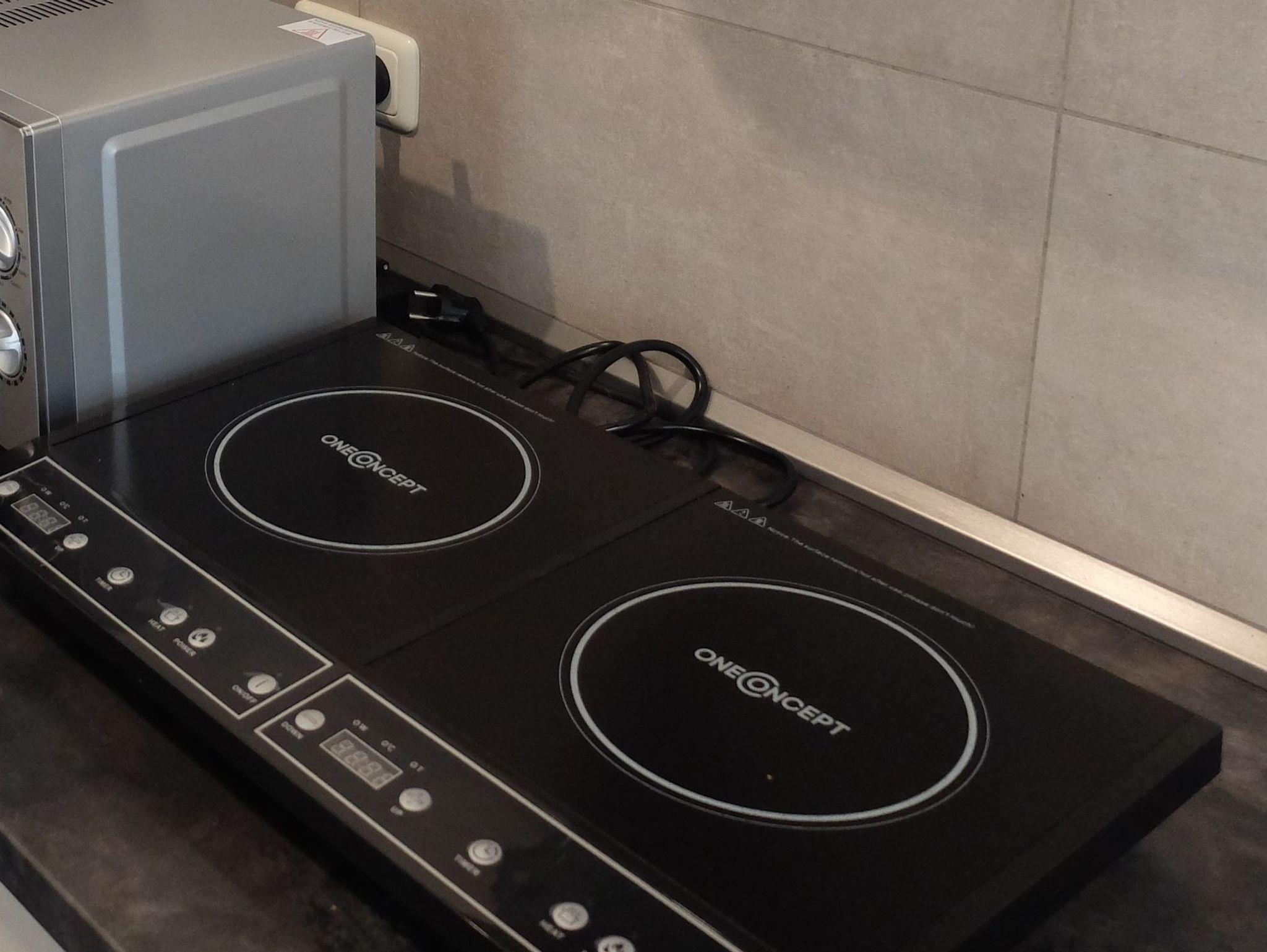 Die Fewo ist mit einer offenen Küche im Wohnbereich ausgestattet und bietet jeden Komfort für Frühstück und kleinere Mittagsgerichte. Minibackofen für Pizza und Brötchen. Spülmaschine und 2-Platten Induktionsherd sind integriert.