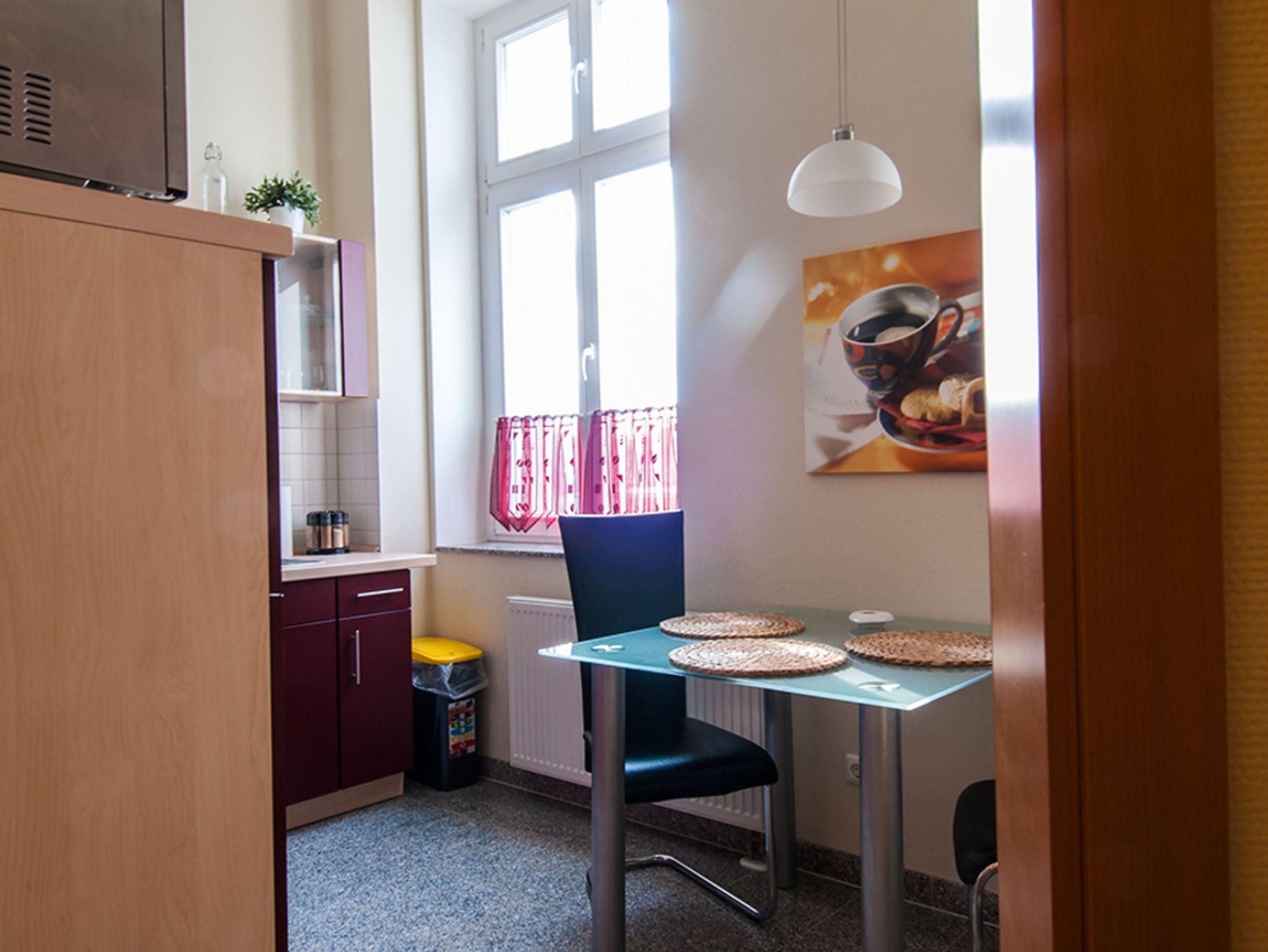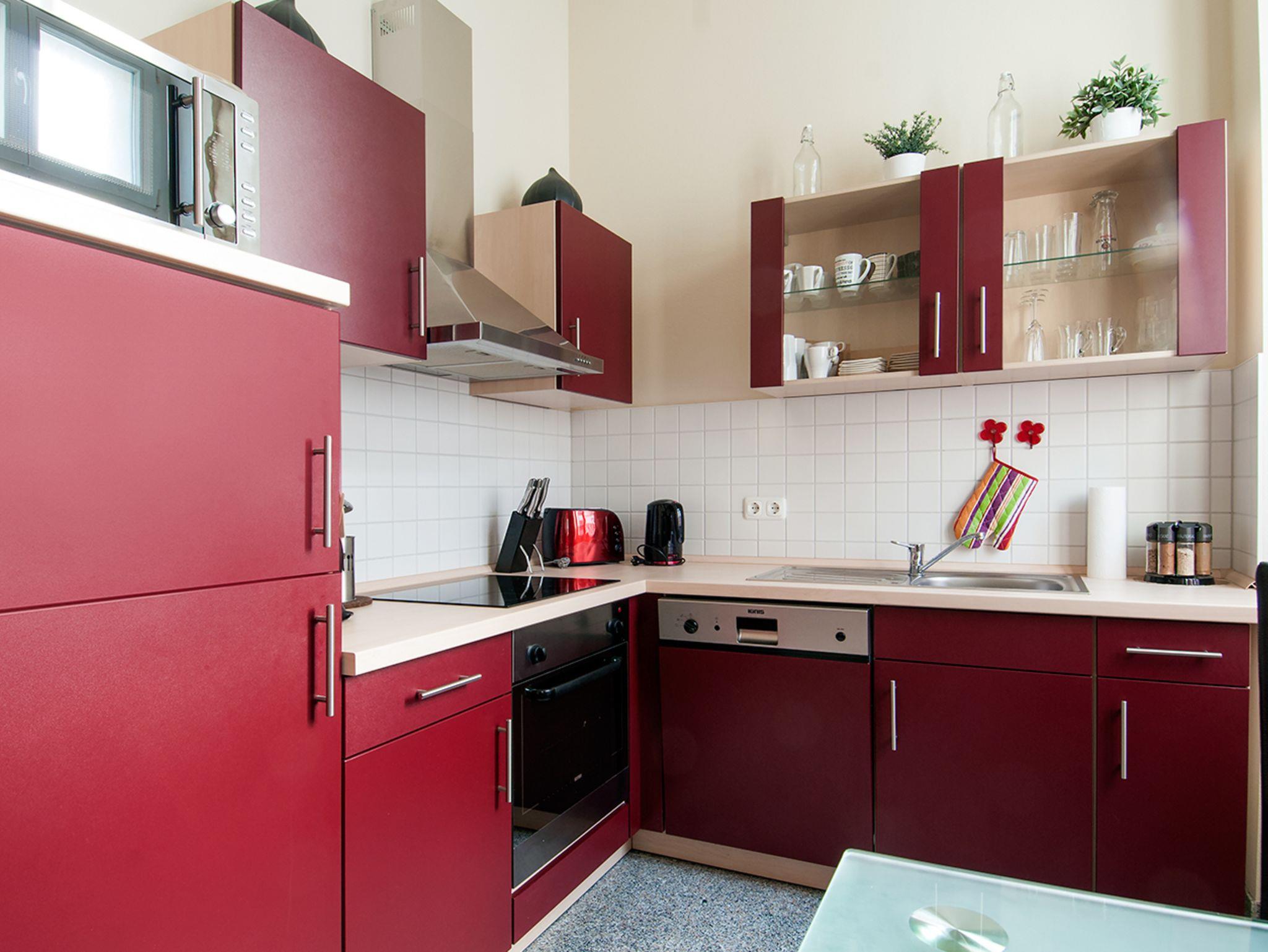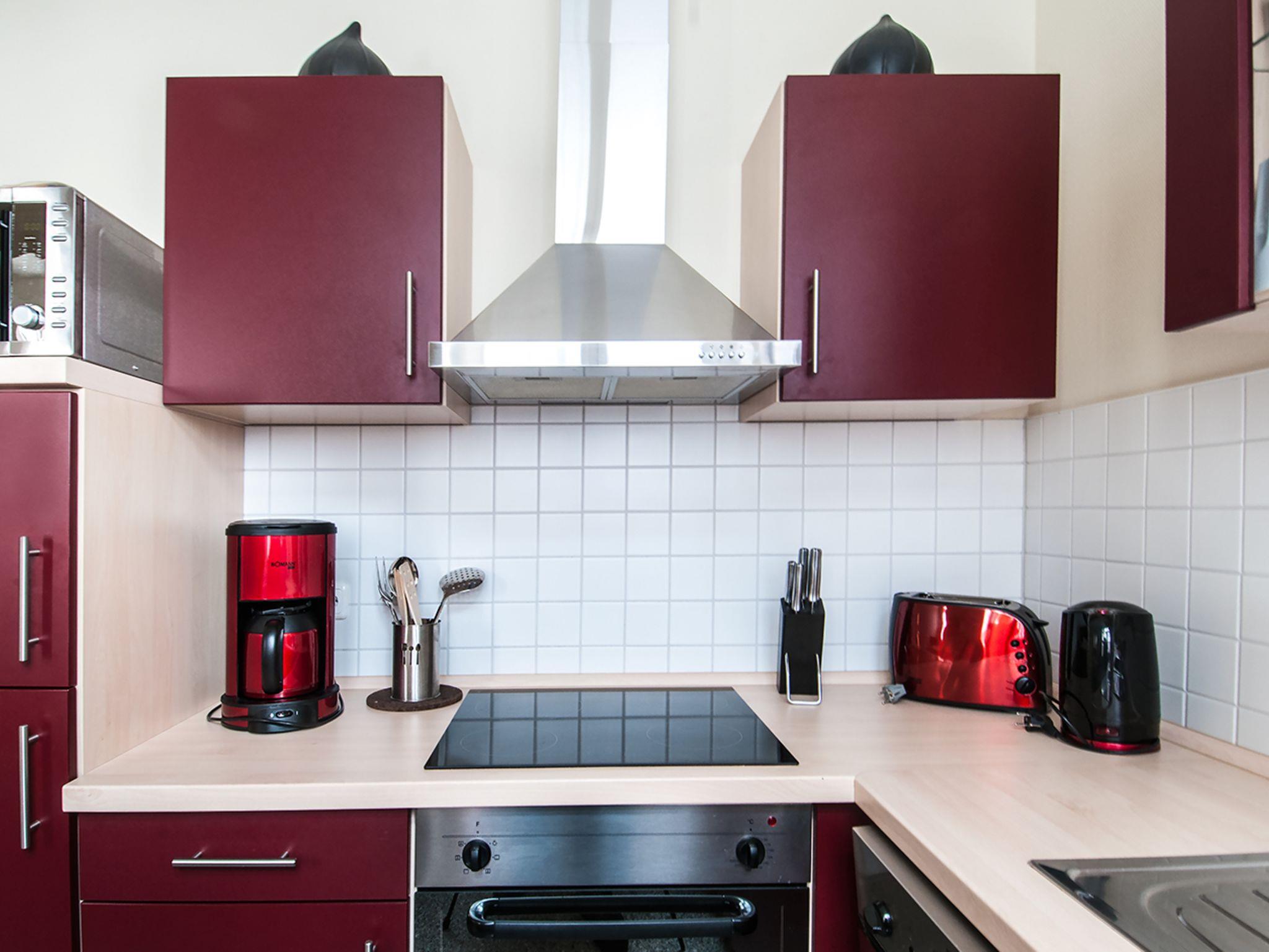 Die vollausgestattete Küche ist mit Ceranherd, Kühlschrank und Geschirrspüler, Mikrowelle, Kaffeemaschine, Toaster, Wasserkocher und großzügigem Essplatz komplett eingerichtet.
