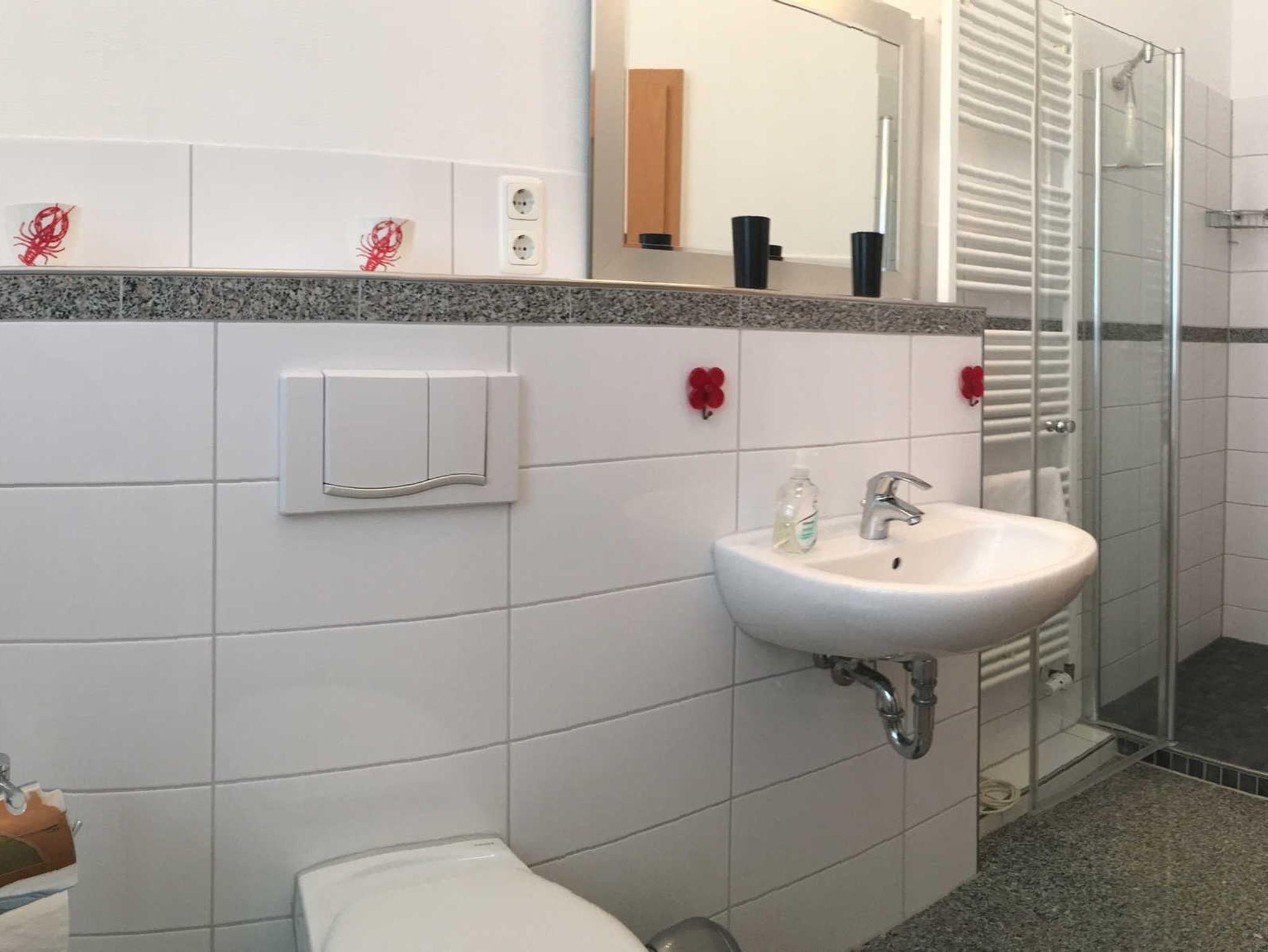 Das Bad der Ferienwohnung Neptun verfügt über Dusche/WC und einen Haartrockner. Auf dem sonnigen Südbalkon können Sie den Tag in Ruhe genießen oder den Abend entspannt ausklingen lassen.