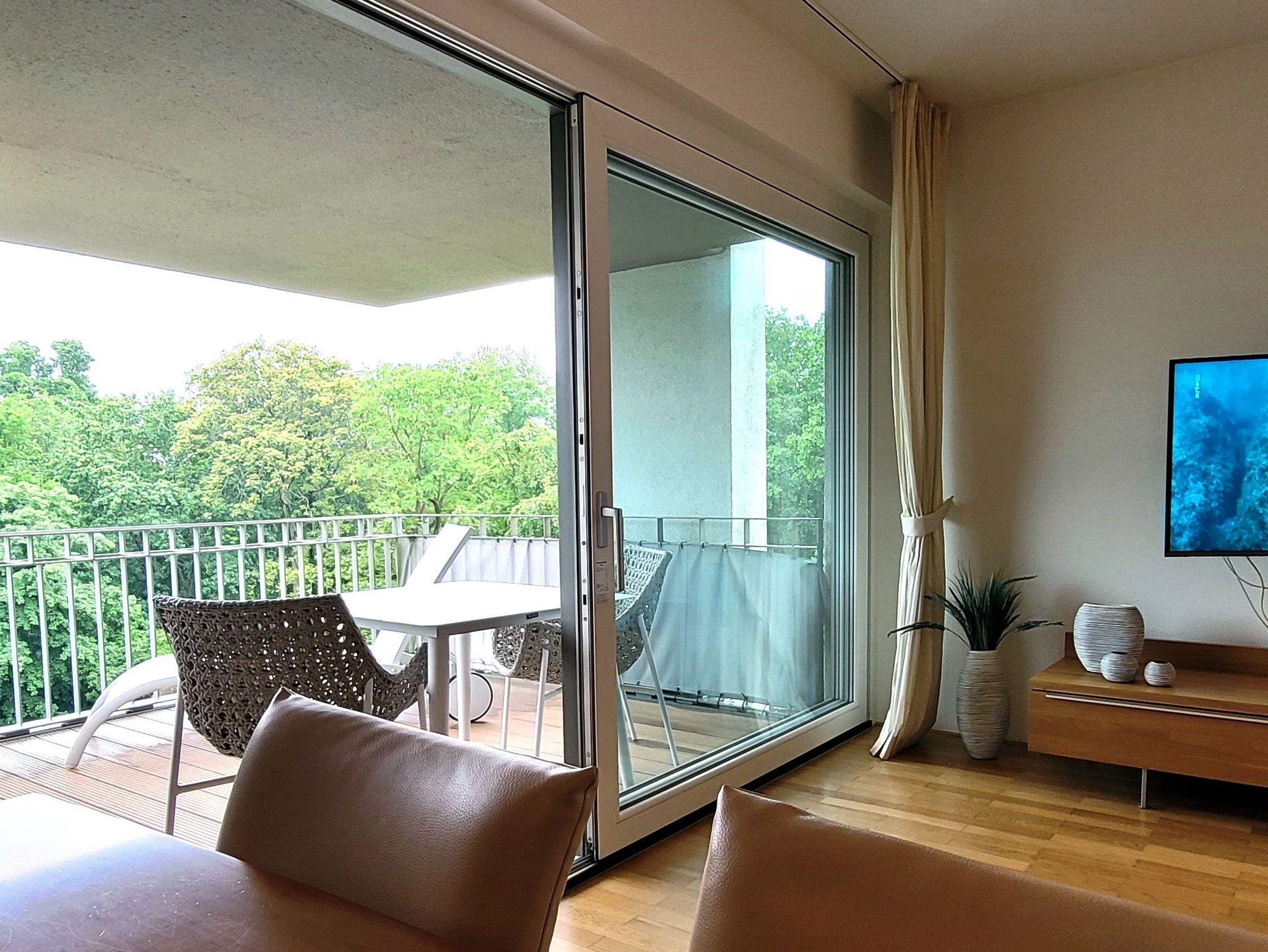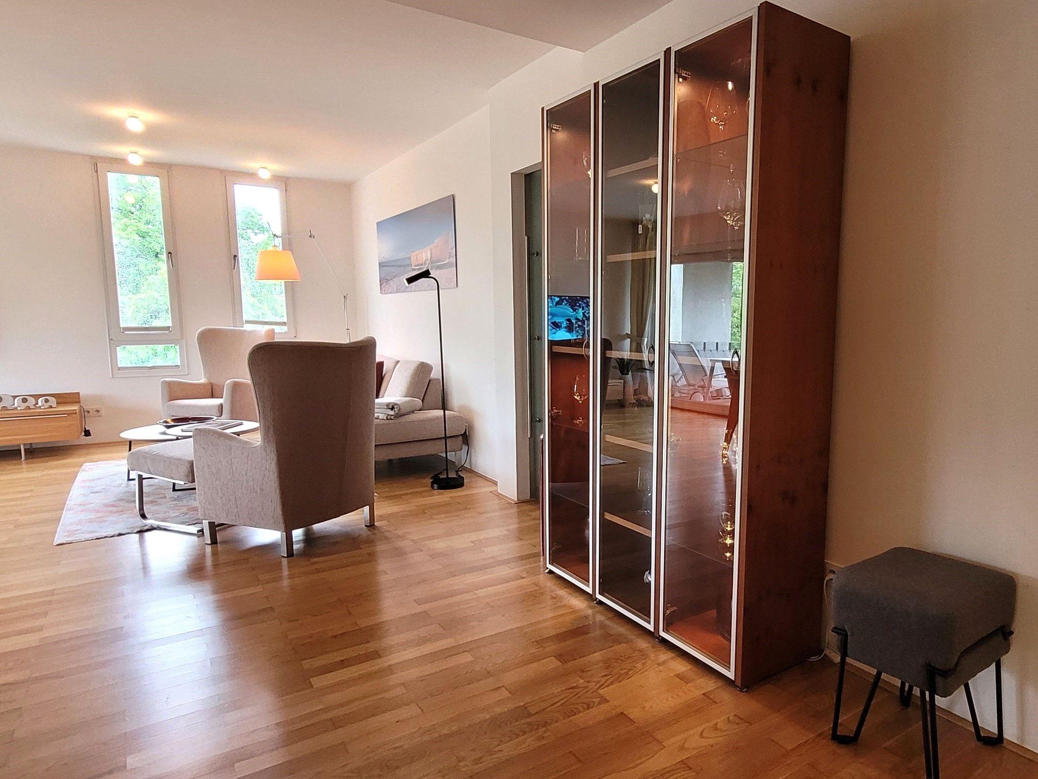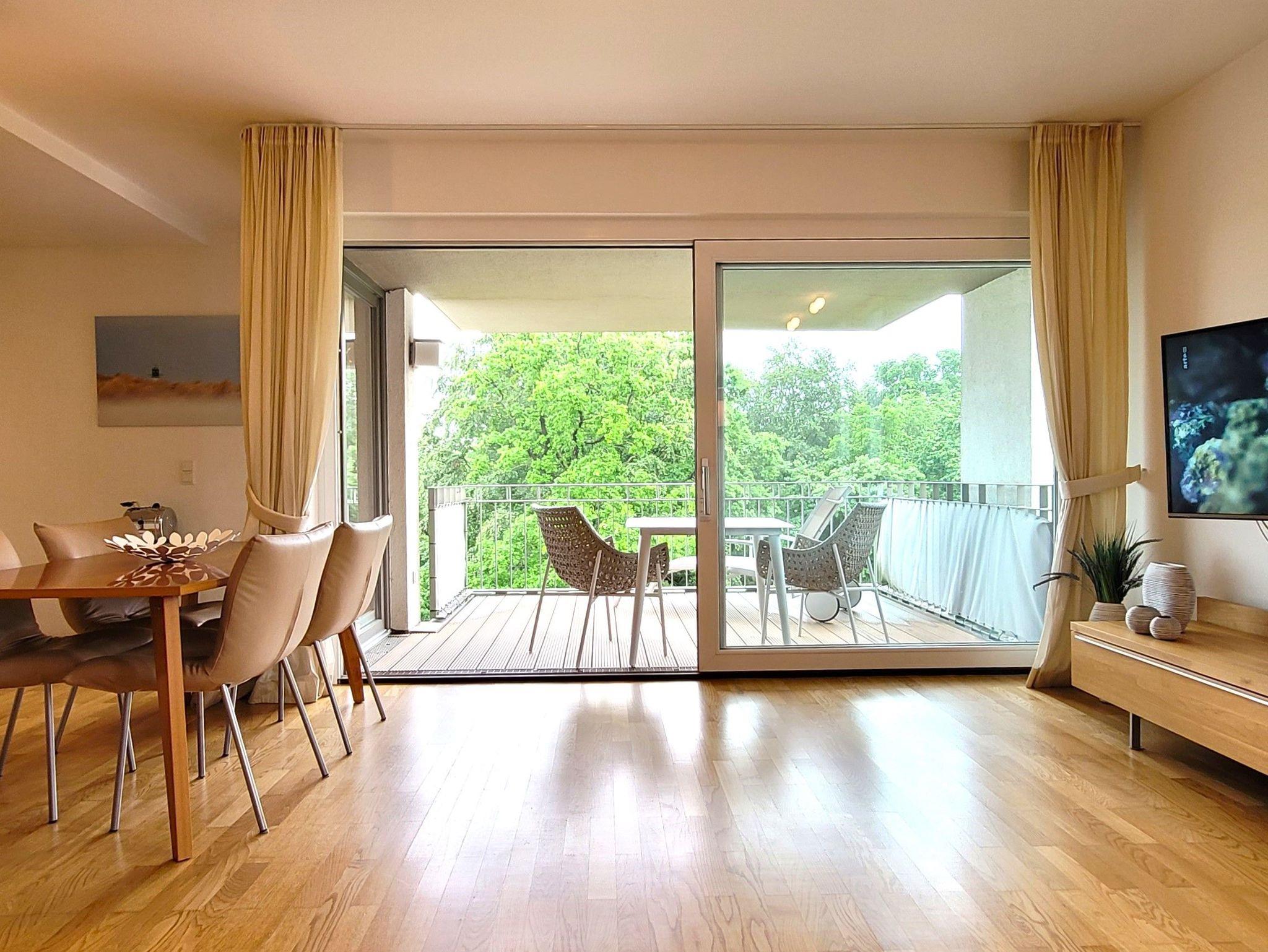Ein herrlicher Blick in den Kurpark bietet sich von dem 35 qm grossen Wohnraum aus. Die Luxuswohnung hat einen großen Balkon eine sehr moderne Küche. Hier wird Ihnen alles geboten, was KöchInnen benötigen, beispielsweise einen Weinkühler. Vom Wohnraum aus können Sie den Balkon betreten und den Blick über den wunderschönen Kurpark geniessen.