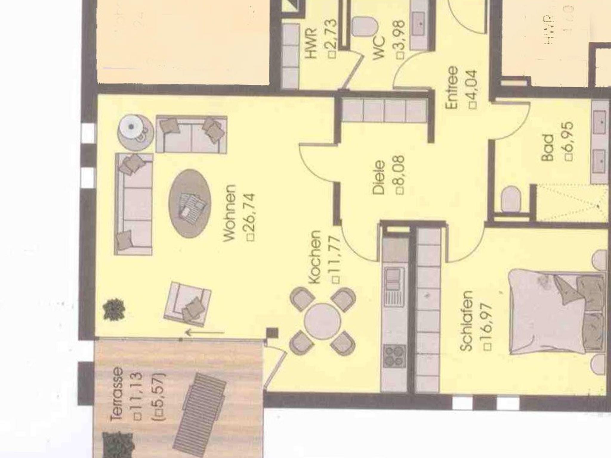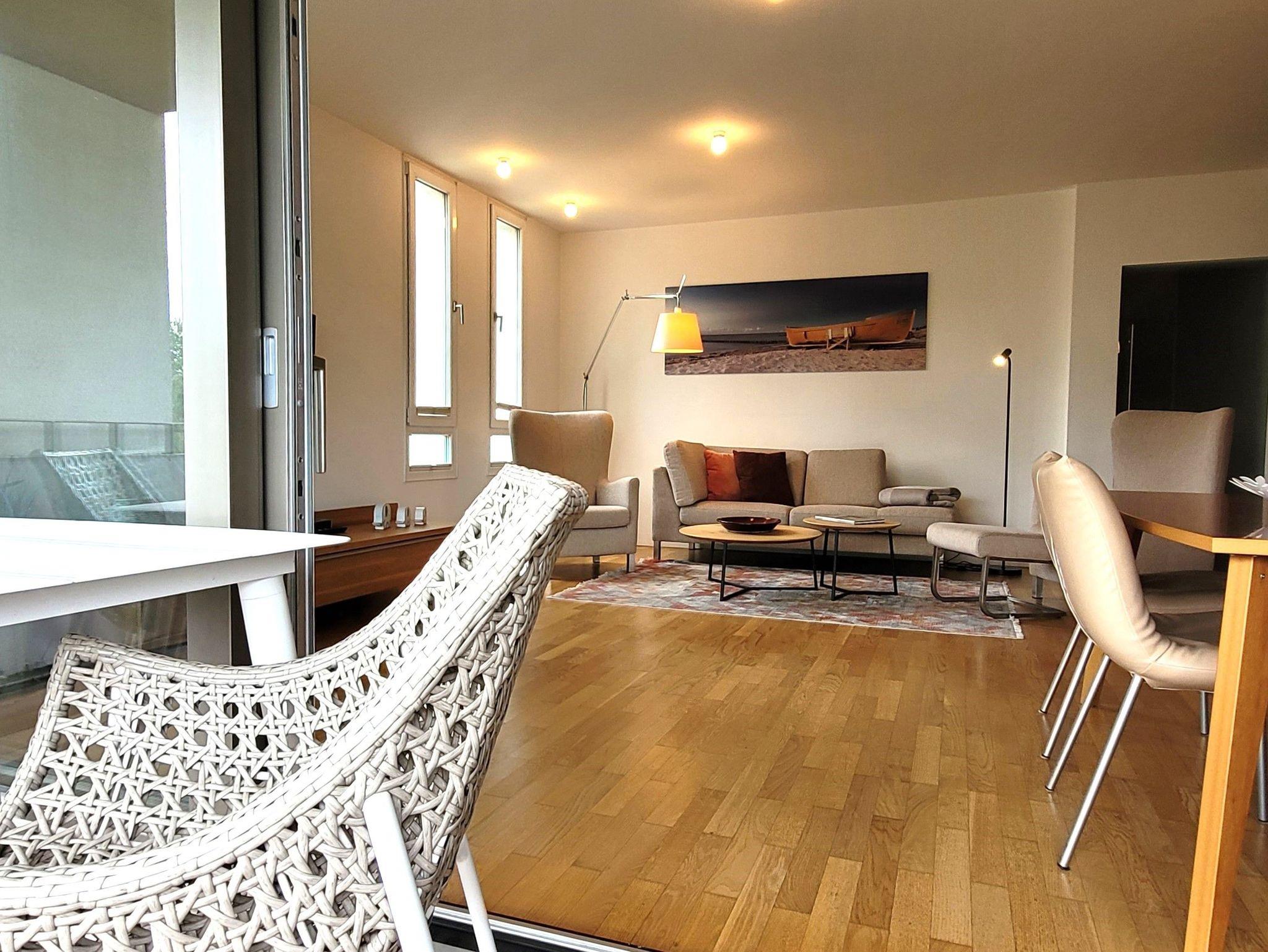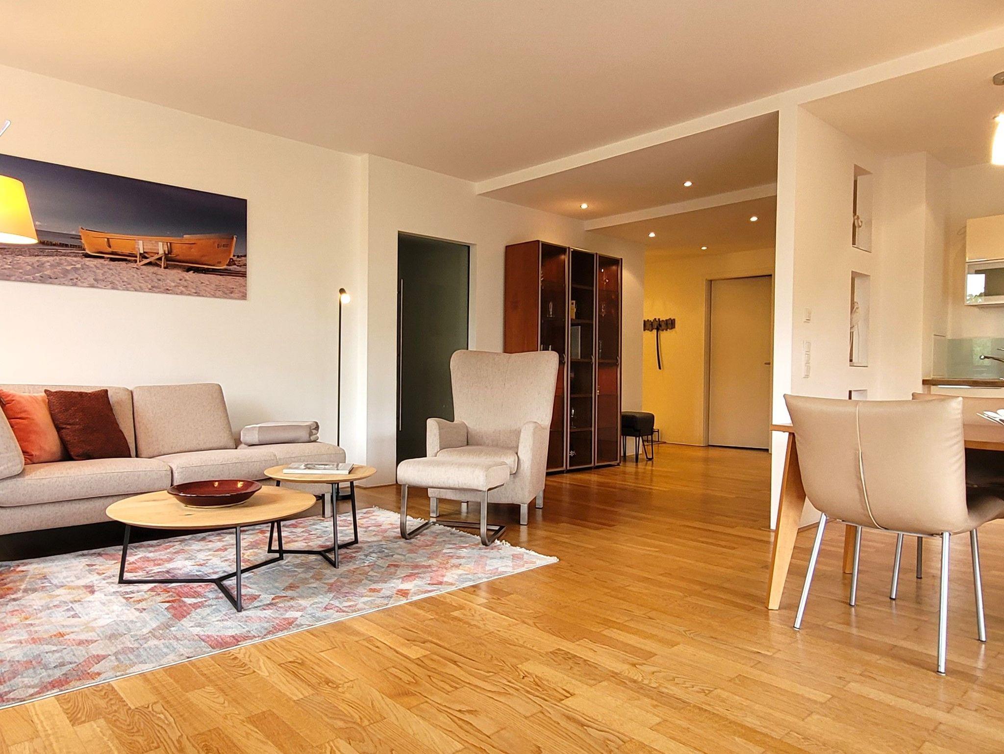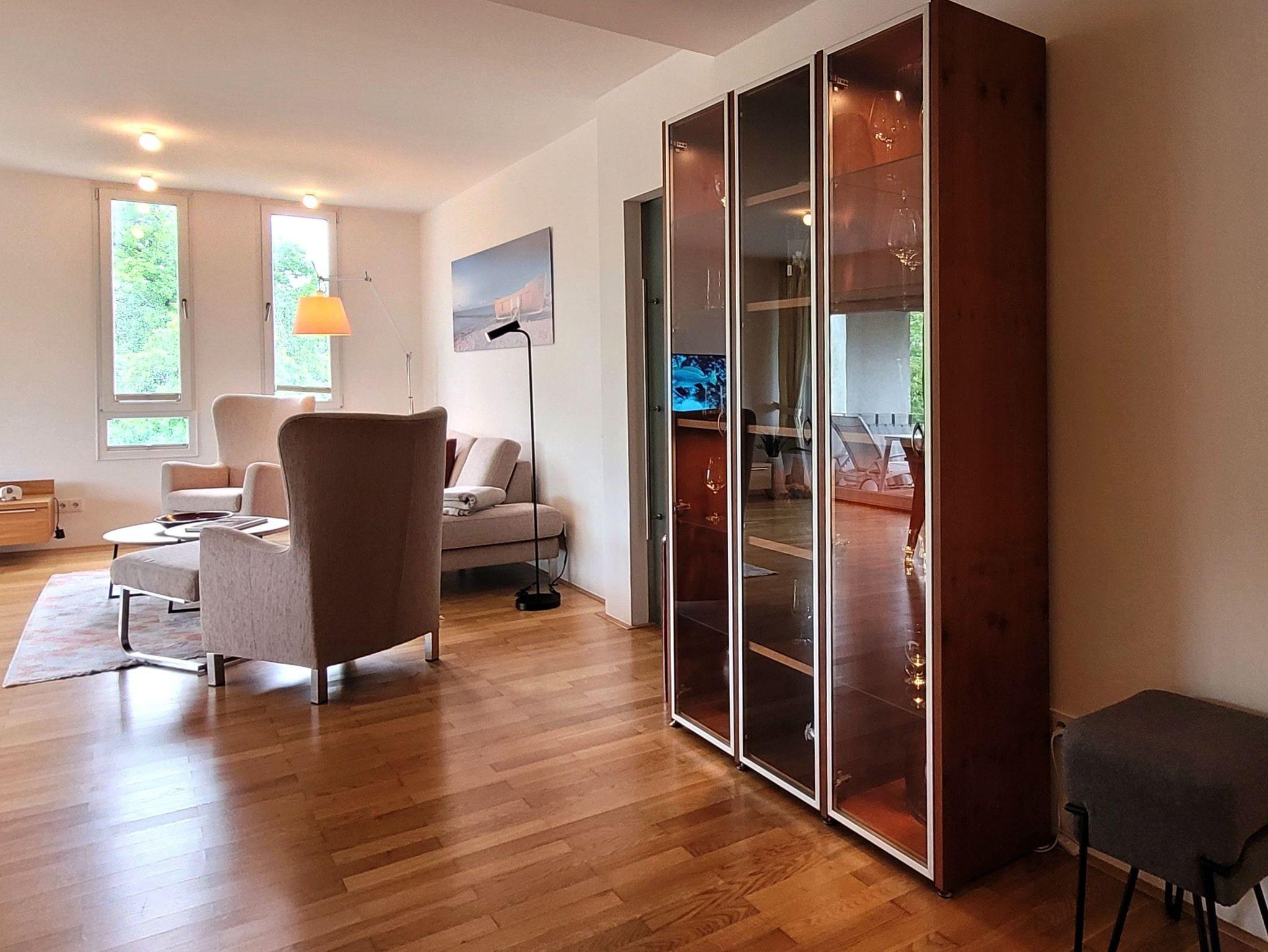 Ein herrlicher Blick in den Kurpark bietet sich von dem 35 qm grossen Wohnraum aus. Die Luxuswohnung hat einen großen Balkon eine sehr moderne Küche. Hier wird Ihnen alles geboten, was KöchInnen benötigen, beispielsweise einen Weinkühler. Vom Wohnraum aus können Sie den Balkon betreten und den Blick über den wunderschönen Kurpark geniessen.