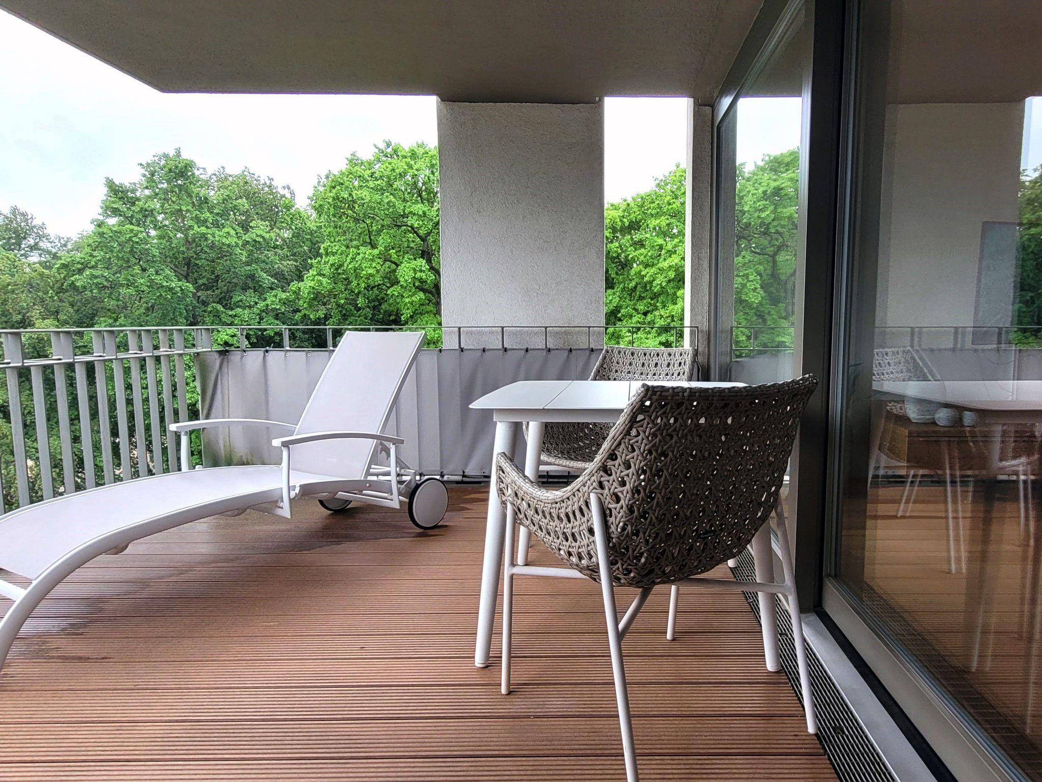 Luxuriöse Ferienwohnung in Warnemünde mit Balkon, Panoramablick auf den Kurpark und zwei modernen Badezimmern.