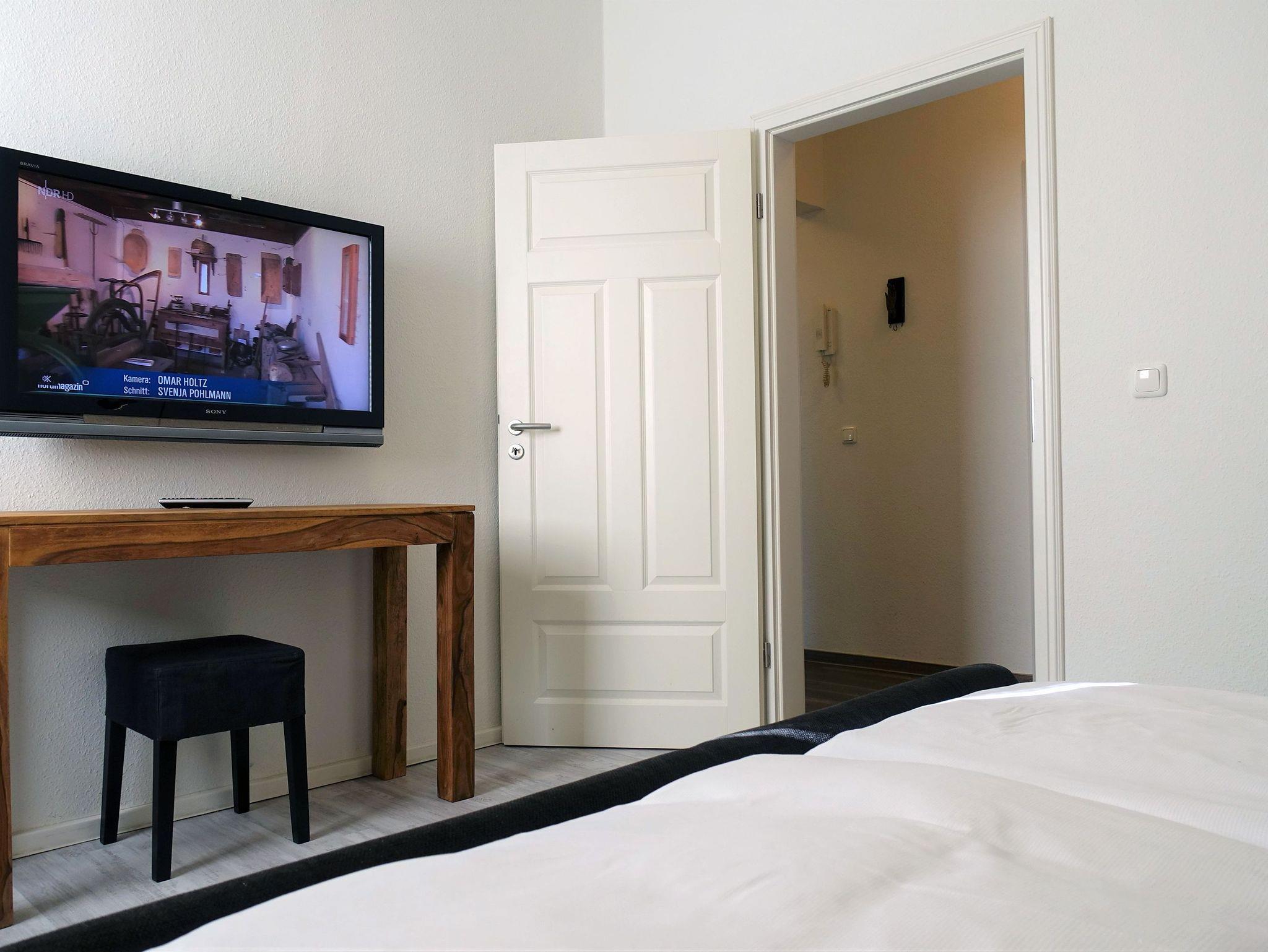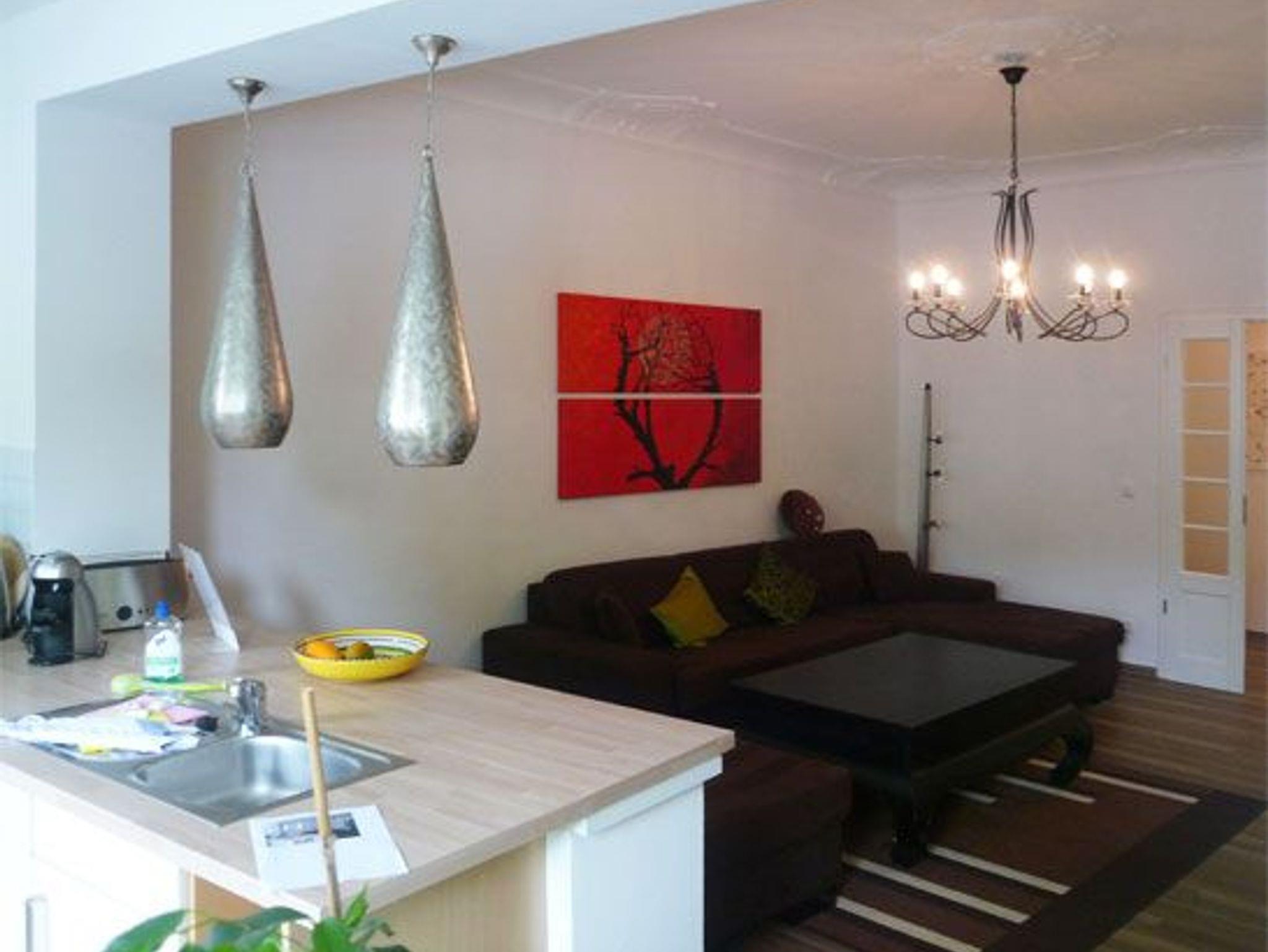 Im Hochparterre eines 1920 errichteten Mehrfamilienhauses befindet sich die moderne Ferienwohnung. Es gibt schöne hohe Räume in der großzügigen Wohnung und schmuckvolle Stuckdecken im Wohnzimmer.