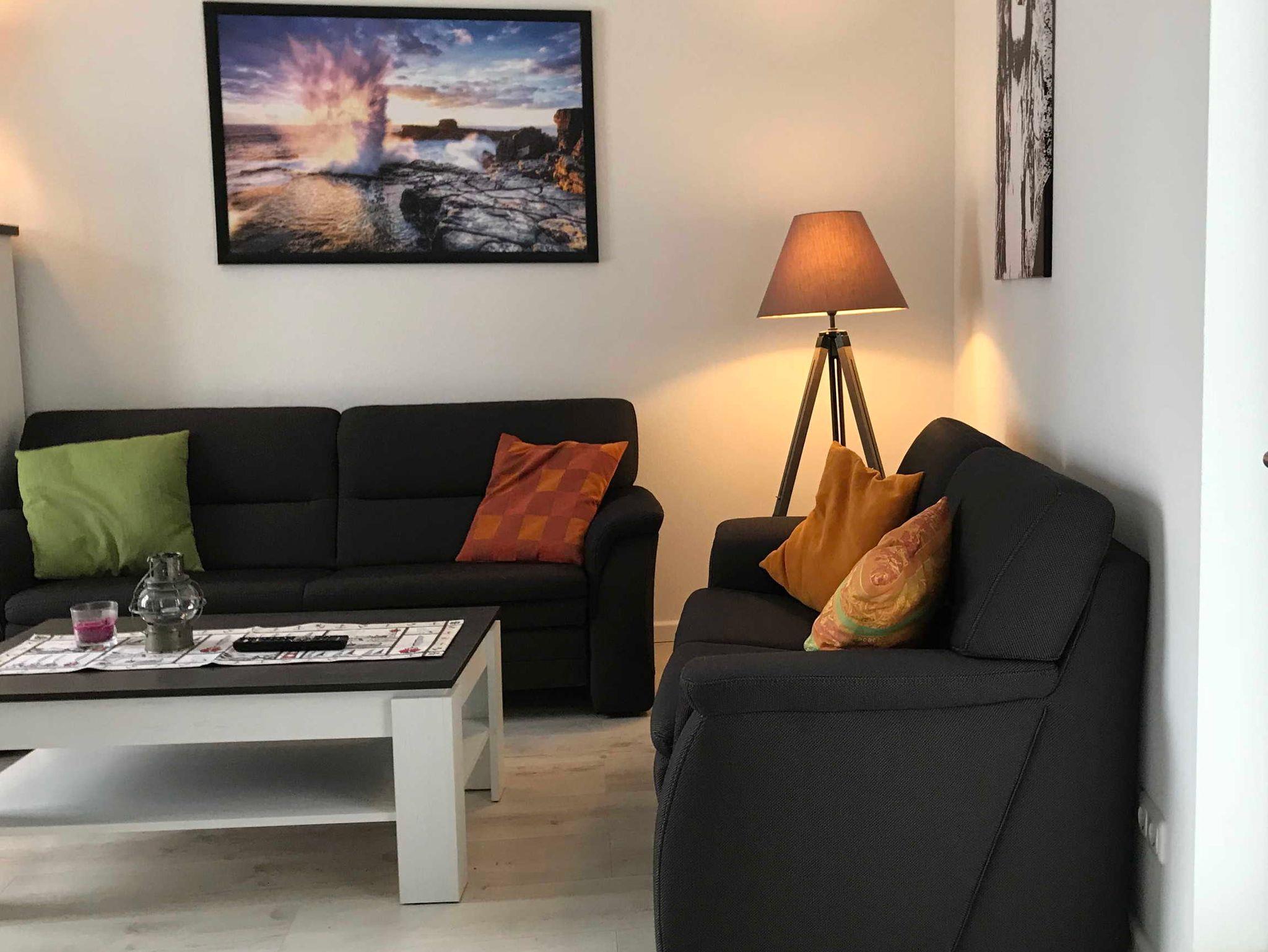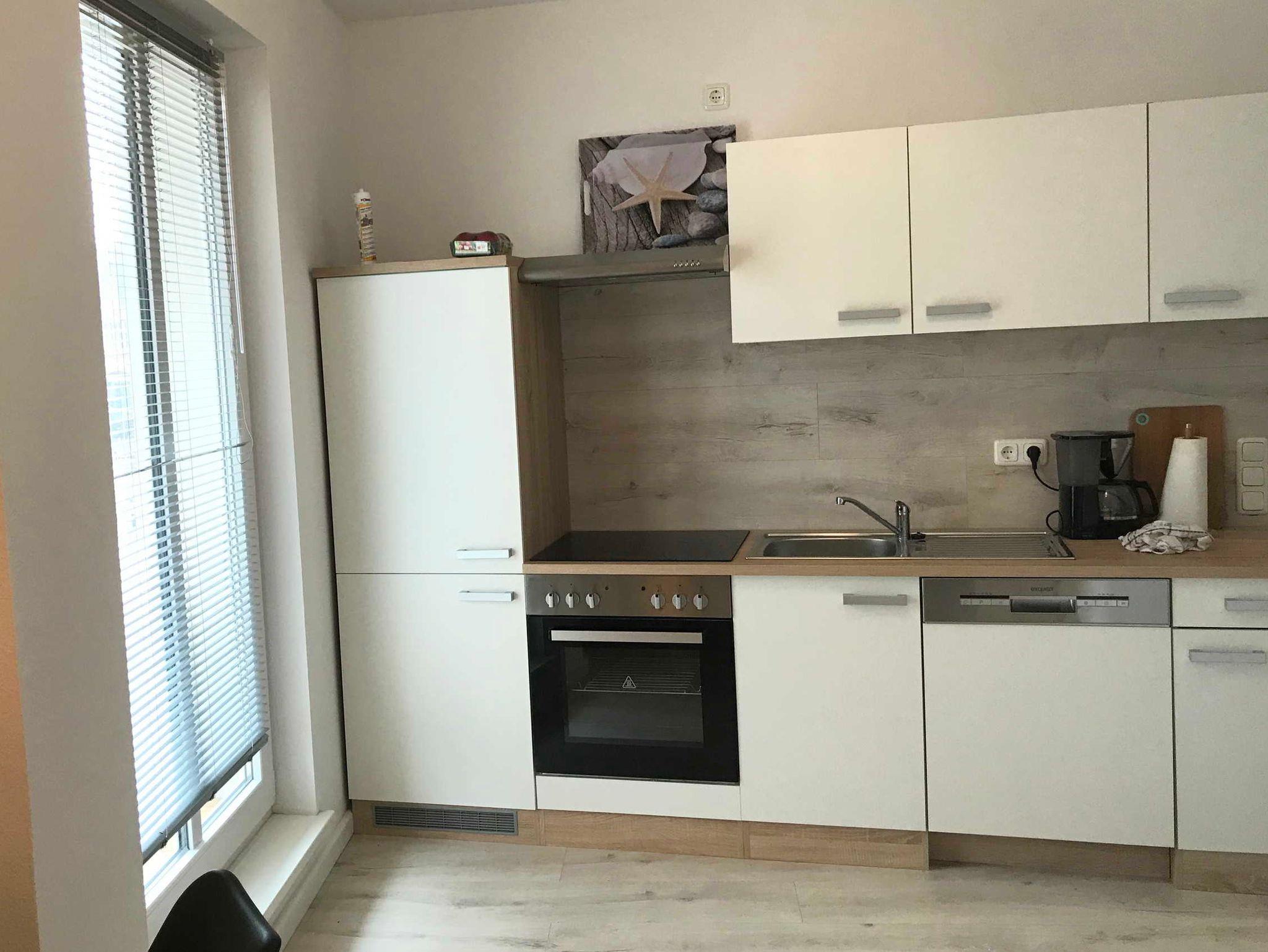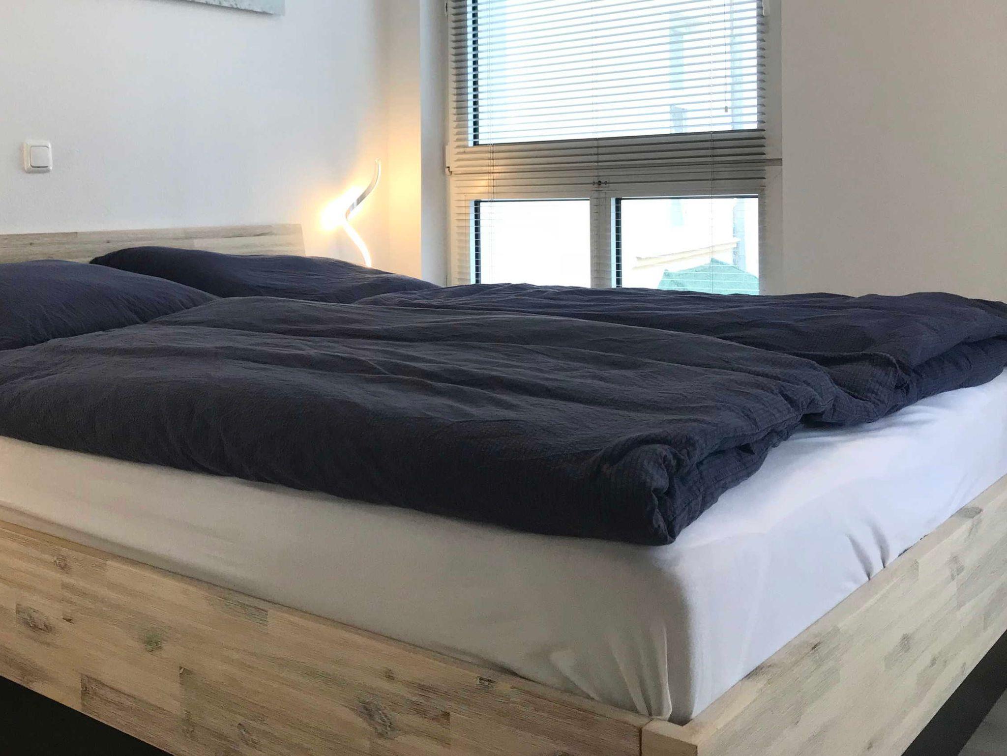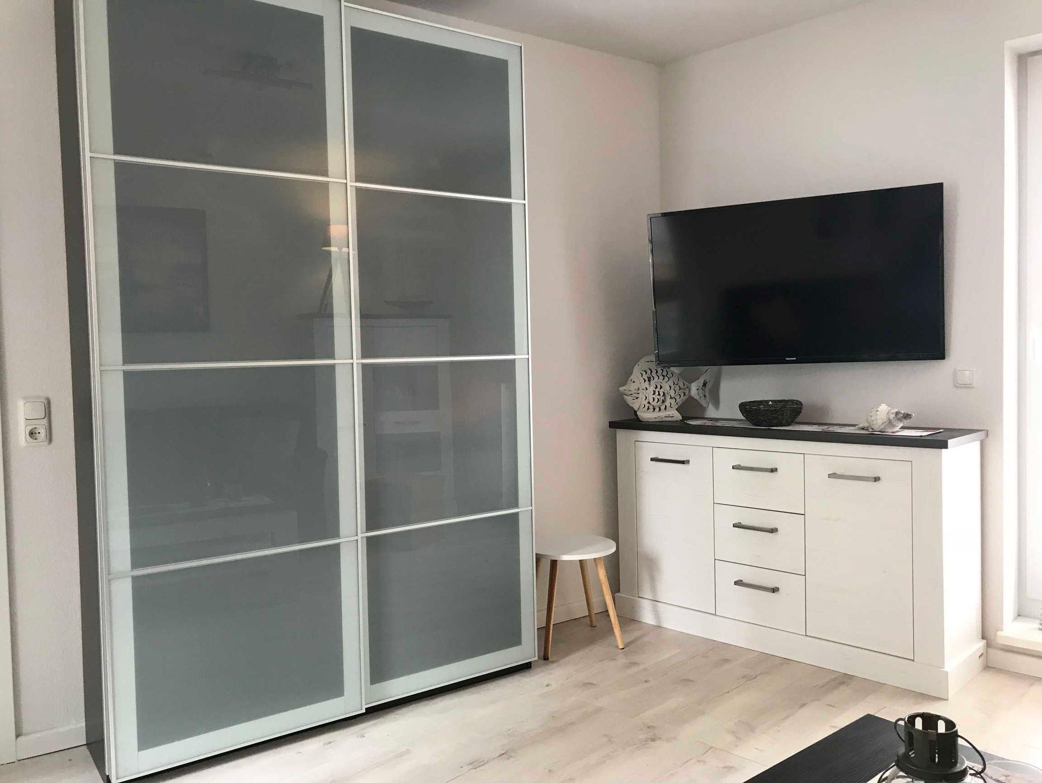 Das Apartment in Warnemünde hat ein Schlafzimmer mit Doppelbett, einen offenen Wohn- und Küchenbereich mit großem Fernseher und ein Badezimmer mit Dusche/WC.