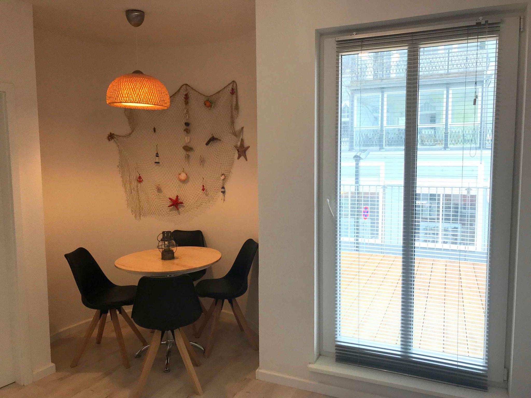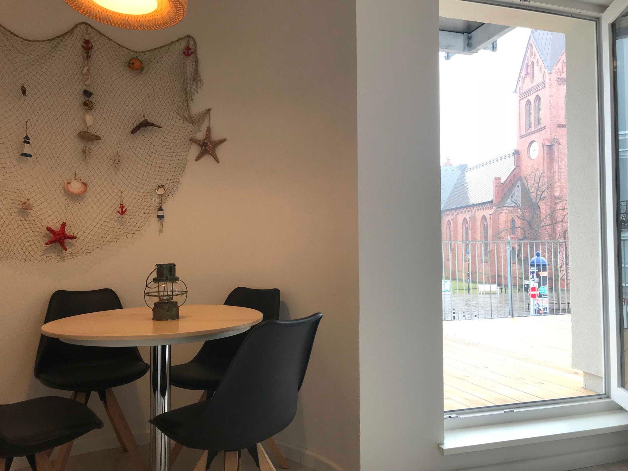 Exklusives Apartment in Warnemünde mit großer Terrasse und Blick auf den Kirchenplatz, ideal im Herzen der Stadt gelegen.