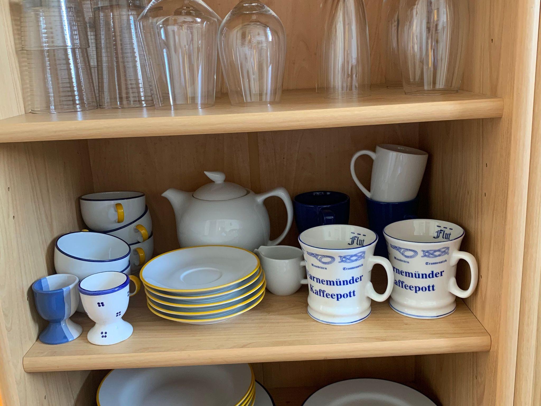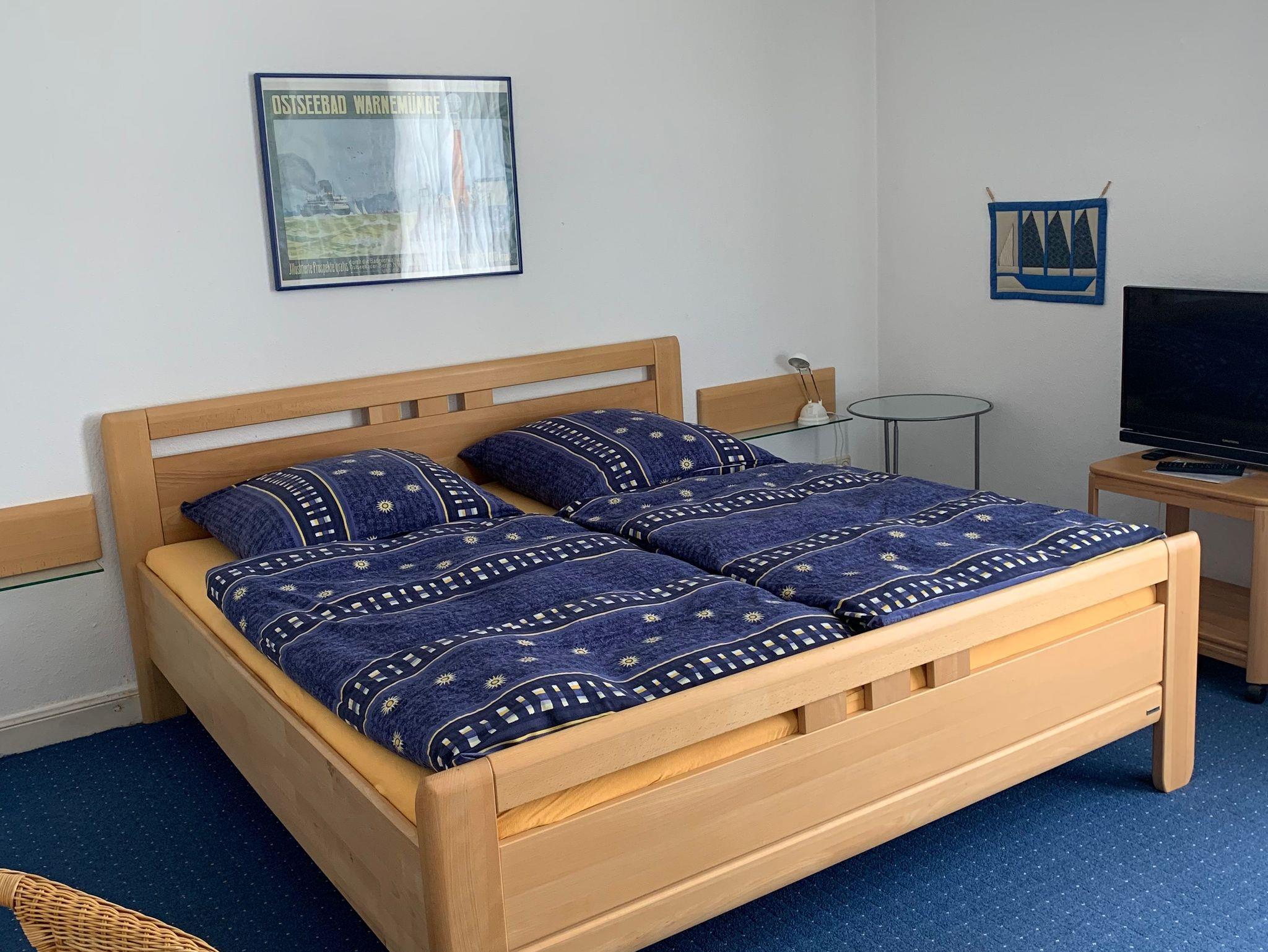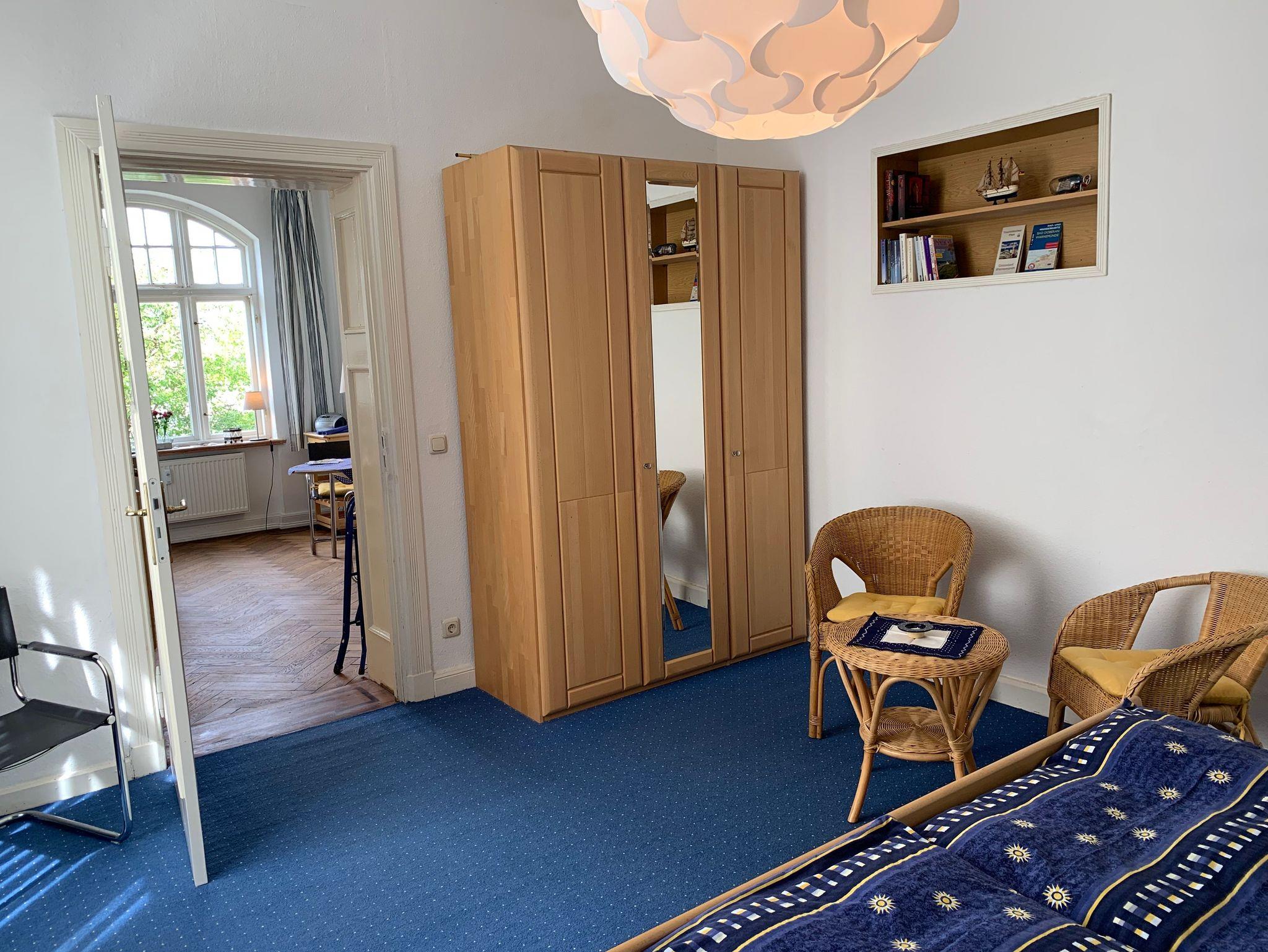 Die Wohnung im EG besitzt einen großzügigen kombinierten Wohn- Schlafraum mit Stuckdecken, maritim in Blautönen gehalten. Doppelbett und Kleiderschrank sind aus allergikerfreundlichem Buchenholz, weiter eine Wohnküche, sowie ein Tageslichtbad. Zur Wohnung gehört ein Sitzbereich im Garten.
