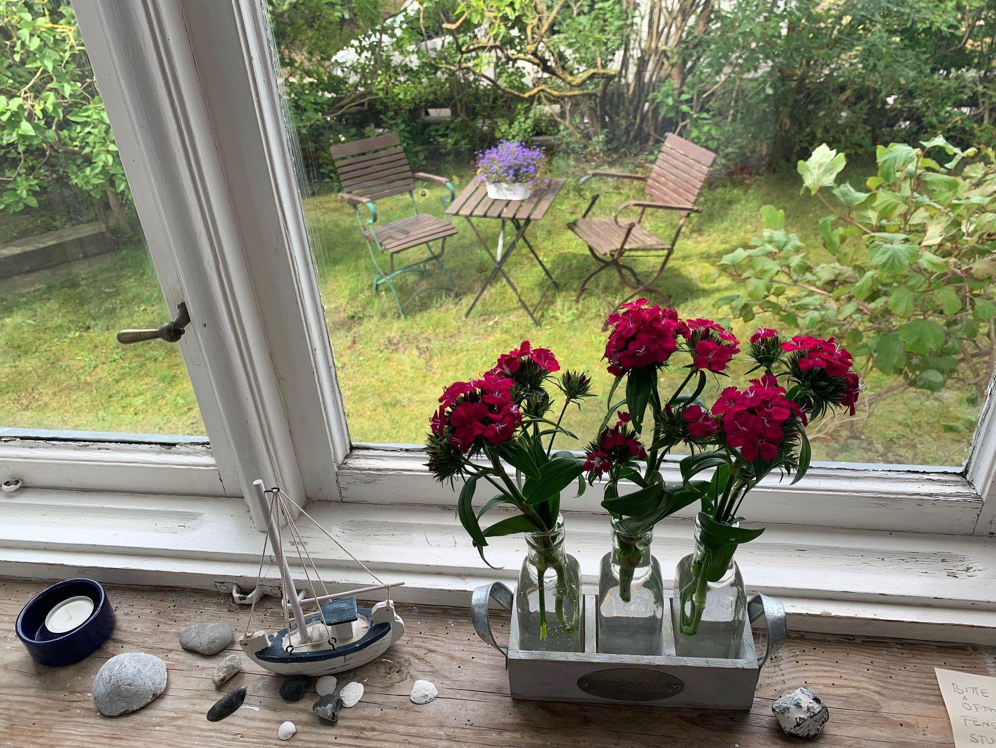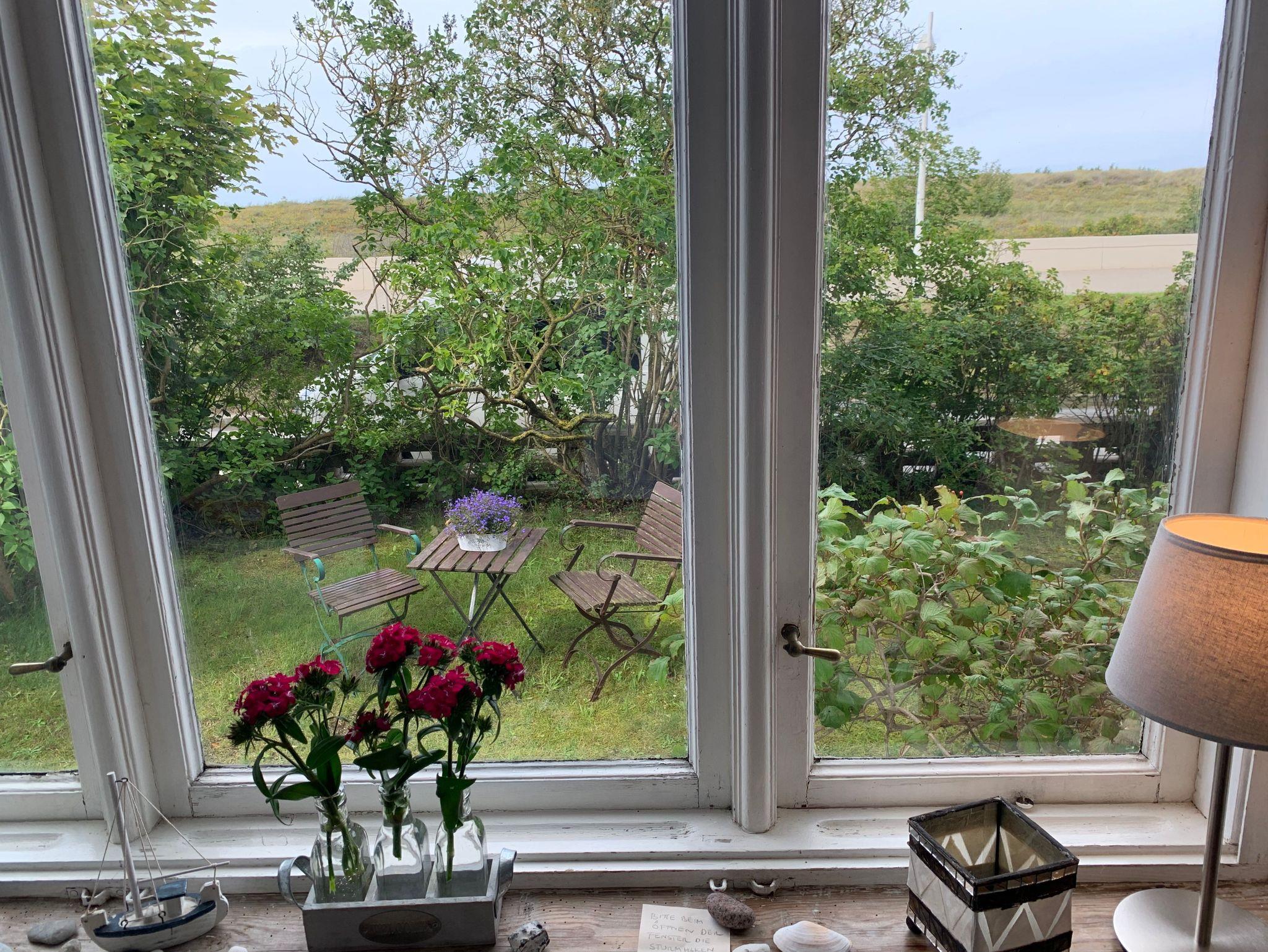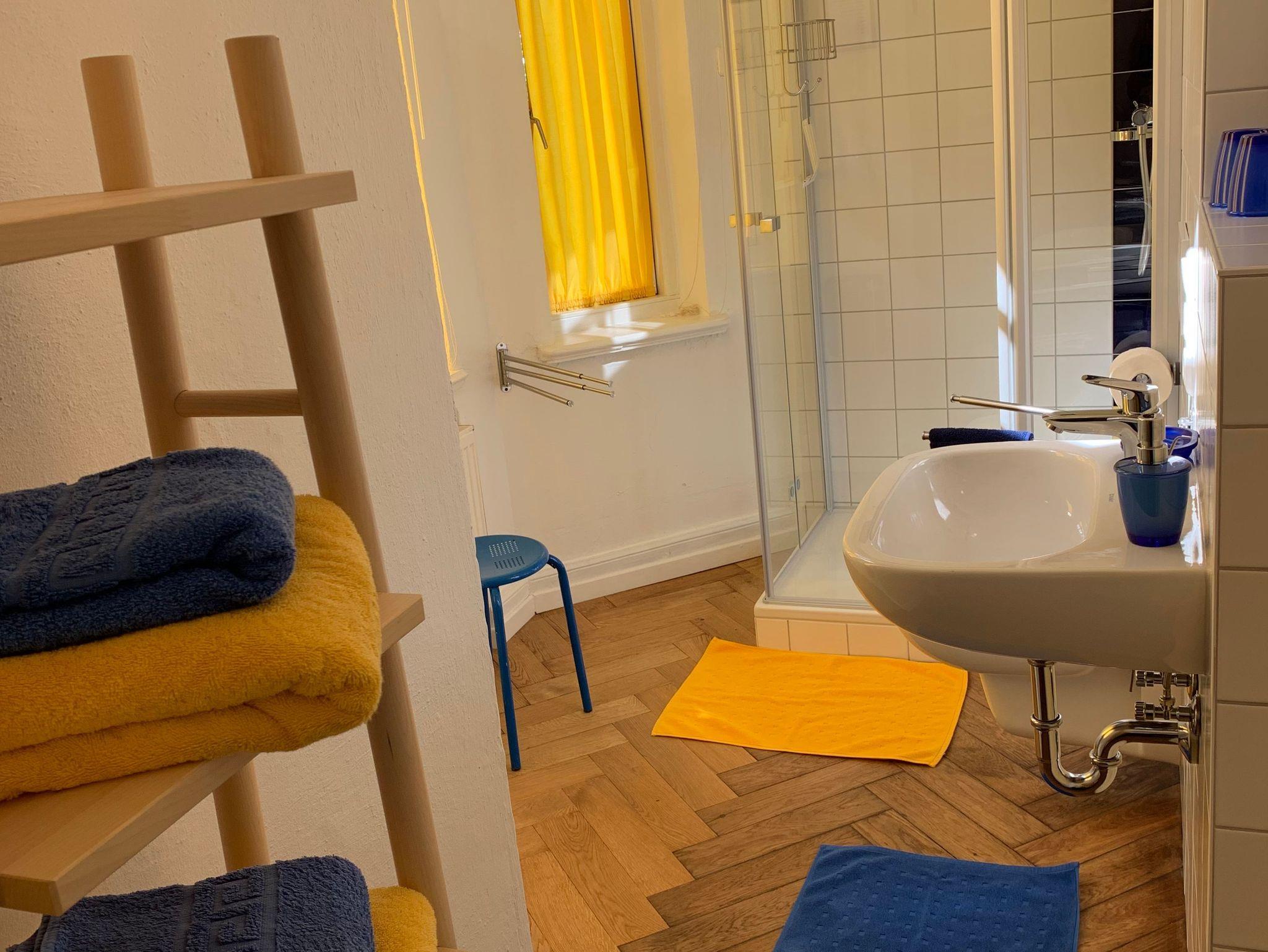Die Wohnung im EG besitzt einen großzügigen kombinierten Wohn- Schlafraum mit Stuckdecken, maritim in Blautönen gehalten. Doppelbett und Kleiderschrank sind aus allergikerfreundlichem Buchenholz, weiter eine Wohnküche, sowie ein Tageslichtbad. Zur Wohnung gehört ein Sitzbereich im Garten.