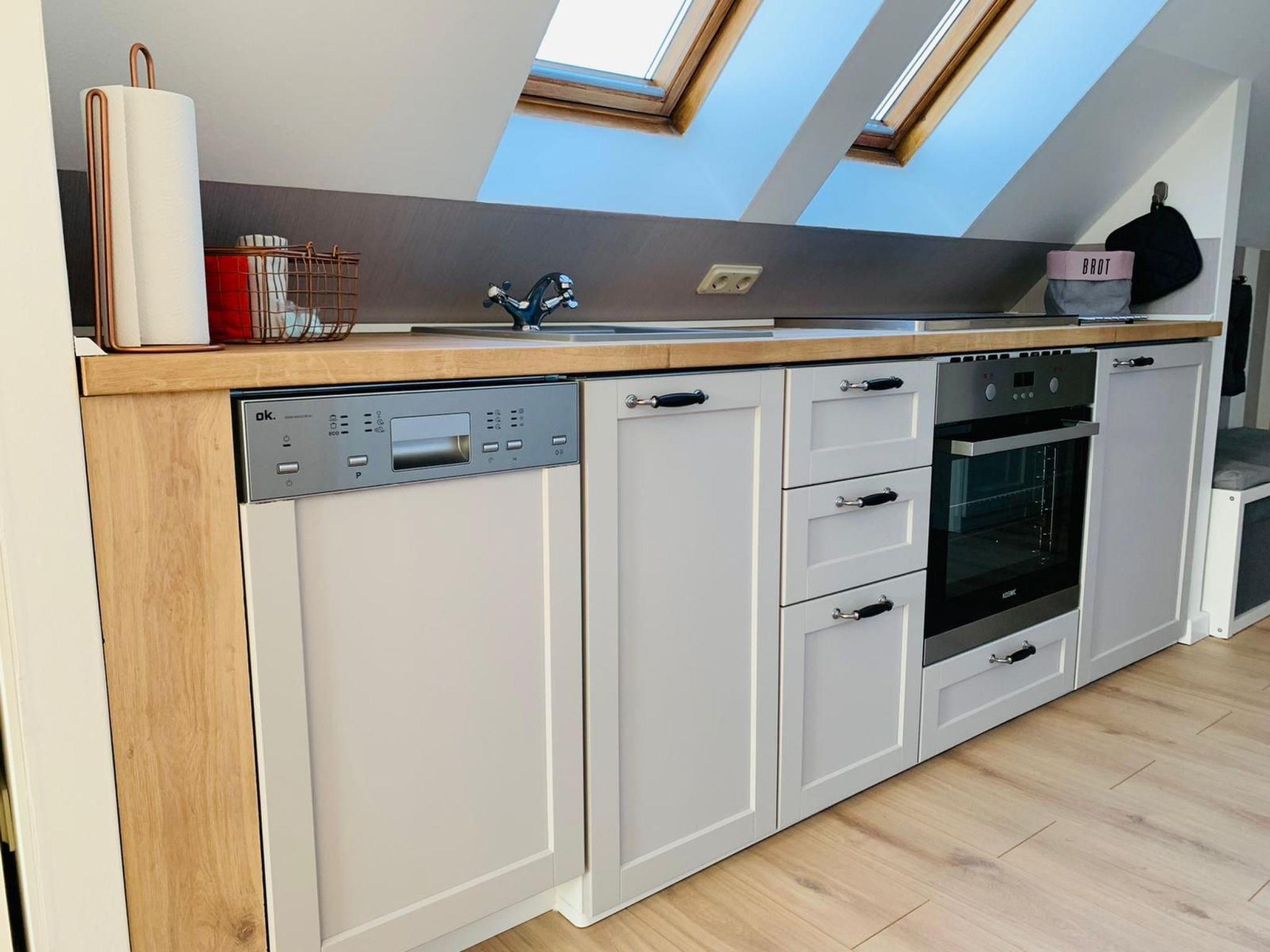Die Küche ist mit Induktionskochfeld, Backofen, Kaffeemaschine (Tchibo Kapseln), Wasserkocher, Toaster Geschirr, Besteck Gläser, Tassen und Geschirrspüler ausgestattet.