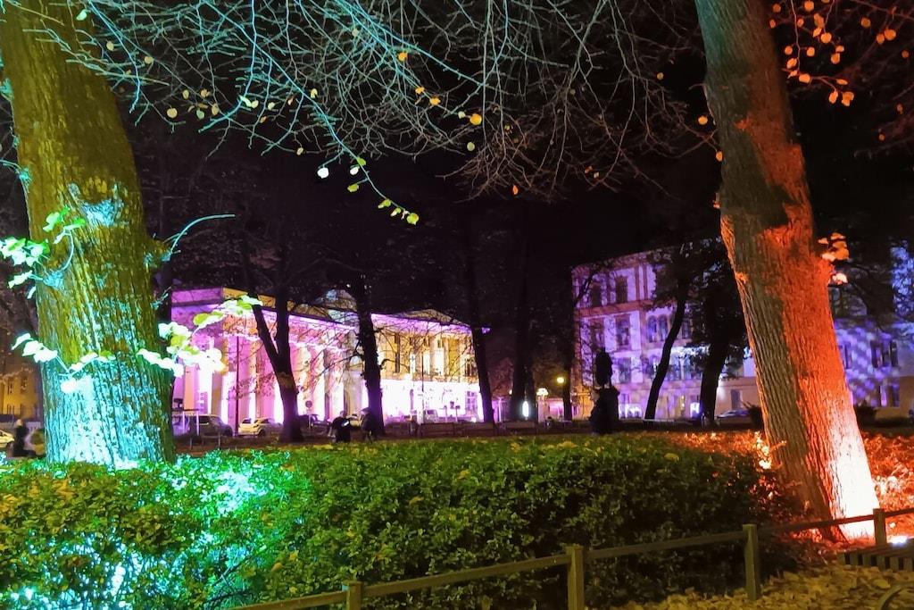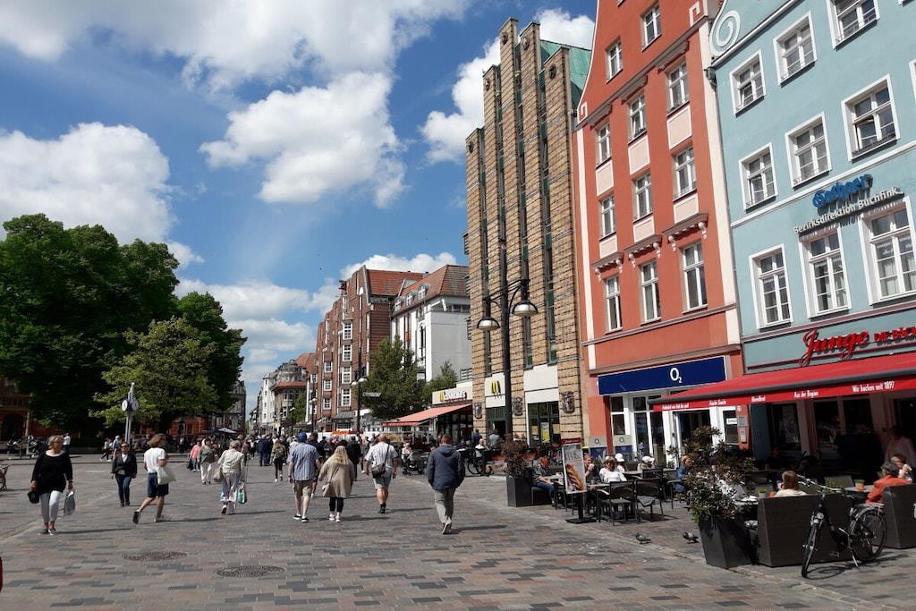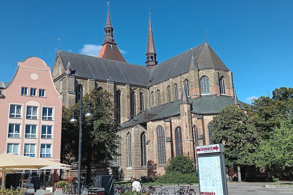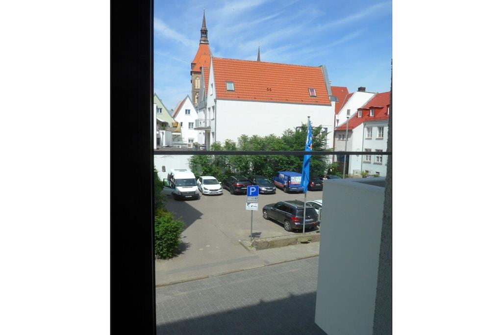 Moderne Stadtwohnung in Rostock mit Garten, Balkon und Blick auf Rathaus und Kirchturm.