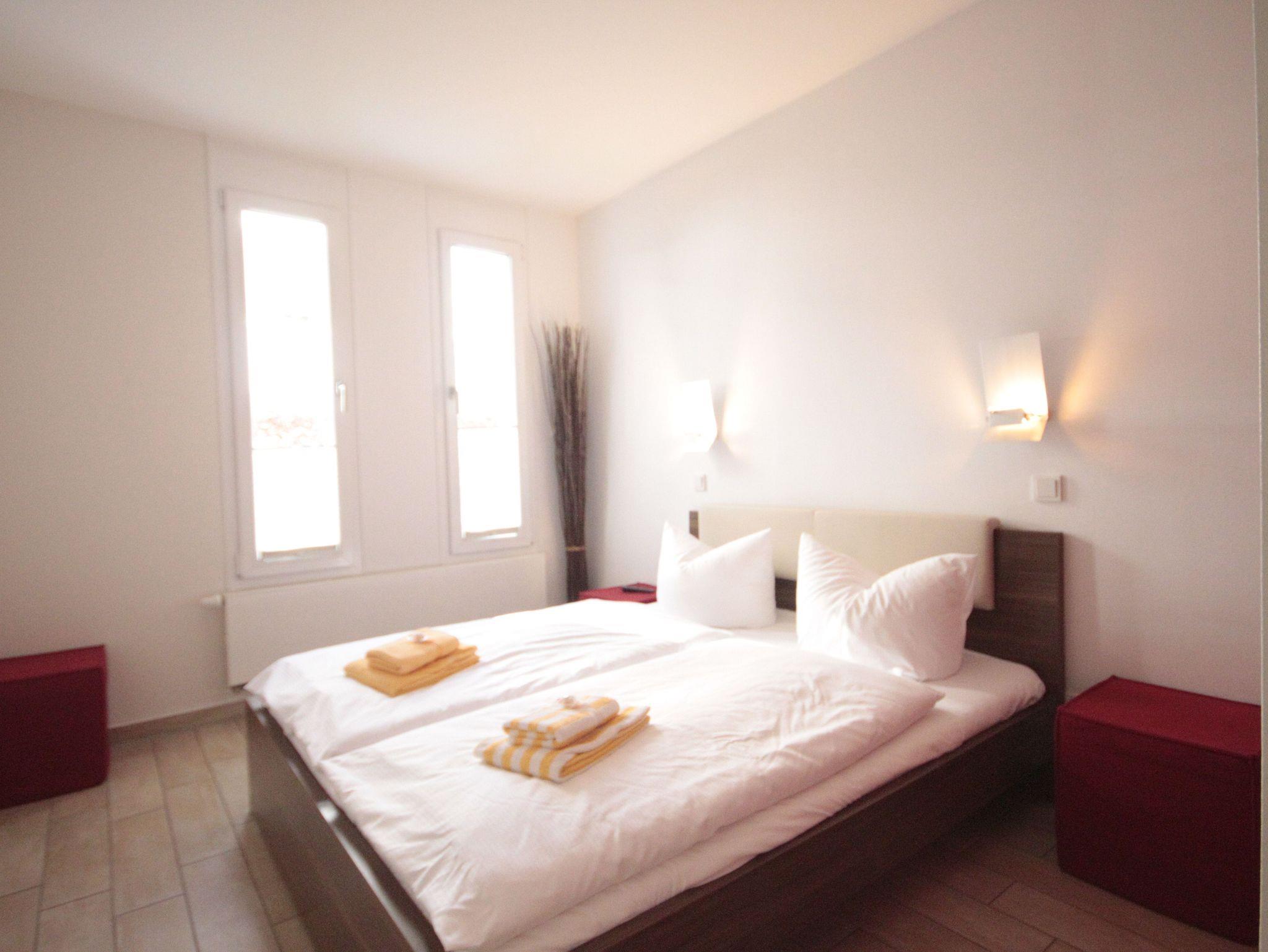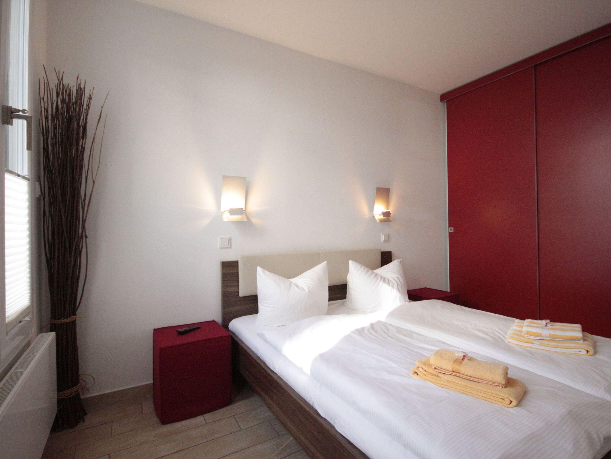 Die Wohnung ist hochwertig und geschmackvoll möbliert, die bodentiefen Fenster geben den Blick in den Kurpark frei. Beide Schlafzimmer haben einen zusätzlichen Fernseher.