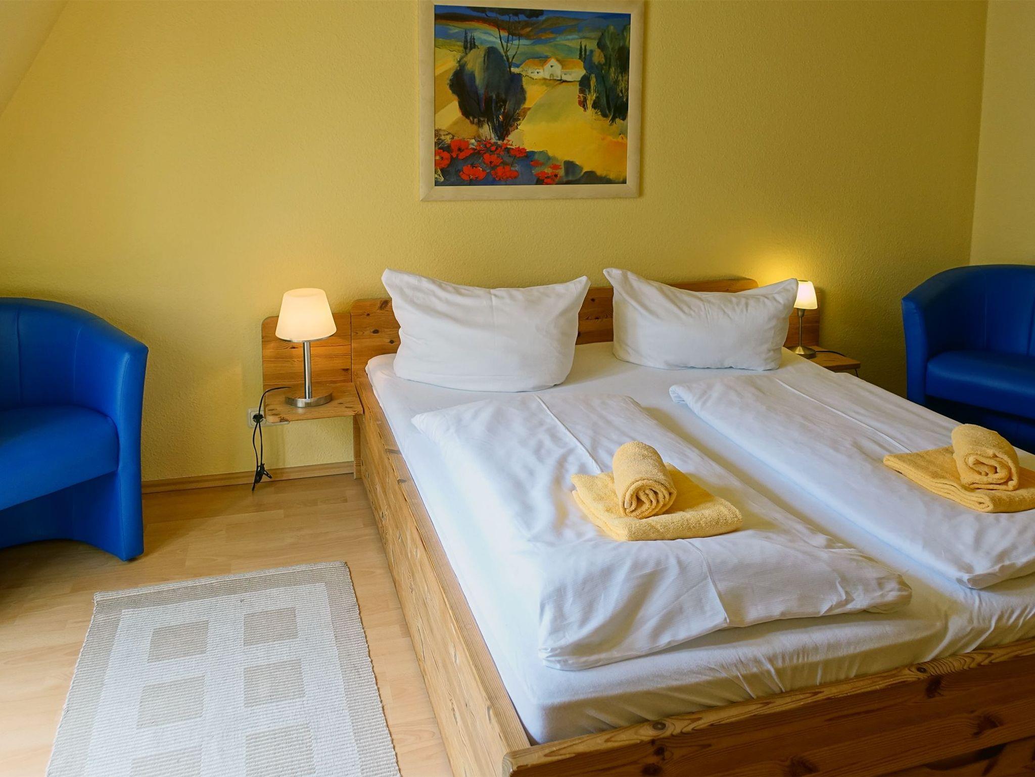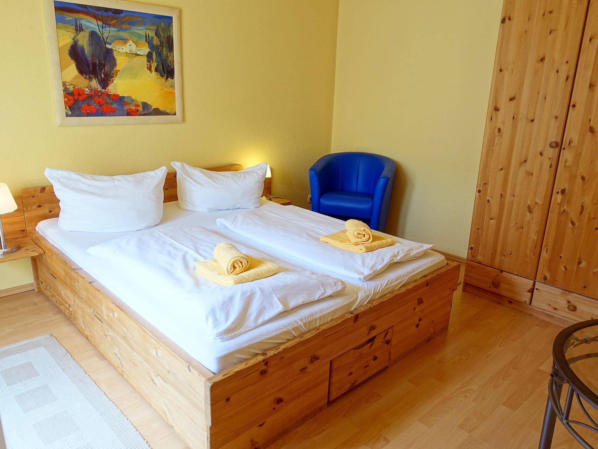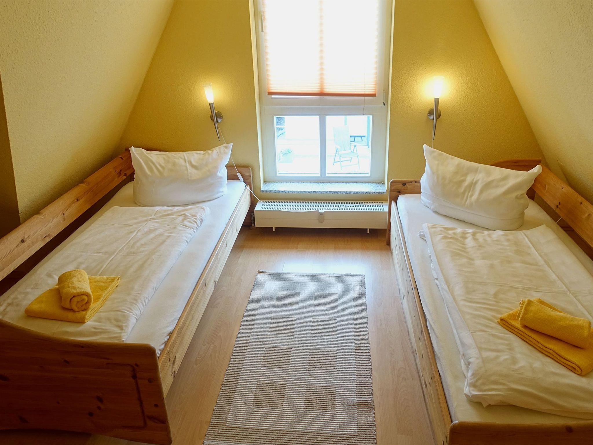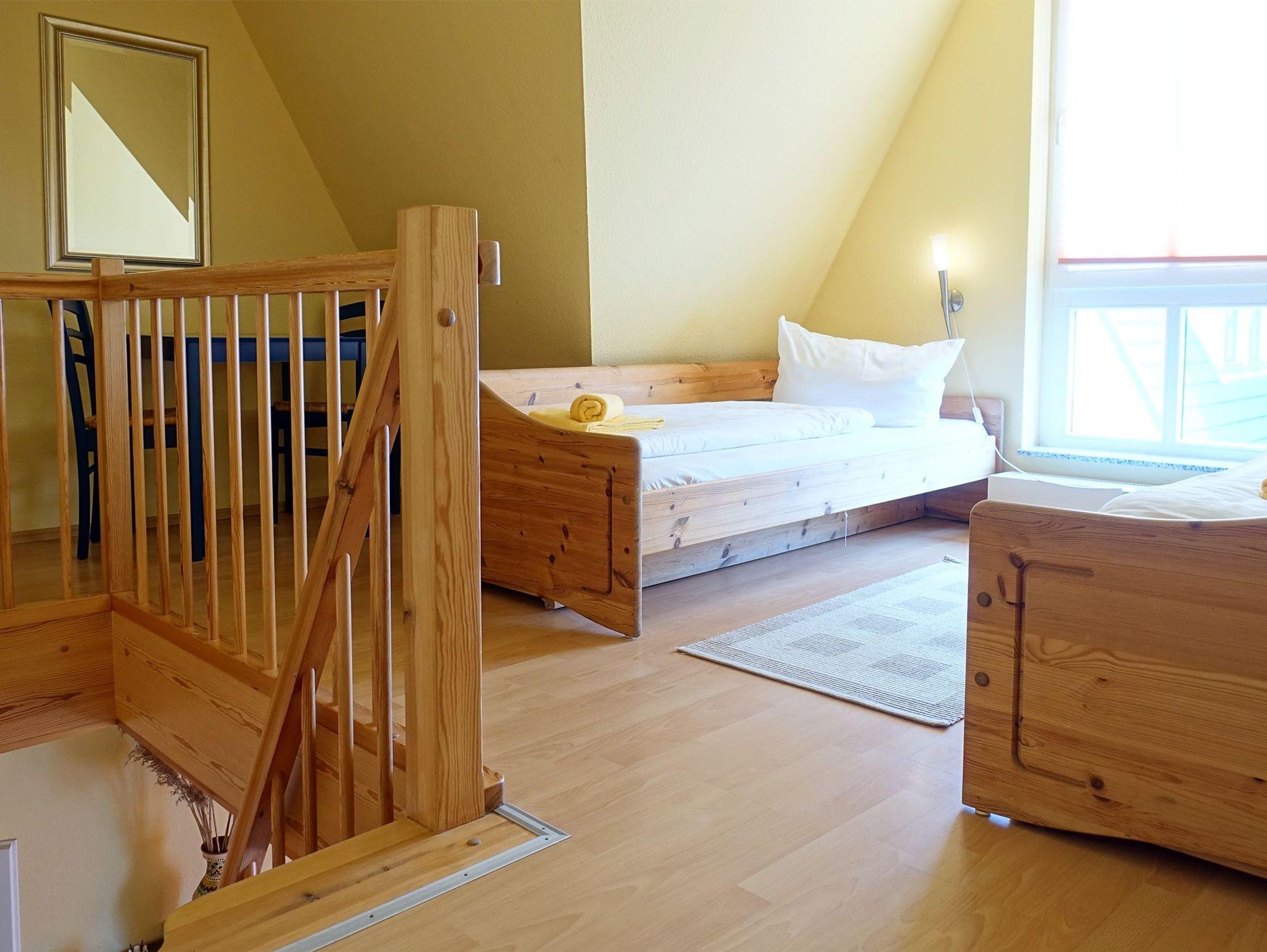Eine Raumspartreppe im Wohnbereich führt zur offenen Galerie im Obergeschoss, wo sich zwei Einzelbetten sowie ein kleiner Tisch mit zwei Stühlen befinden. Ein separates Schlafzimmer mit Doppelbett, in dem ausreichend Platz für ein Babybett ist, befindet sich von der Galerie aus zugänglich.