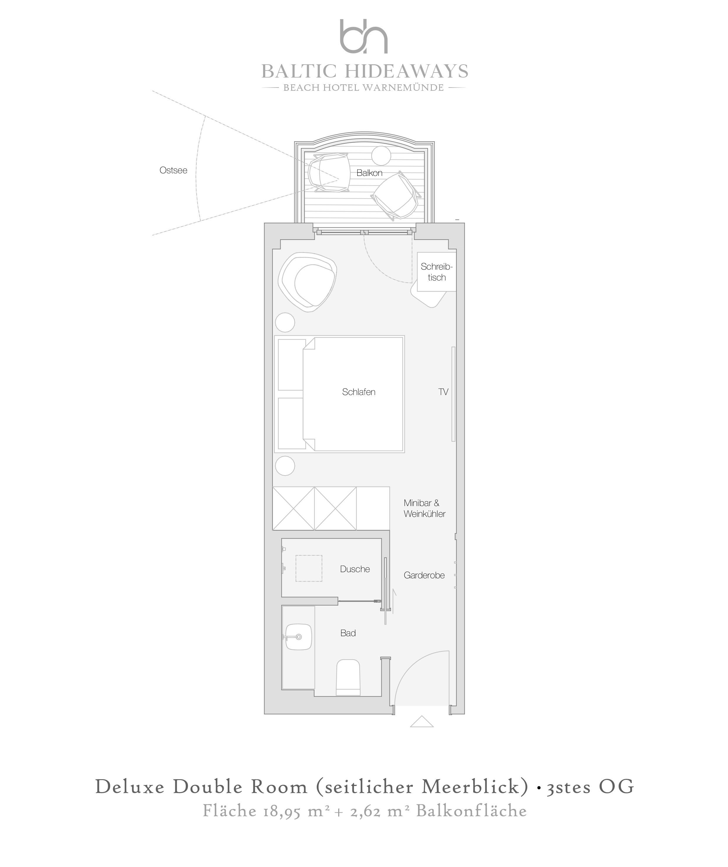 Modernes Doppelzimmer mit Meerblick direkt am Strand von Warnemünde.