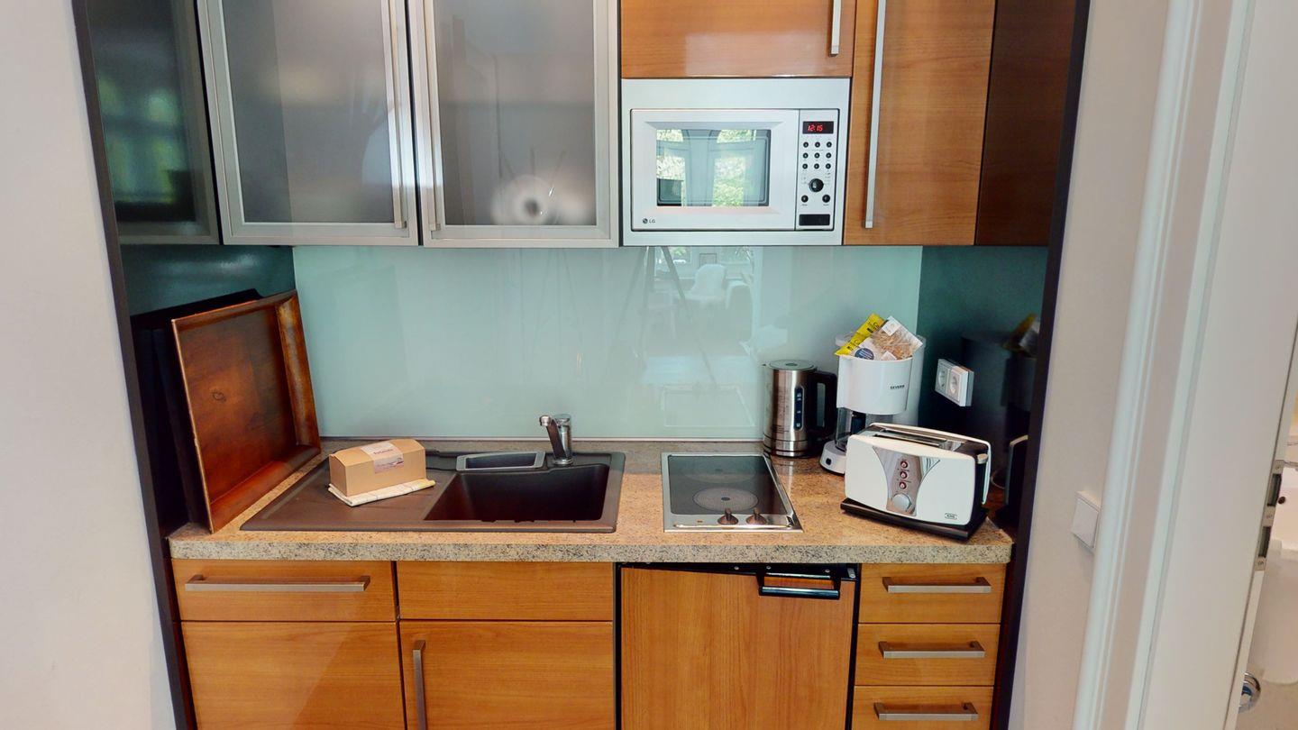 Die Wohnung verfügt über ein kombiniertes Wohn- und Schlafzimmer. Hier können Sie es sich auf dem bequemen Sofa gemütlich machen und den Blick auf den Kurpark genießen. Ein Essbereich sowie eine kleine, gut ausgestattete Küchenzeile sind ebenfalls vorhanden. Das moderne Badezimmer verfügt über eine Dusche, ein Waschbecken und eine Toilette.