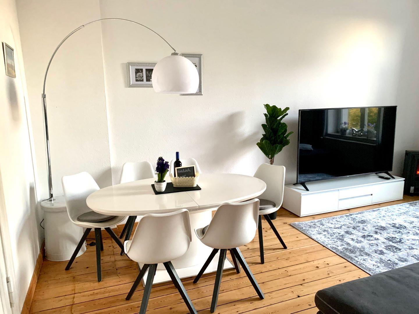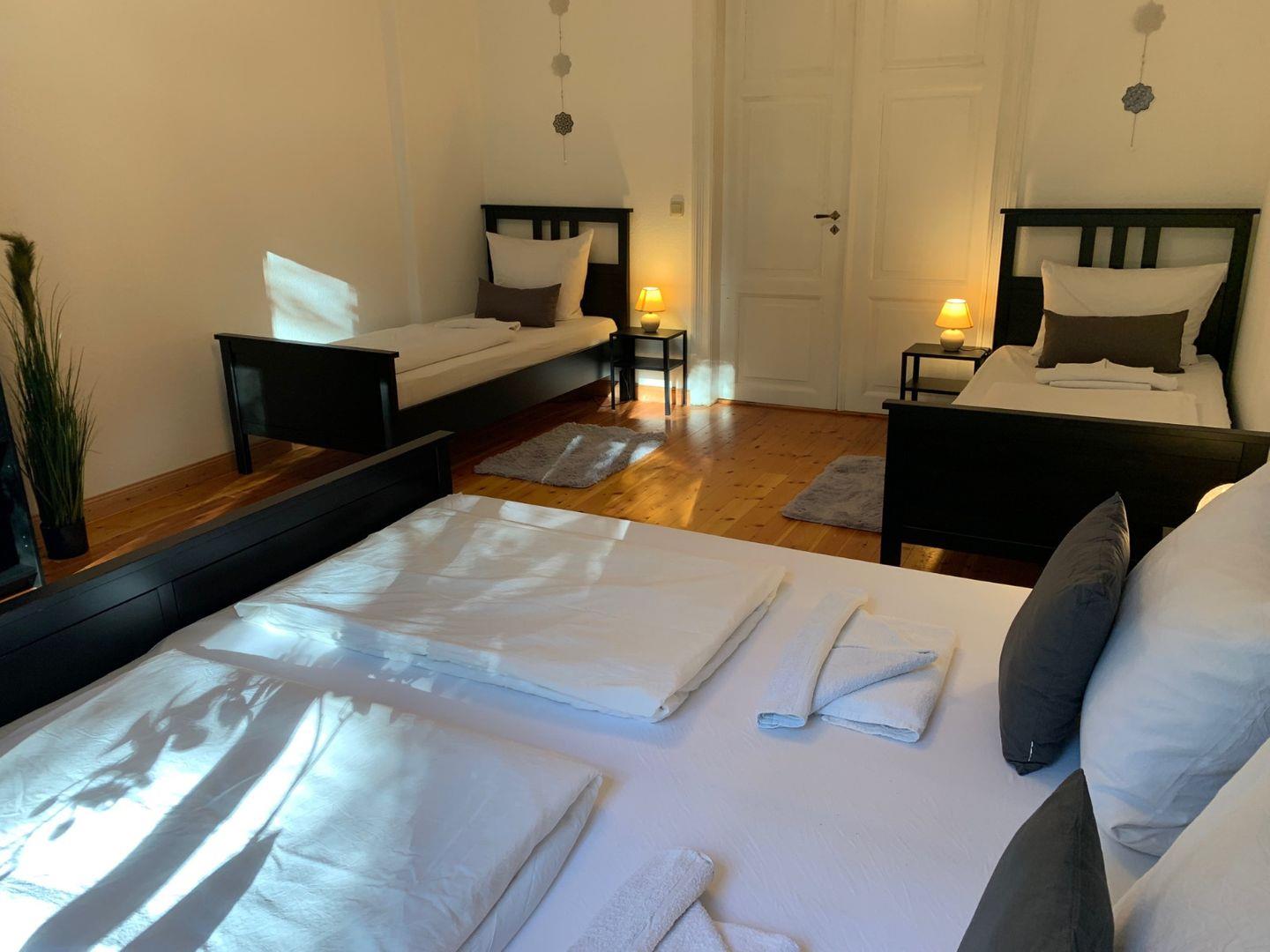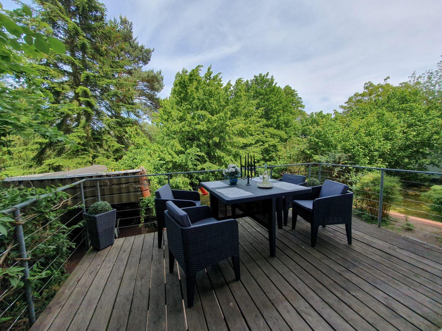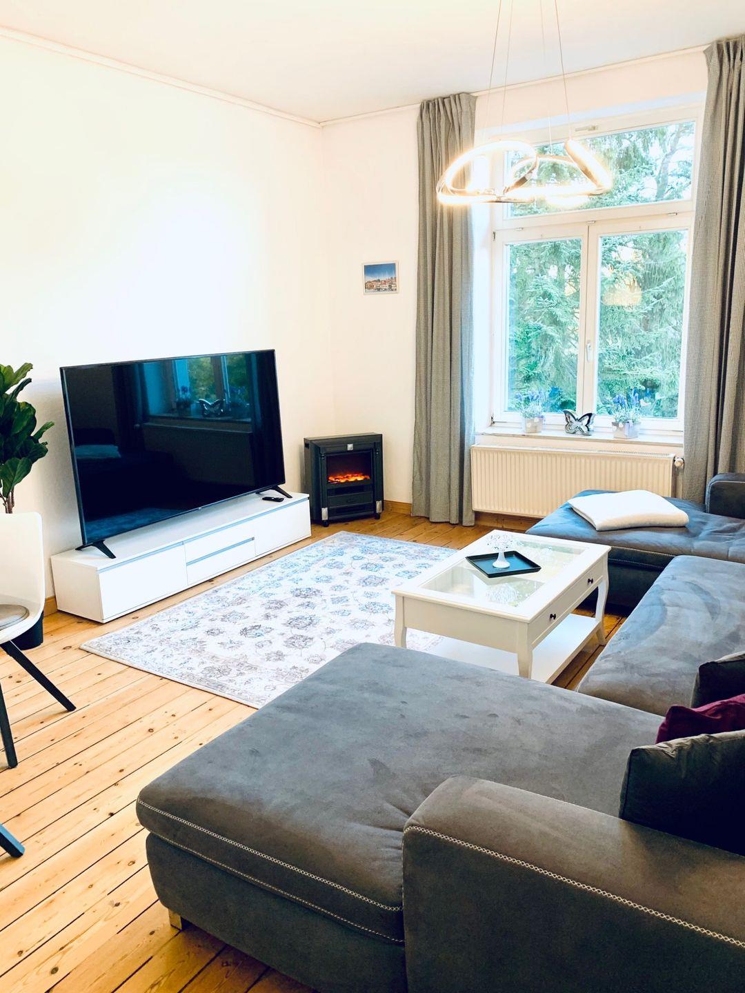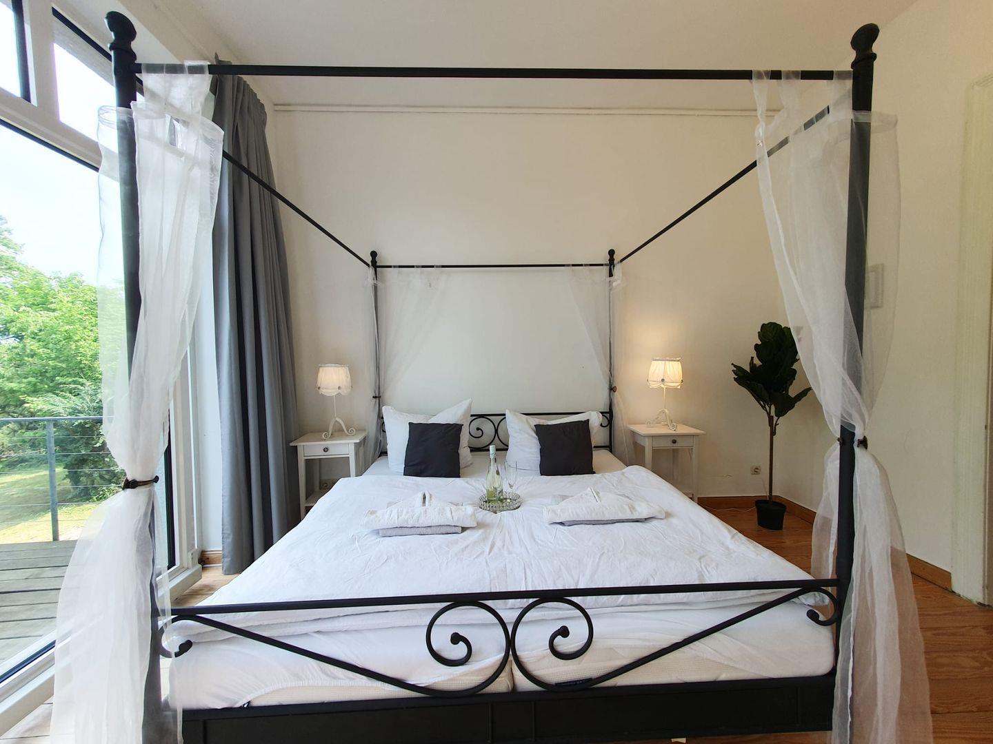 Über das große Treppenhaus gelangt man in die Hochparterre Wohnung. Die großzügig geschnittene Wohneinheit hat 150qm. Das luxuriöses Wohnzimmer mit einer großen Couch einem großen 75Zoll-Smart-TV mit Streamingdiensten, Kamin und einem Schlafsessel. Im Schlafzimmer finden Sie ein Himmelbett sowie einen wieteren Schlafsessel und einen eigenen großen möblierten Balkon mit Blick in den weitläufigen Garten.Weiterhin befindet sich ein kleines Schlafzimmer in der Einheit. Hier steht ein Etagenbett bereit. Das Badezimmer ist sehr großzügig geschnitten mit Eckbadewanne.