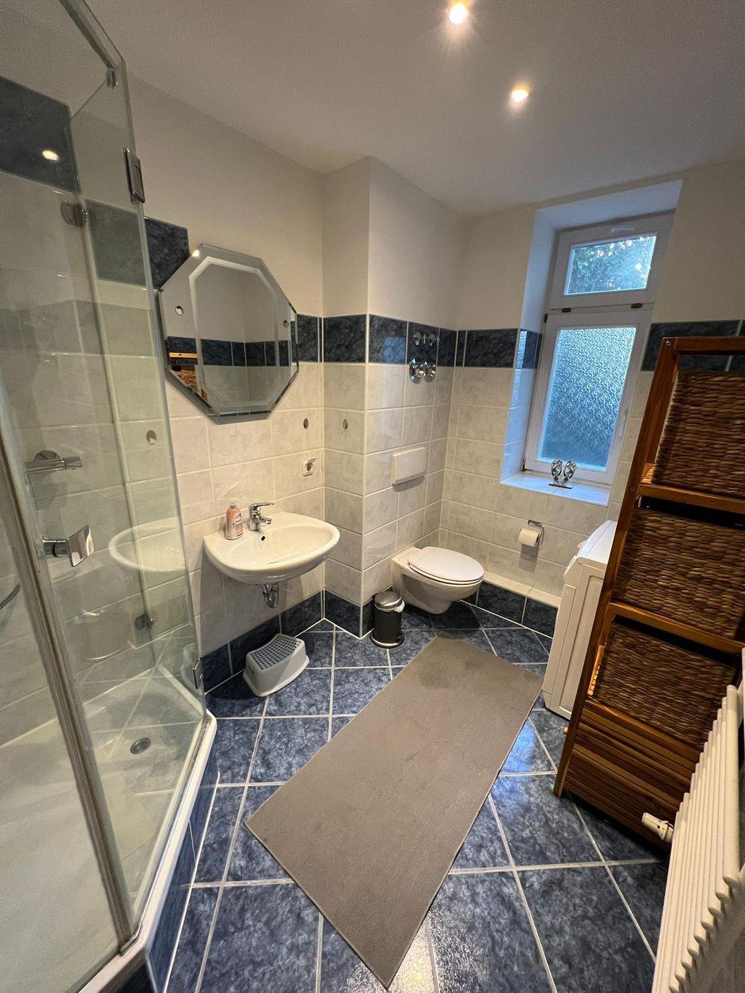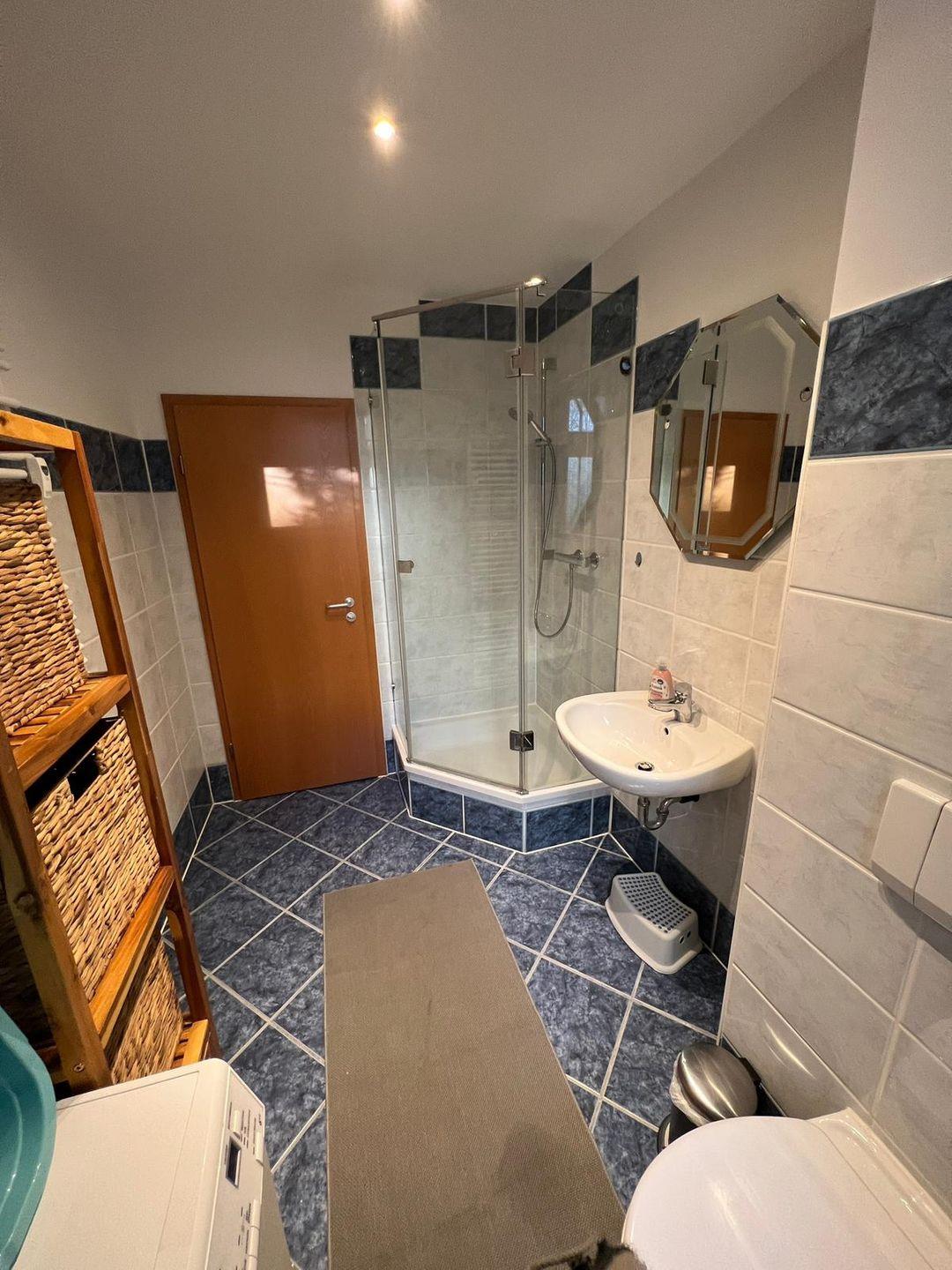 Das Badezimmer mit Tageslicht ist hell. Die Waschmaschine sowie ein Ablageregal für Ihre Waschsachen stehen hier. Das Bad verfügt über ein WC und eine Dusche.