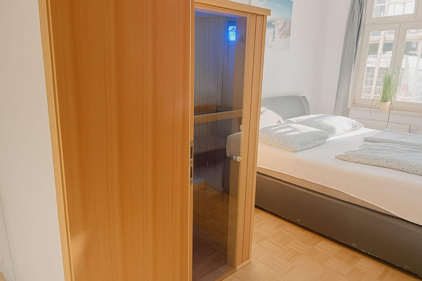 Die komfortabel und gemütlich eingerichtete Wohnung mit Infrarot-Sauna befindet sich im Erdgeschoss eines Mehrfamilienhauses.