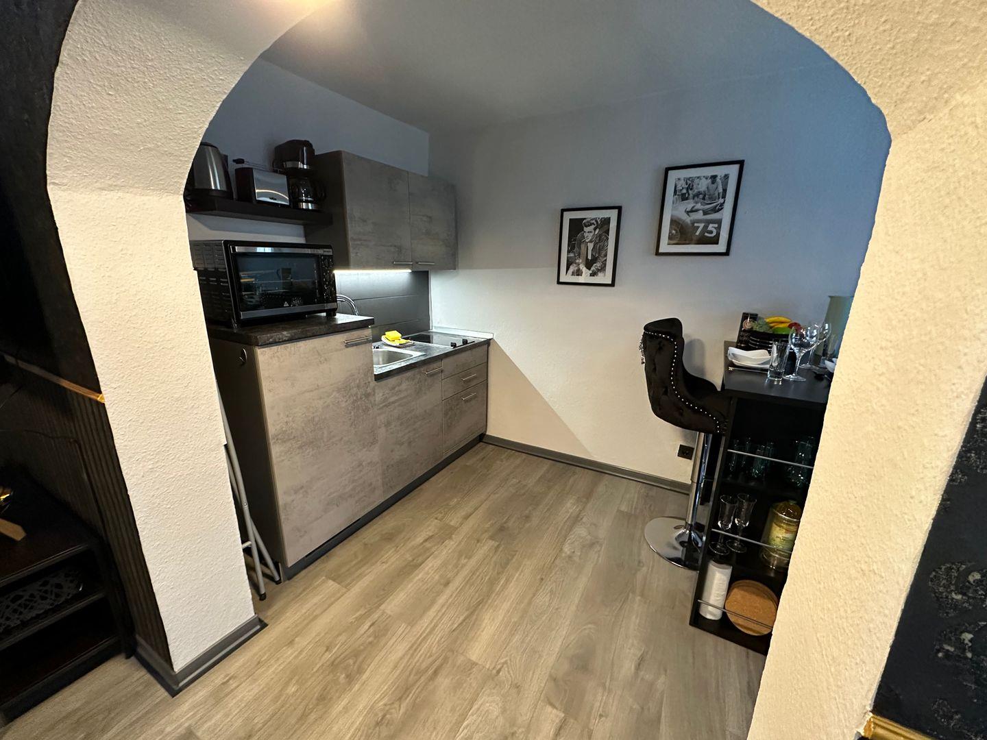 Die offene Küche zum Wohnzimmer ist voll ausgestattet und verfügt über alle Utensilien für einen angenehmen Aufenthalt: Herd mit zwei Elektro-Platten, Backofen, Kühlschrank, Spülmaschine, Kaffeemaschine, Wasserkocher, Toaster, Gewürze sowie Geschirr, Besteck und Geschirrhandtücher sind vorhanden. Ein gemütlicher Essbereich mit Esstisch lädt zu gemeinsamen Mahlzeiten ein.