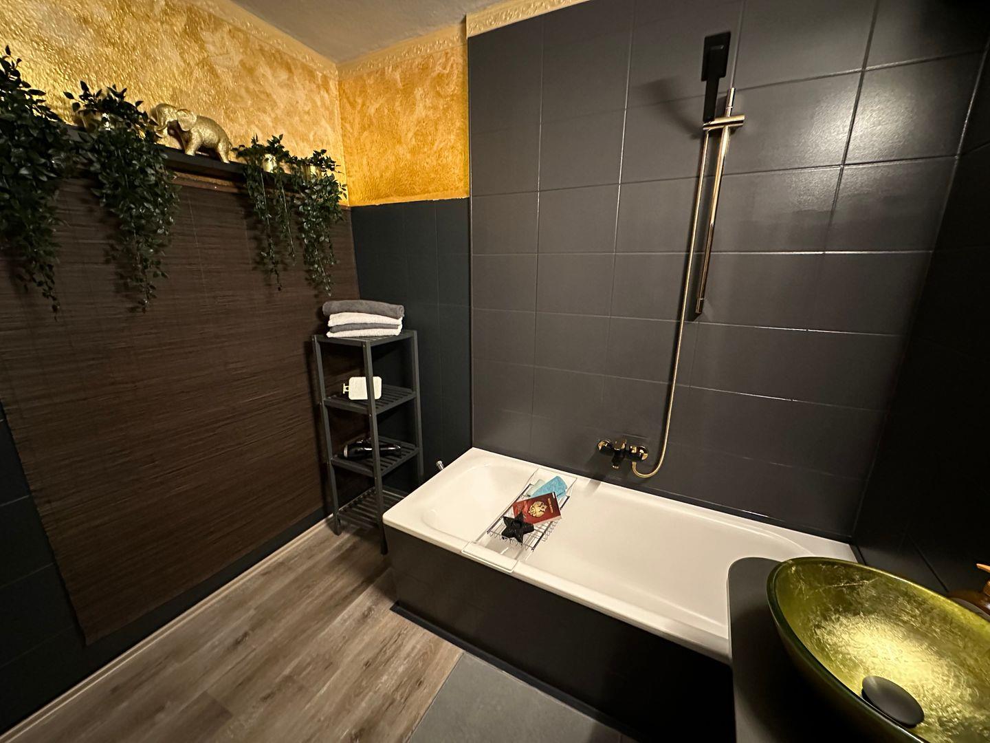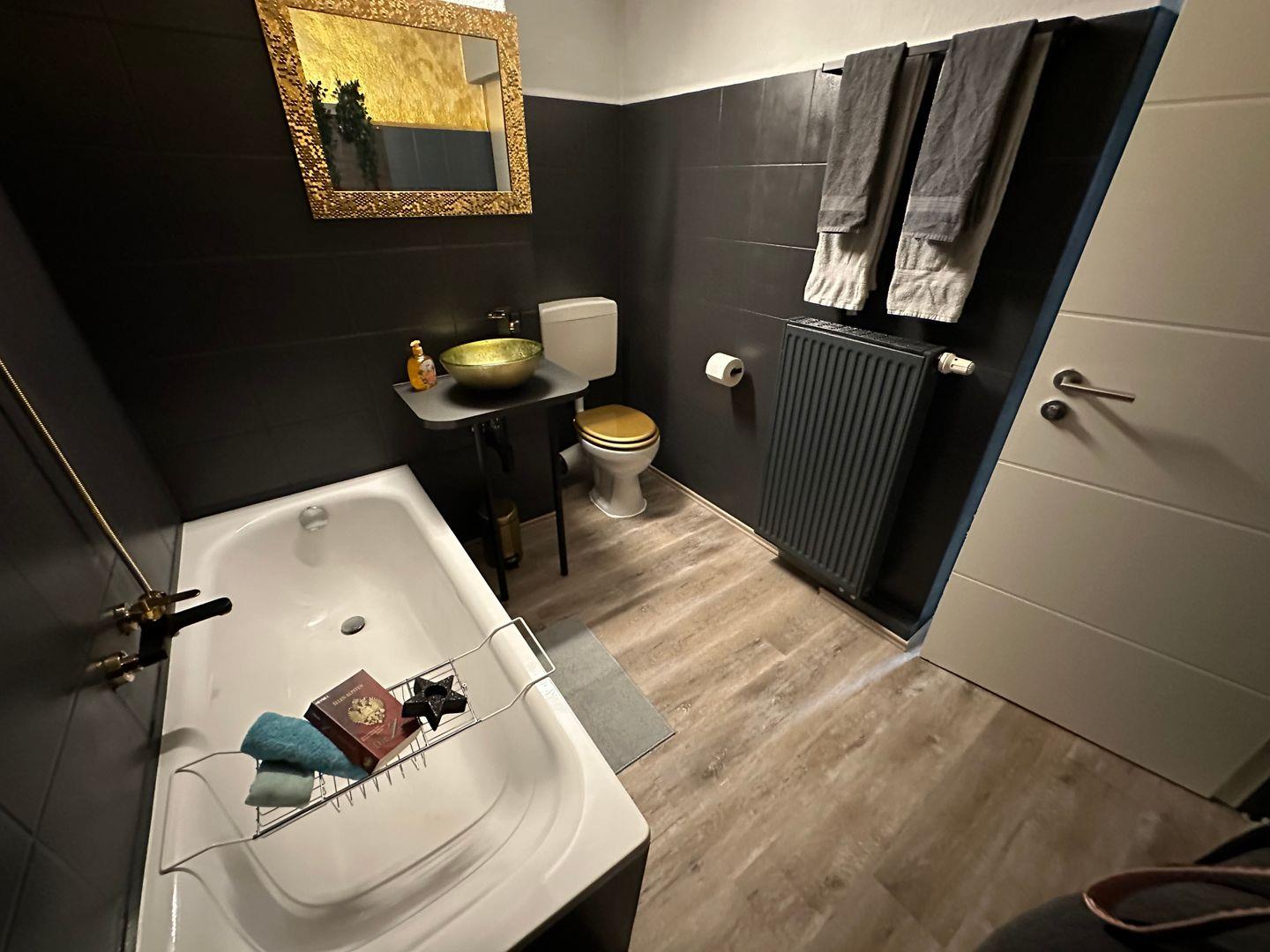 Das Badezimmer verfügt über eine Badewanne, WC, Waschbecken, Haartrockner, Kosmetikspiegel und alle notwendigen Badartikel wie Seife. Waschmaschine, Bügeleisen, Bügelbrett, Staubsauger und Reinigungsmittel stehen zur Eigennutzung zur Verfügung.