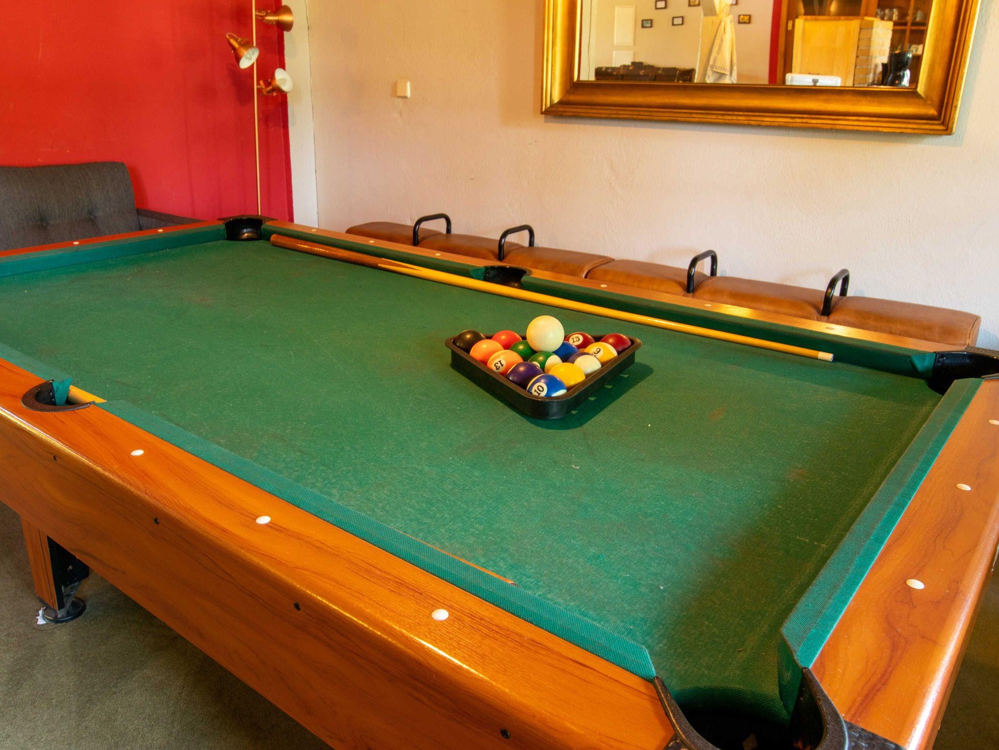 Die 270m² große Ferienwohnung besteht im Erdgeschoss aus einem großen Wohnbereich mit offener Kochinsel, einer großen Speisetafel, 2 kleineren Essecken, einem Billardbereich, einer gemütlichen Sitzecke am Bullerjan-Ofen sowie 2 Bädern, jeweils mit Dusche und WC. Aber es gibt kein TV.