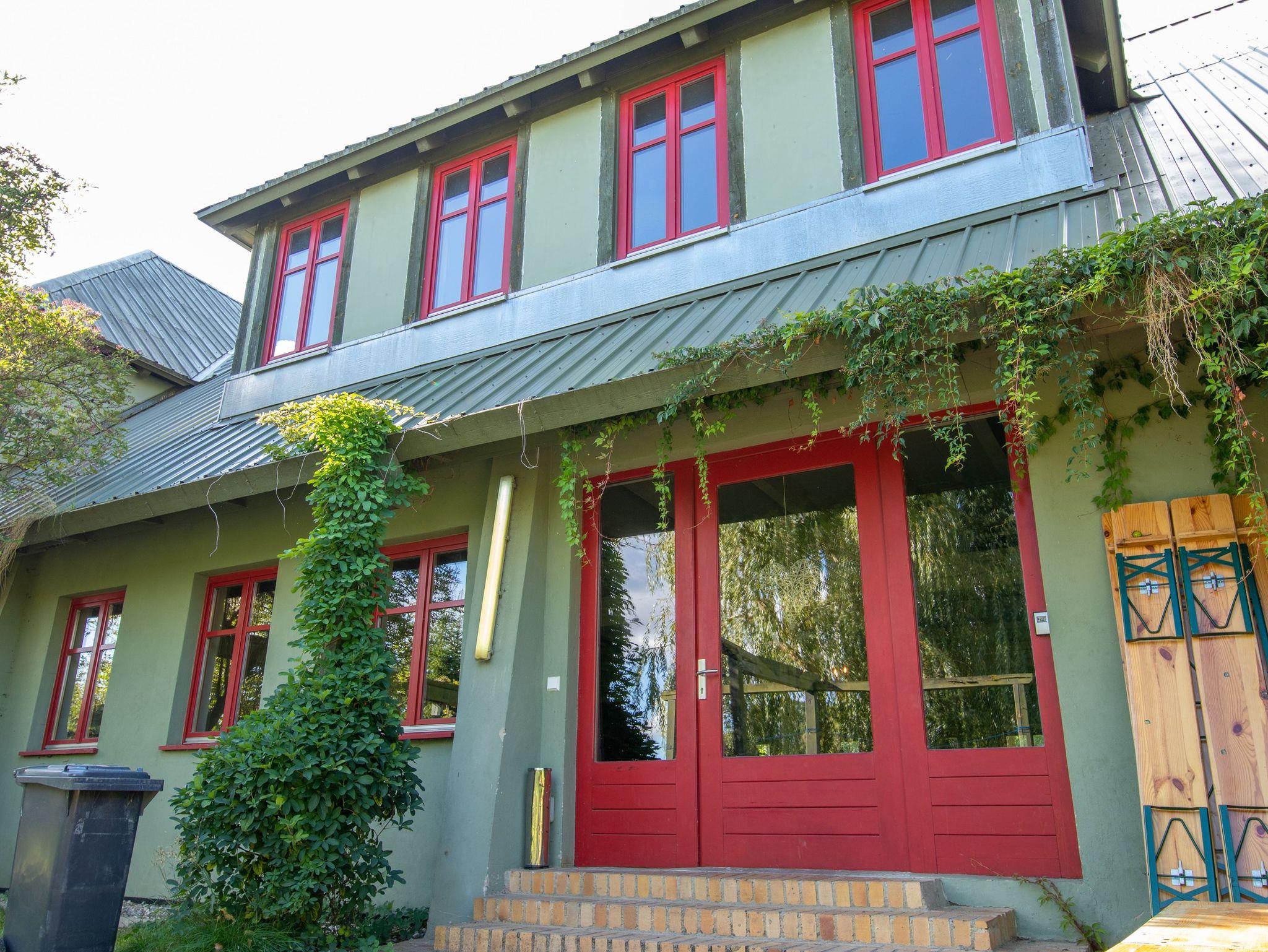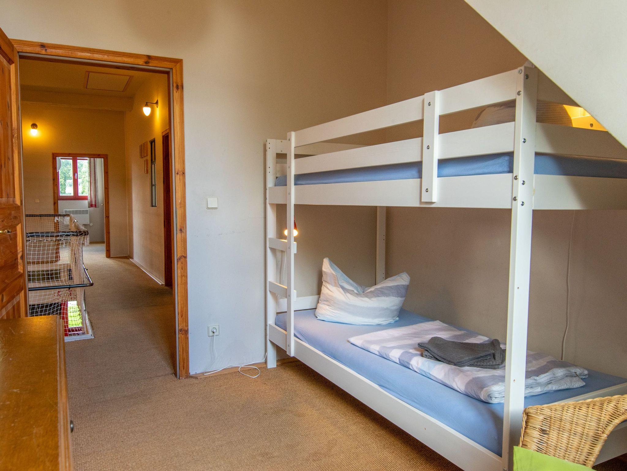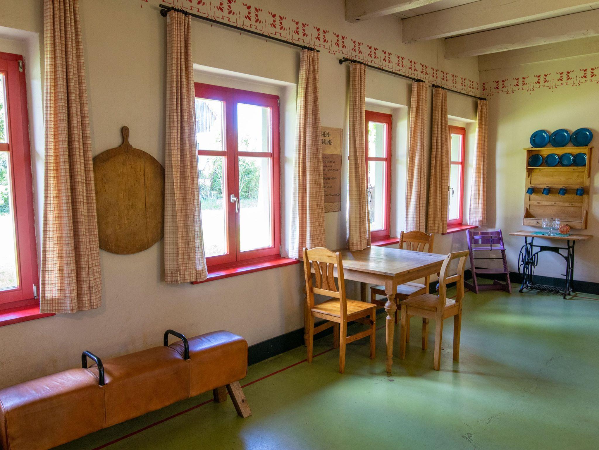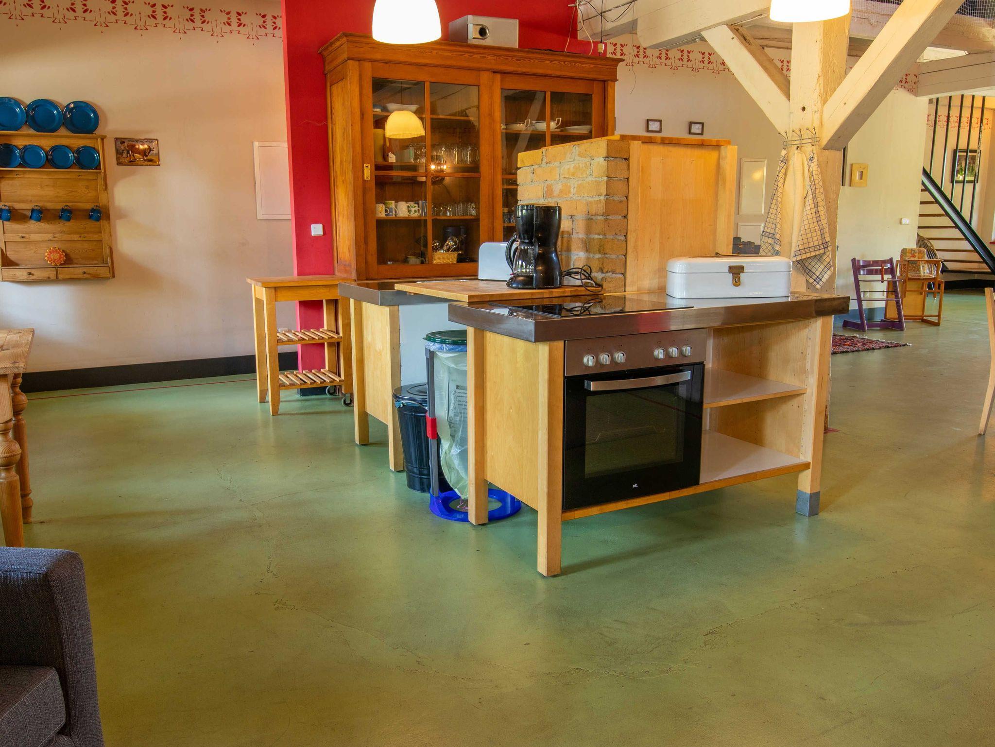 Die 270m² große Ferienwohnung befindet sich im mittleren Teil eines großen Wohnhauses in ruhiger Dorflage und bietet bis zu 20 Gästen Schlafplätze. Im Erdgeschoss befindet sich ein offener Wohn-Essbereich mit einem großzügigen Esstisch in der Mitte. Zum offenen Konzept gehören des weiteren eine Kücheninsel, ein Billardtisch, ein Bullerjan-Ofen, sowie verschiedene Sofas und kleinere Esstischen. Zusätzlich befinden sich zwei Badezimmer mit Dusche im Erdgeschoss und ein Badezimmer im Obergeschoss. Alle 5 Schlafzimmer liegen im Obergeschoss und sind mit Doppelbetten oder Etagenbetten ausgestattet. Die Ferienwohnung ist einfach und teilweise im Stil der vorletzten Jahrhunderwende möbliert. Es gibt viele liebevolle Details. Vor dem Haus steht ein gemeinschaftlich genutzter Garten mit einem Naturteich und einer Feuerstelle zur Verfügung.