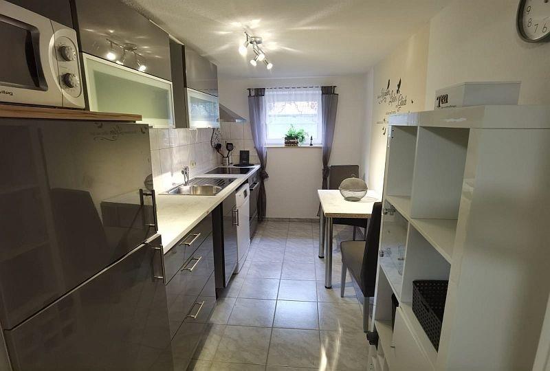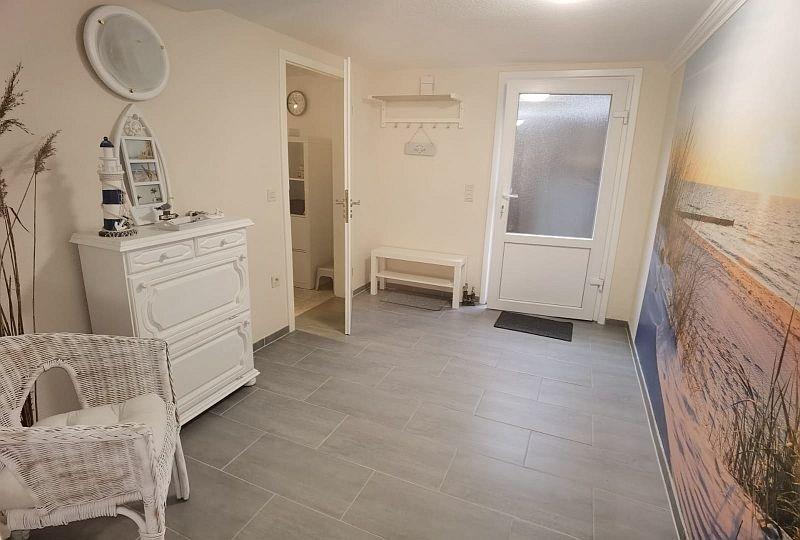 Im kleinen Vorflur ist rechts die Küche mit Kaffeemaschine, Wasserkocher, Ceranfeld, Backofen, Kühl- und Gefrierkombi, Mikrowelle, Geschirrspülmaschine. Auch eine kleine Sitzecke mit zwei Stühlen ist hier vorhanden. Durch den größeren Flur gelangen Sie in das helle Bad mit Fenster und Dusche (Einstieg etwa 15 cm Höhe), ein Spiegel mit Ablage und Fön sind vorhanden.