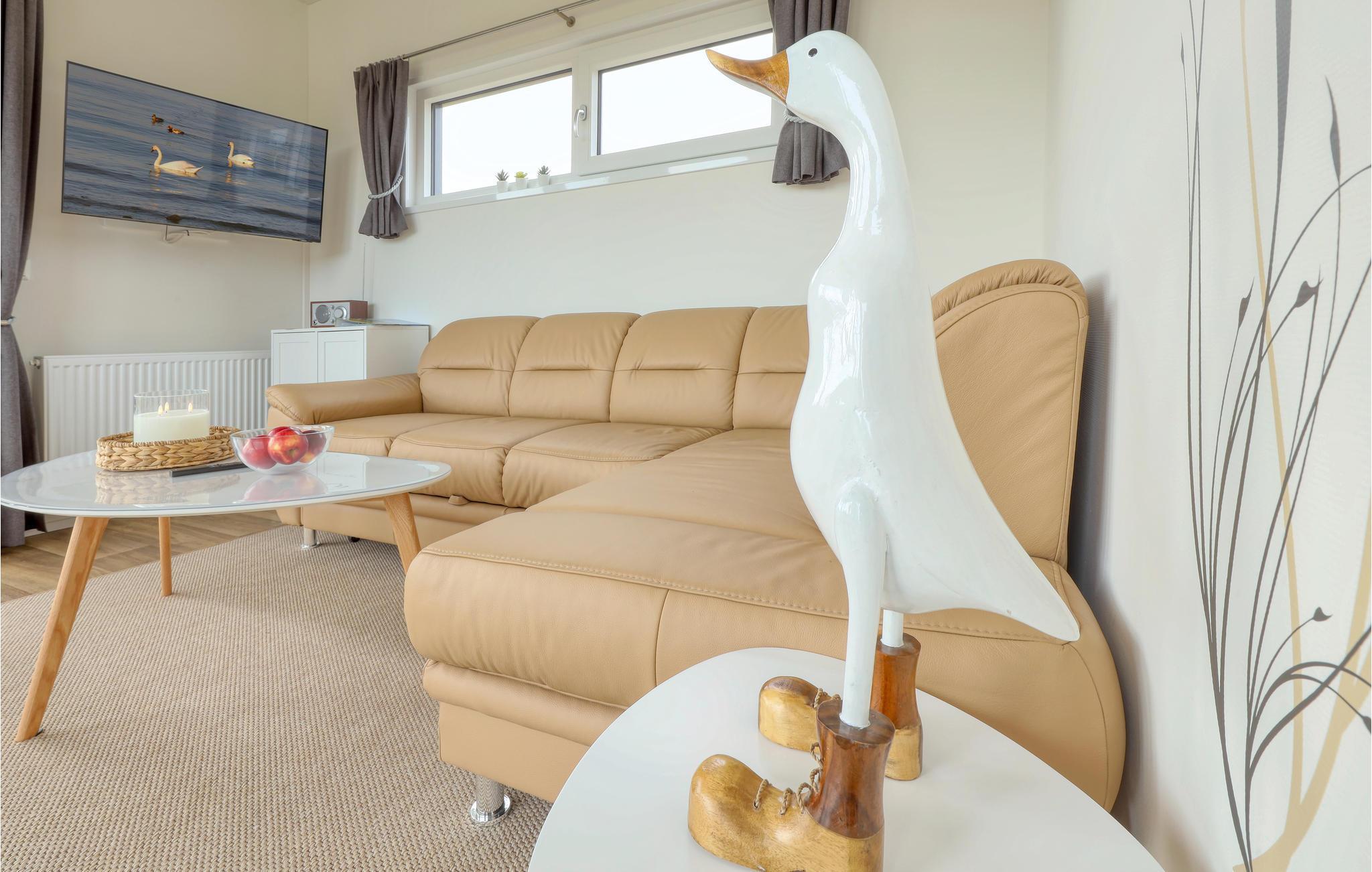 An allen Fenstern des Chalets finden sich Rolläden bzw. Plissees. Im Wohnbereich können Sie es sich auf dem hochwertigen Ledersofa bequem machen.